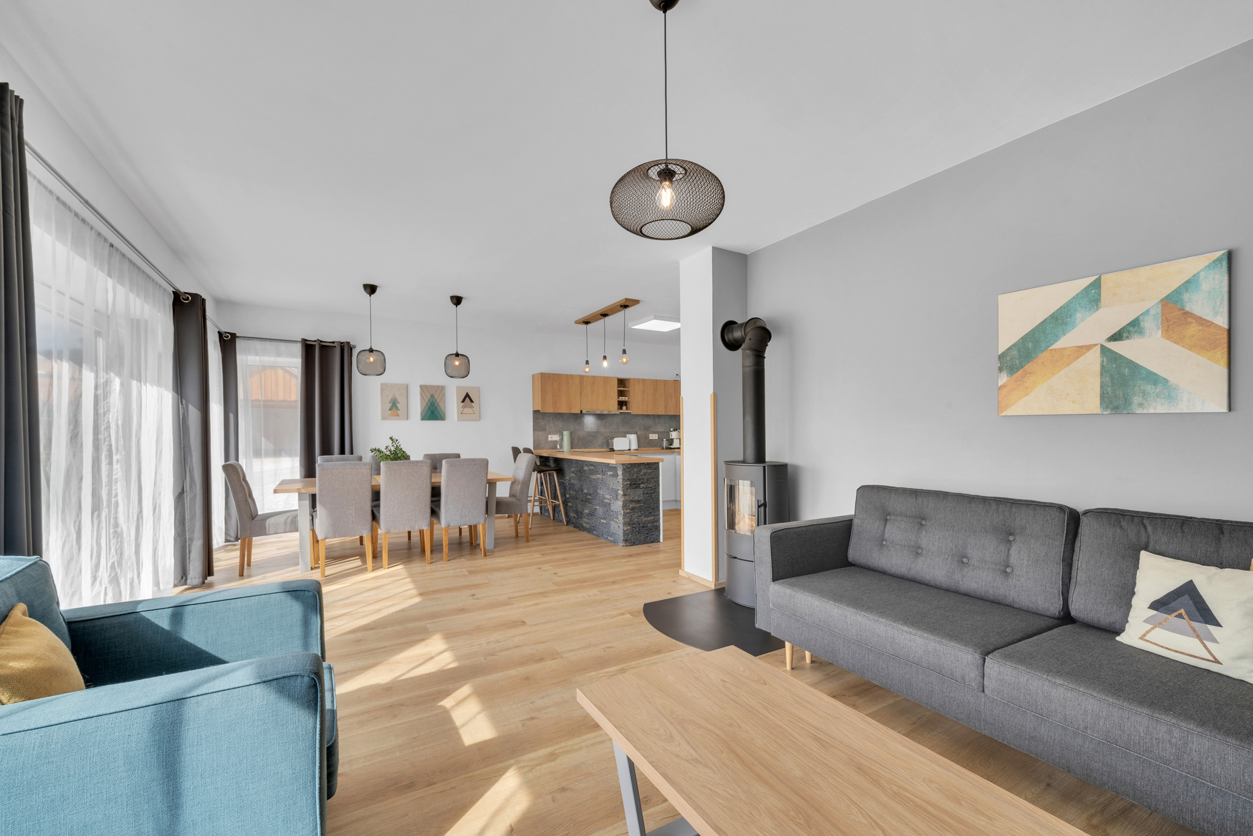 The apartment is bright, modern, and cozy. It features three bedrooms: two with double beds and one with two single beds and a sofa bed. The spacious kitchen is fully equipped, allowing you to cook your meals and enjoy them in the dining area. The living room is a cozy place with a fireplace, ideal for relaxing after an active day in the mountains.