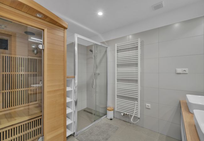 On the ground floor, you'll find an infrared sauna, a luxurious addition for your well-being, and a bathroom with a shower. The second bathroom is located upstairs and includes a shower, toilet, bidet, and two sinks. Thanks to underfloor heating, the apartment is always comfortably warm, regardless of the season. Additionally, there is a practical storage space for skis, hiking shoes, and other equipment.