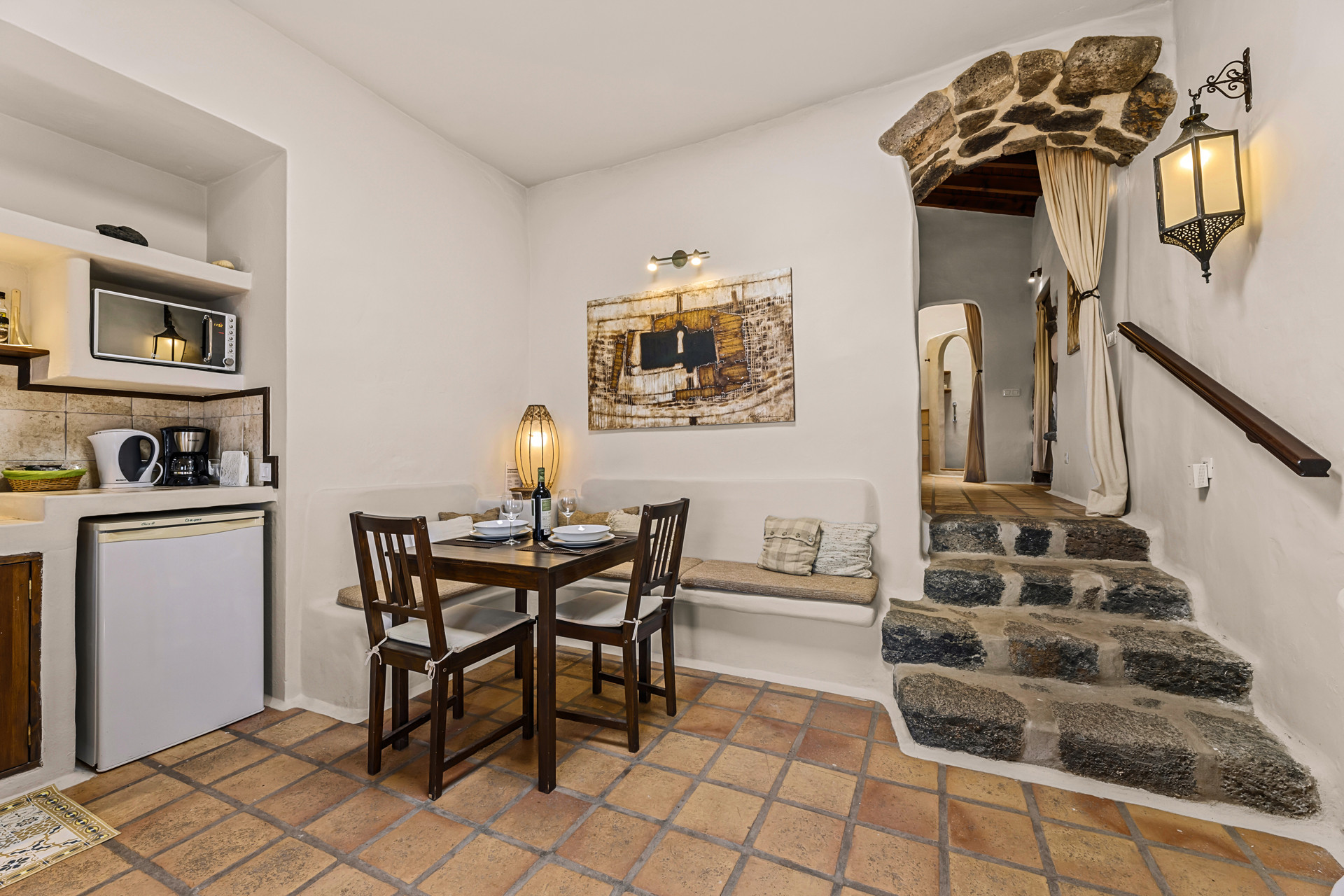 In the hotplate of glass ceramics open plan kitchen, refrigerator, microwave, dishes/cutlery, kitchen utensils, coffee machine, toaster, kettle and juicer are provided.