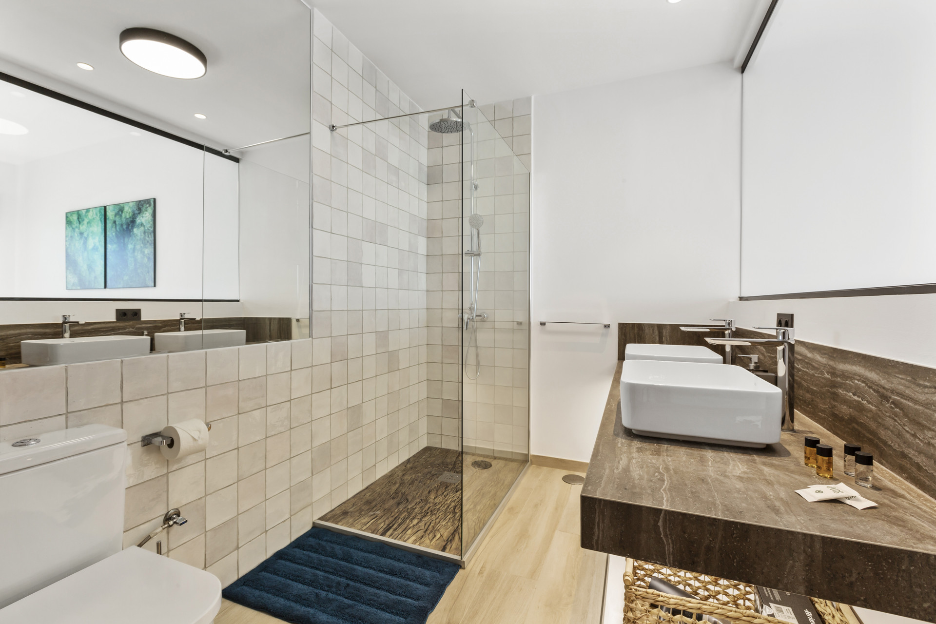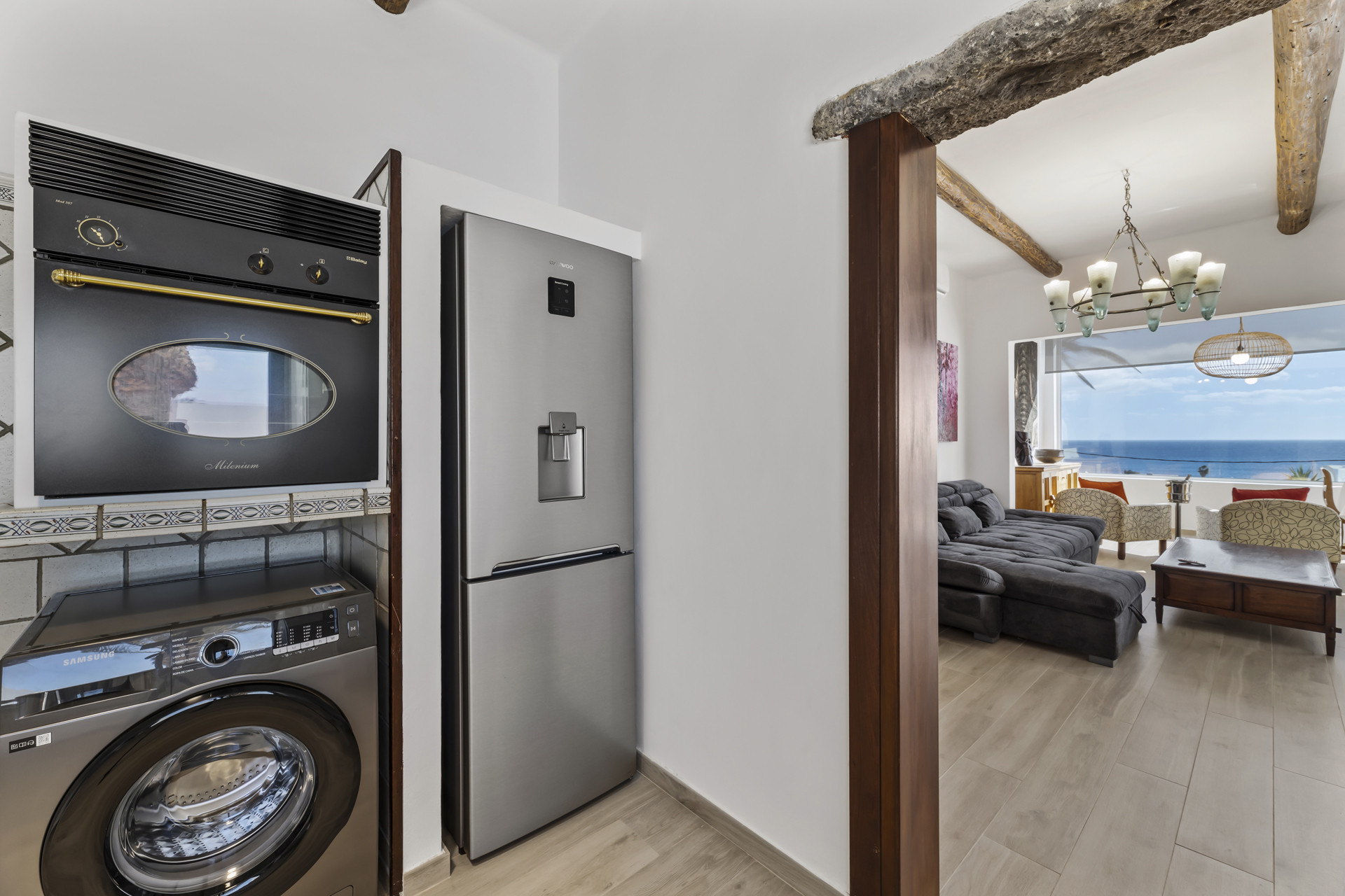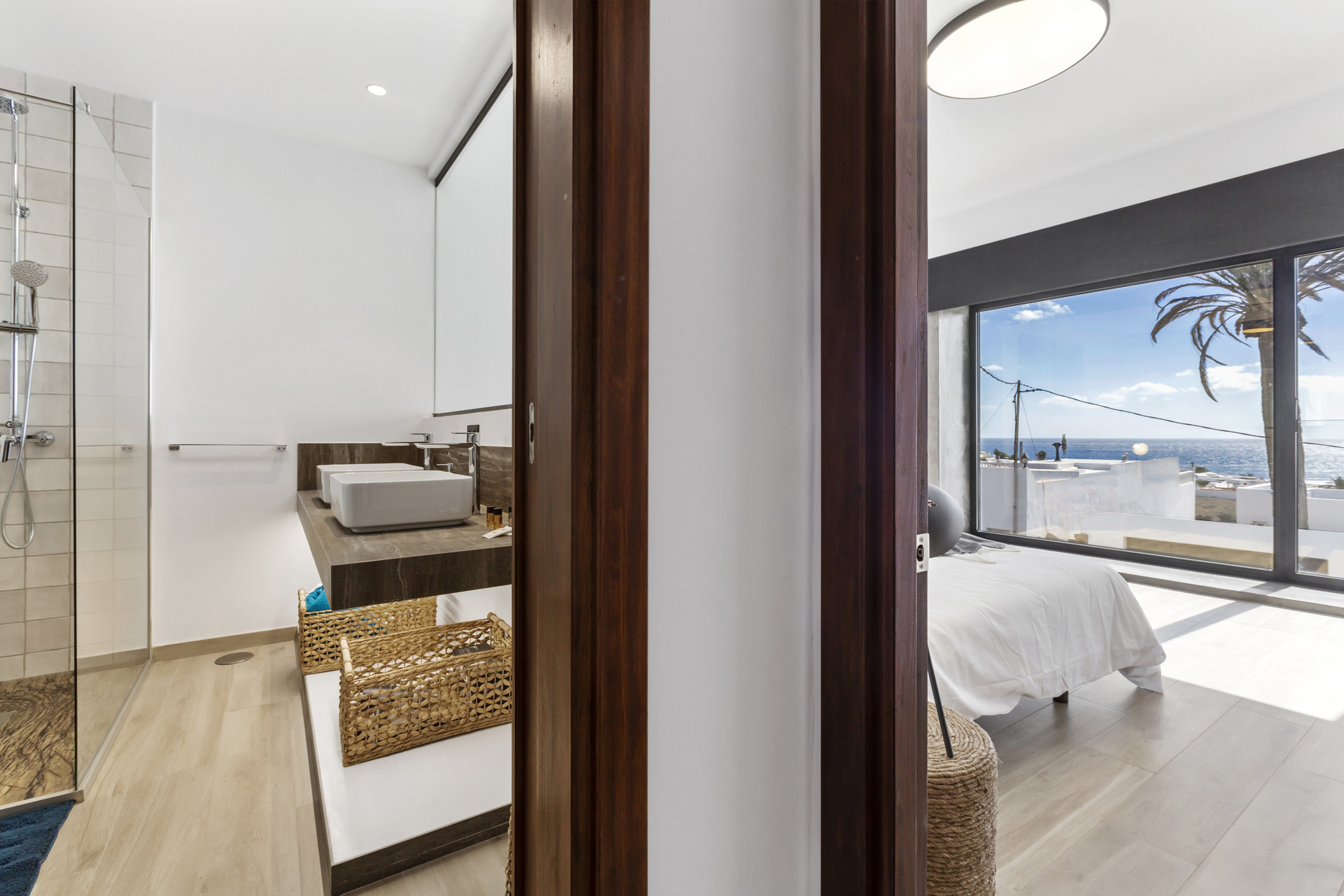 The upper floor has a huge living room with spectacular views of the sea, a fully equipped independent kitchen, a huge dressing room, two en-suite bathrooms (one of them with a bathtub and shower) and two bedrooms with incredible views. One of the bedrooms has a private balcony with views.