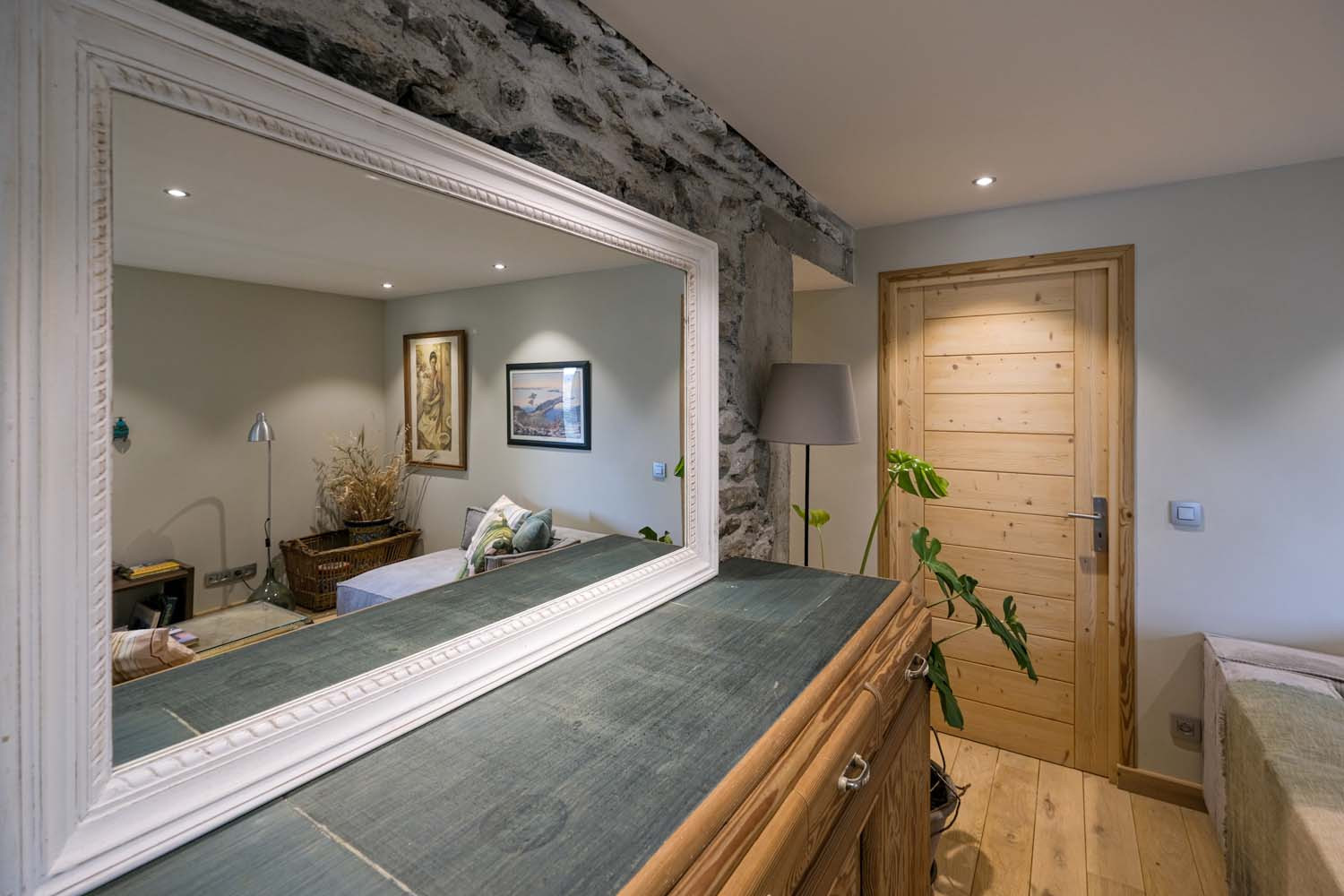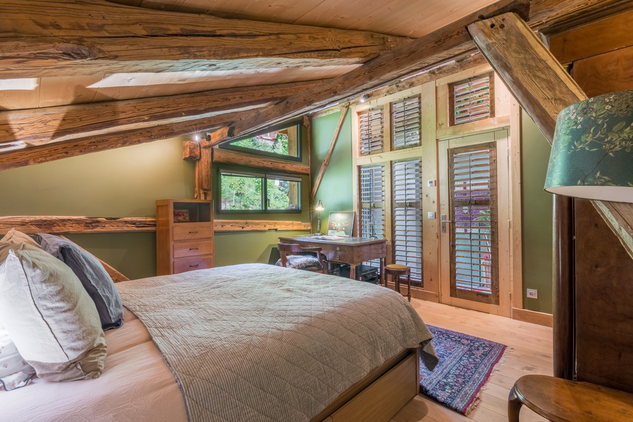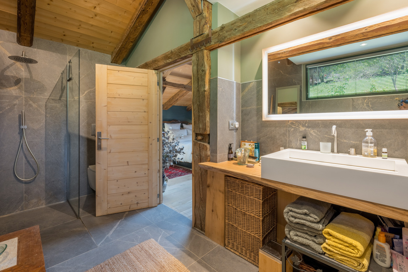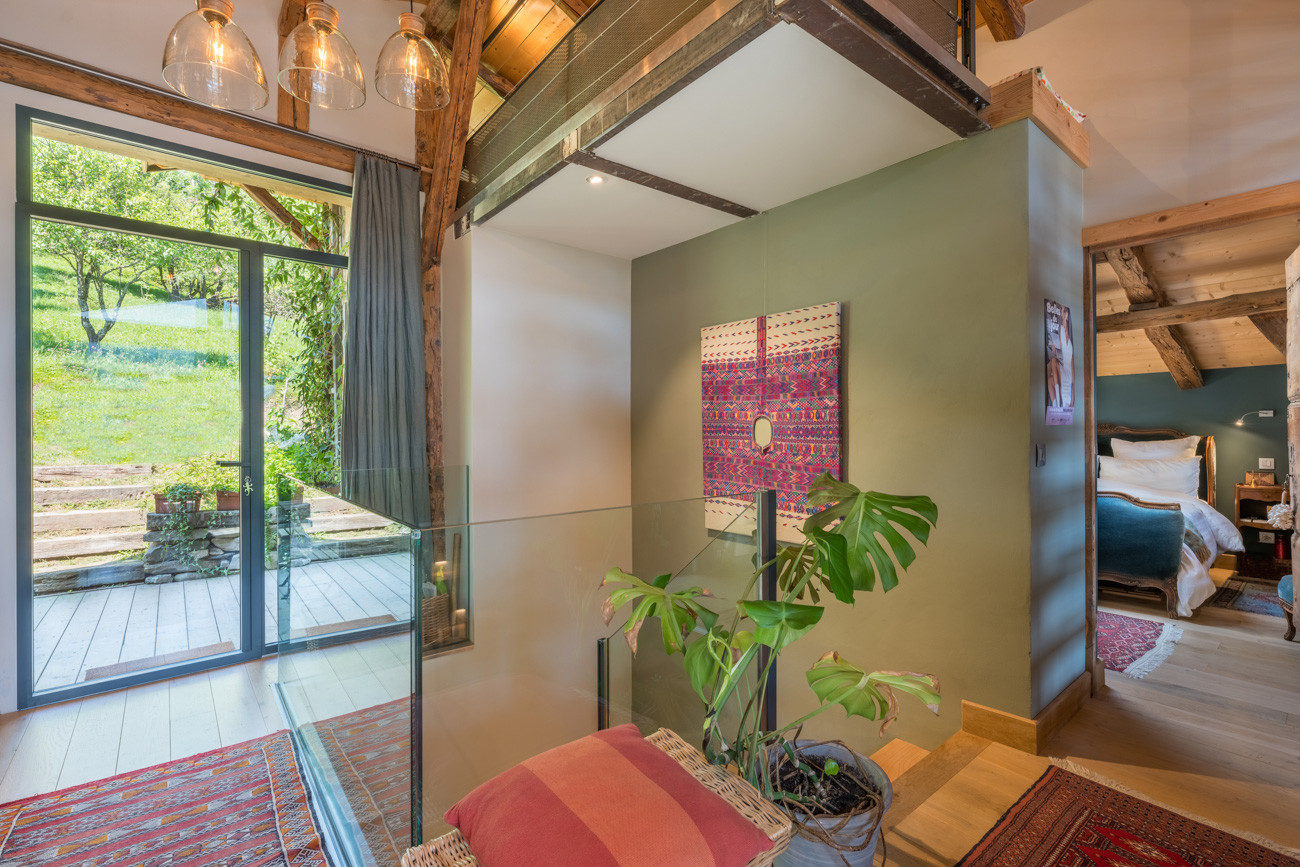 Le Mont Farm is an old farm building with foundations dating back to the 1700’s, up on the hills overlooking Servoz. It has been painstakingly restored by its owners, retaining many original features such as stone walls and solid wooden doors. The years of work has resulted in a beautiful, warm and sophisticated, personal style and yet it is somewhat playful in its design. You will find modern and classic furniture with a mixture of subdued colours, old and new wood and stone walls.