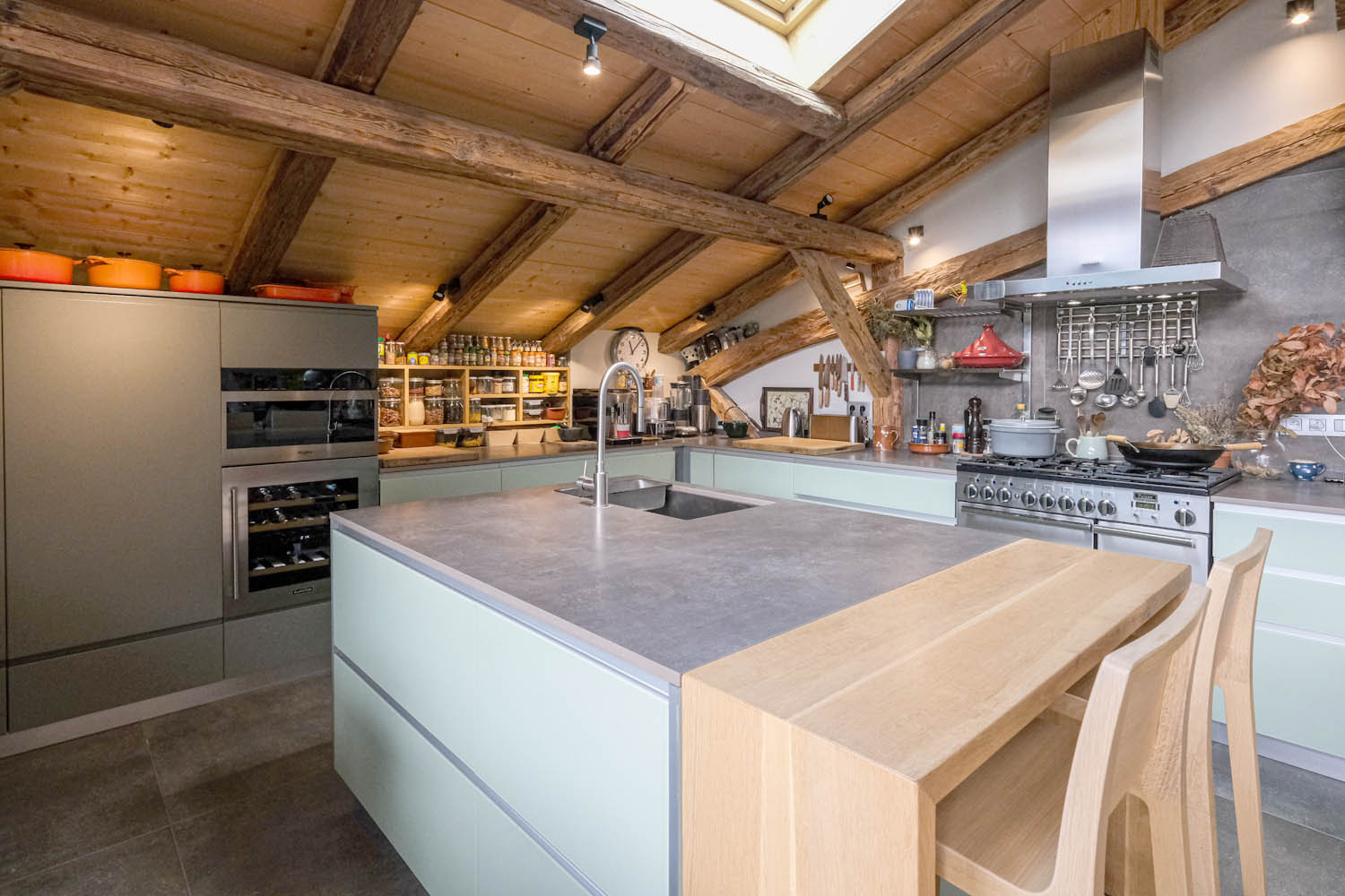 Turning up the modern staircase, you arrive to a stunning wooden and glass chalet style apartment. There is a great size modern, kitchen with everything you could ever need to create wonderful dishes (the owners love cooking themselves and I don't think they have missed anything). Along with all the cooking equipment, you have a large 5 gas ring, falcon stove and oven, large fridge freezer and separate wine fridge. (There is a separate laundry room with washing machine and dryer.) You have a large central island in the kitchen, as well as a breakfast bar with picture window looking out to the mountains, and a dining table that seats 8 people. This open plan space has large glass windows and doors opening up onto the balcony and offering the most tremendous views of the mountains - you really do feel on top of the world. The space is kept cosy by a central wood burner.