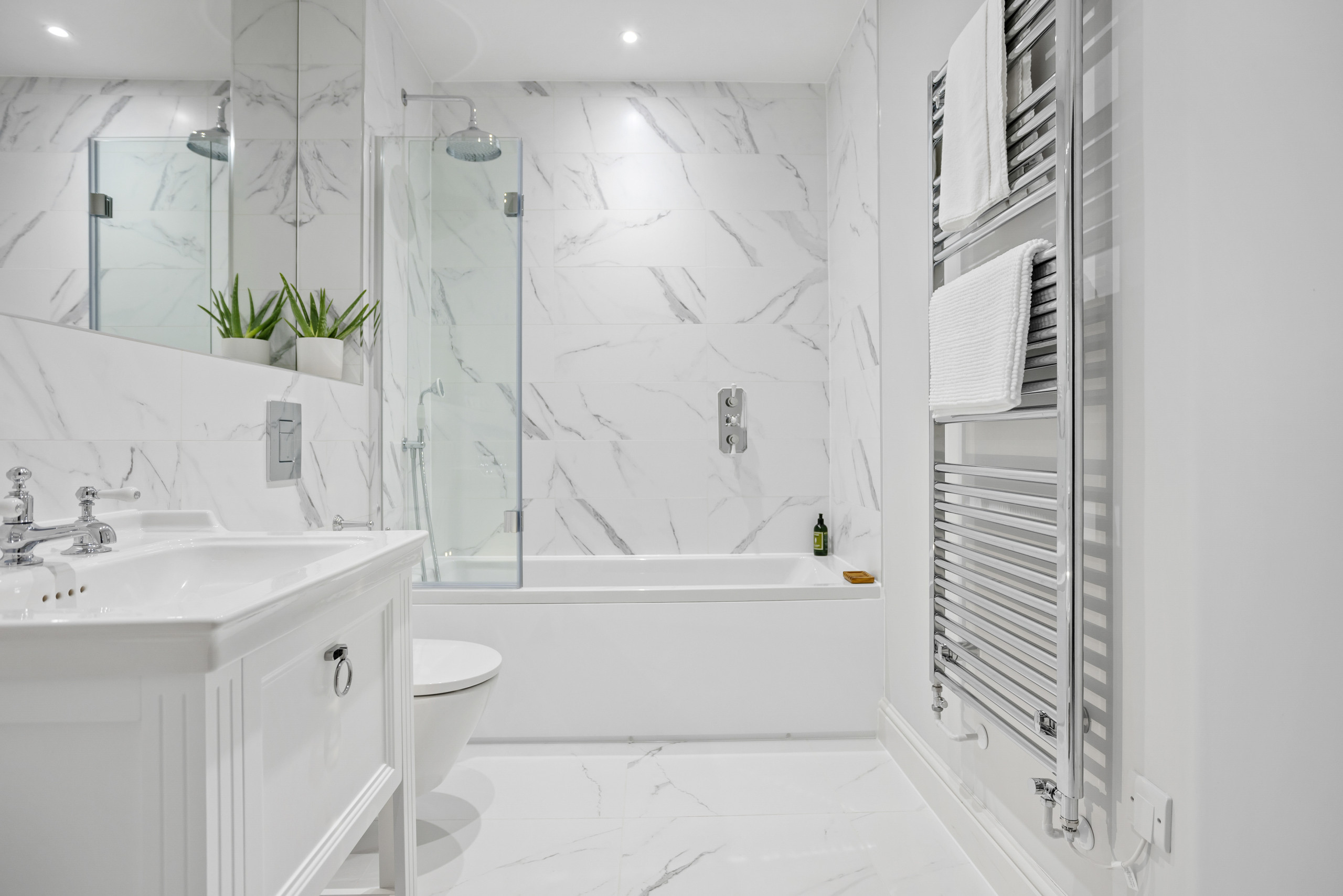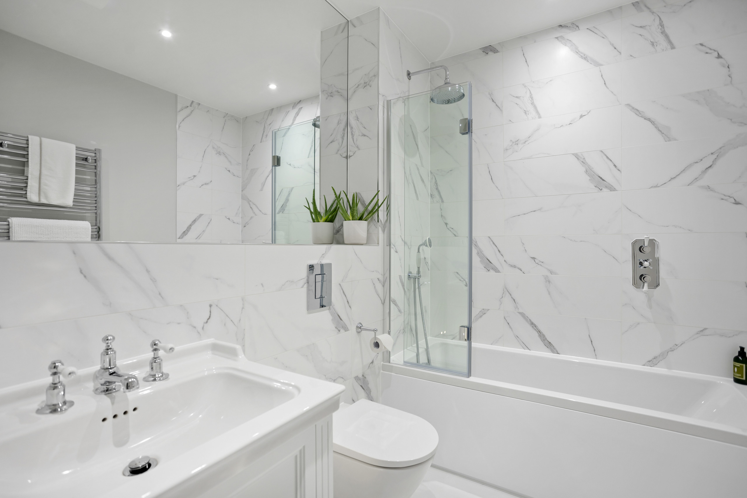 Bathroom: A sleek contemporary bathroom featuring a sumptuous bath with integrated overhead shower, heated towel rail, fluffy towels and complimentary luxury toiletries.