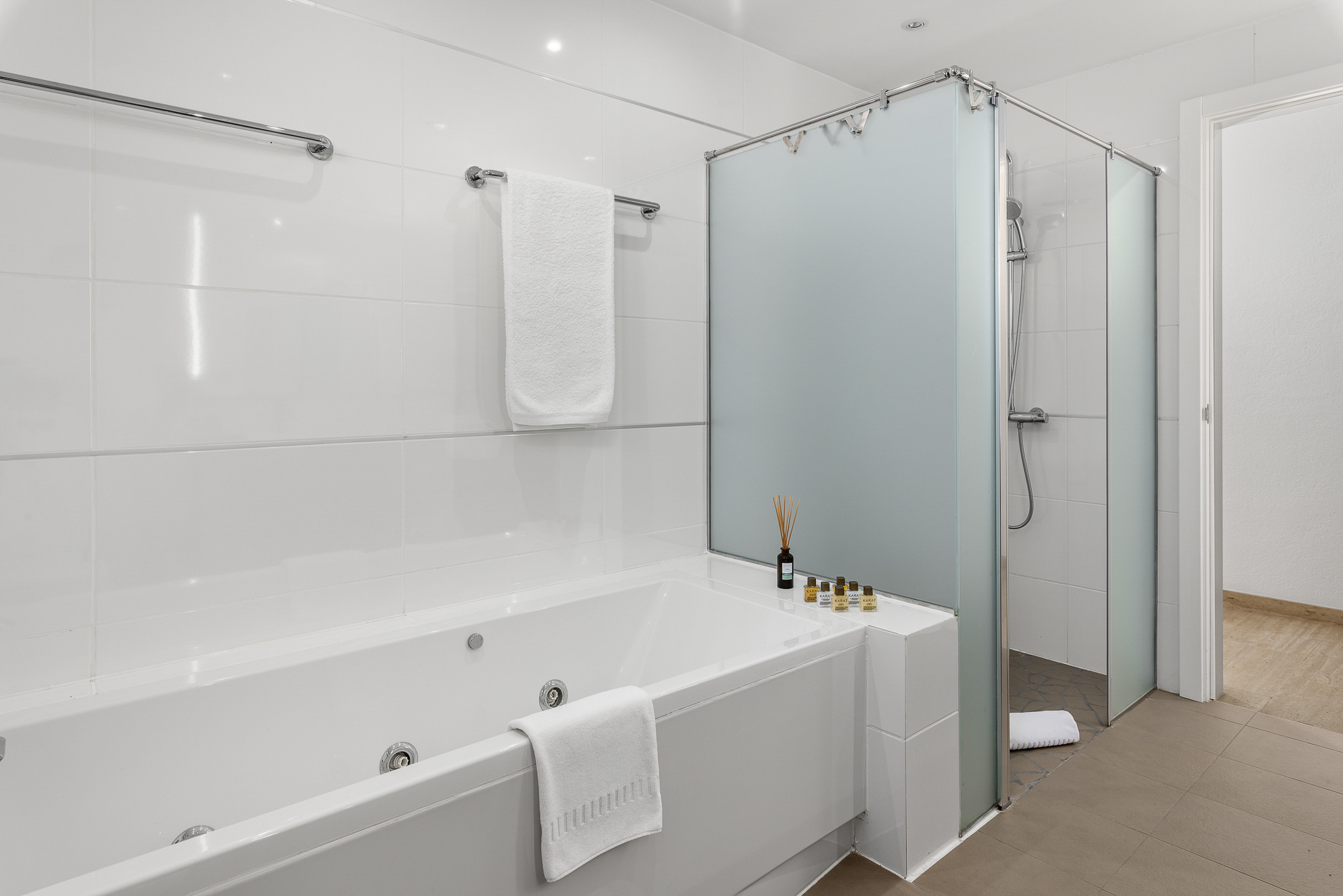Outside, the true charm unfolds: a pool with a jacuzzi facing the sea offers an incomparable corner to relax while contemplating the horizon. The chill out area is ideal for disconnecting with a drink in hand, surrounded by a warm and exclusive atmosphere.
