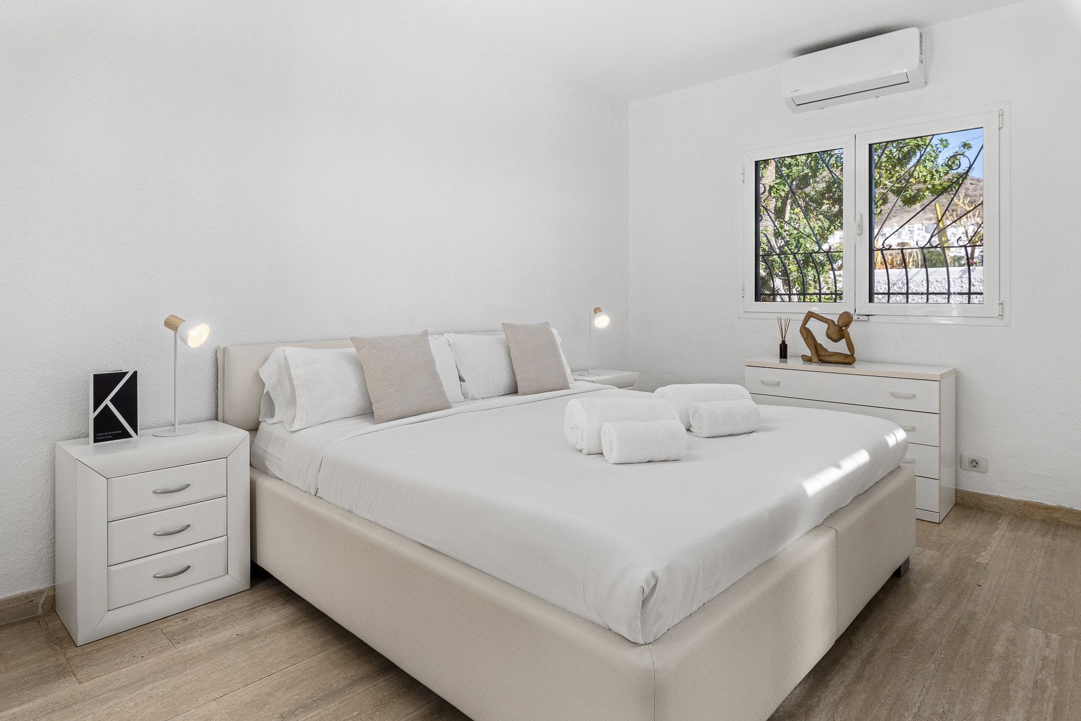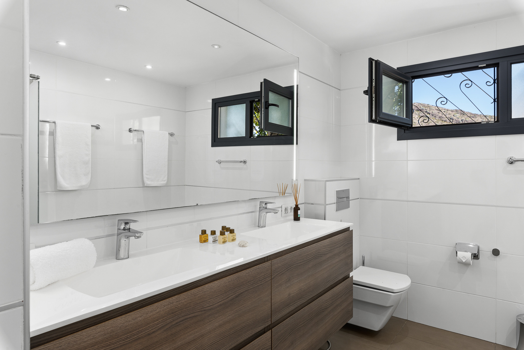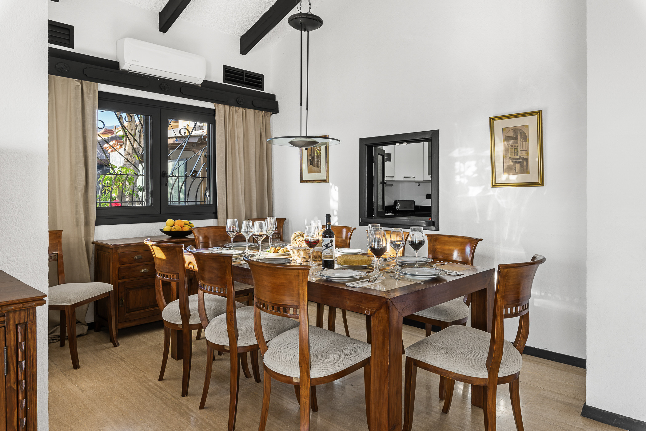The heart of the villa is its spacious dining room with double-height ceilings, a space flooded with natural light that invites relaxation and enjoyment. The fully equipped kitchen provides you with everything you need to experience local cuisine with freedom and style.