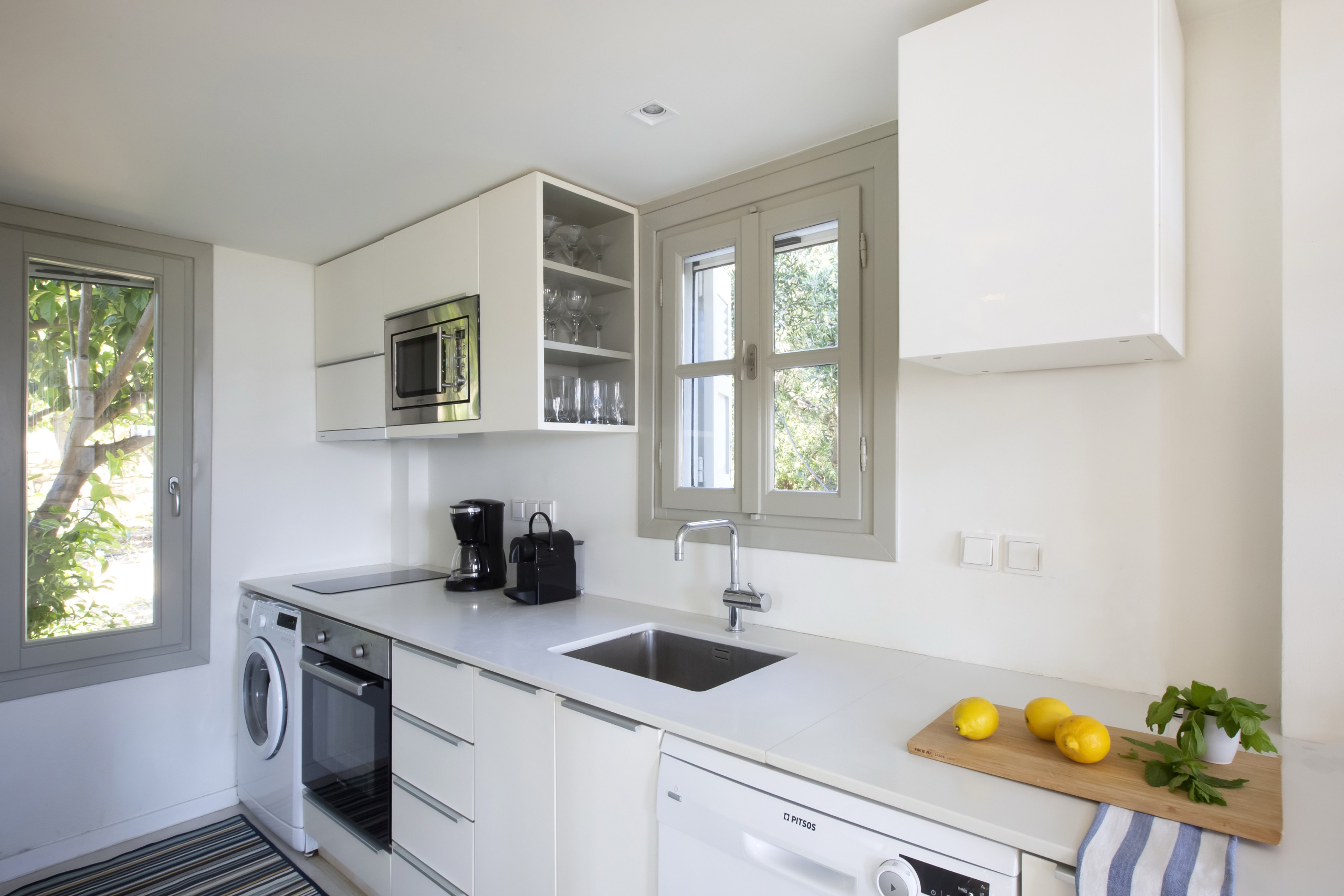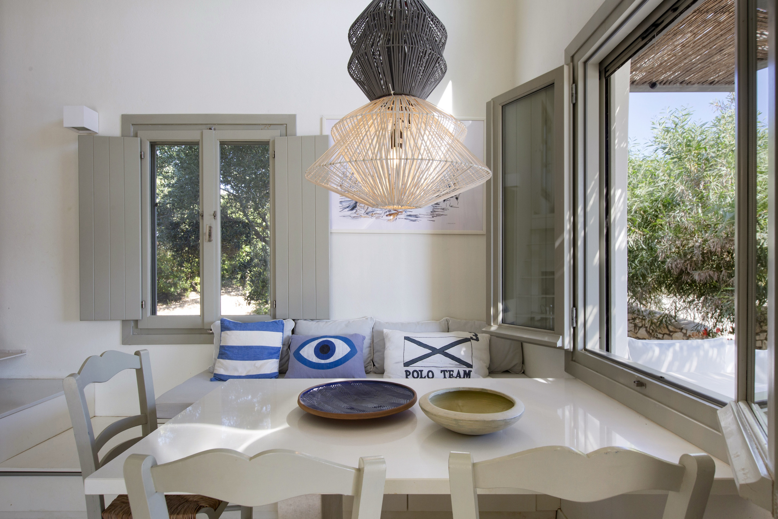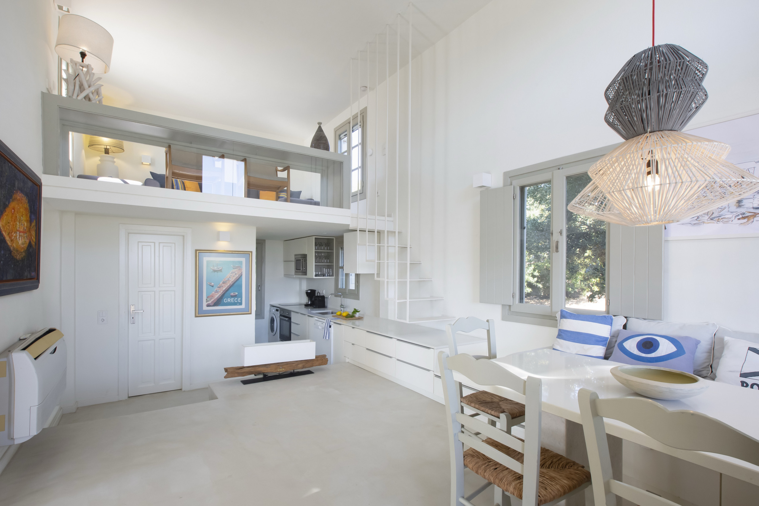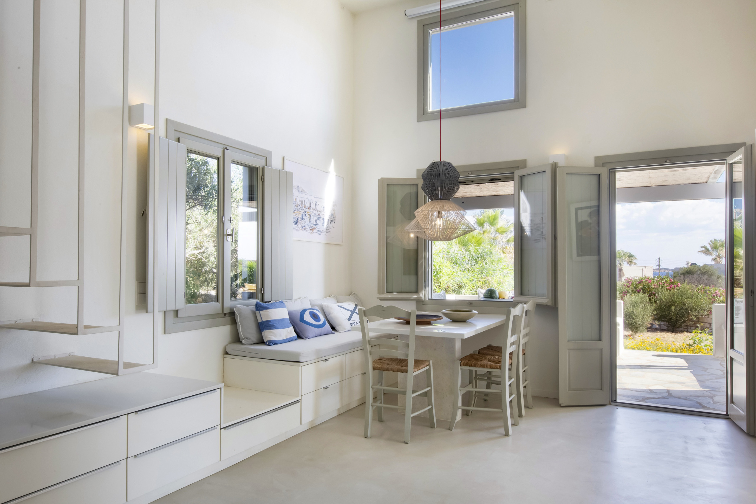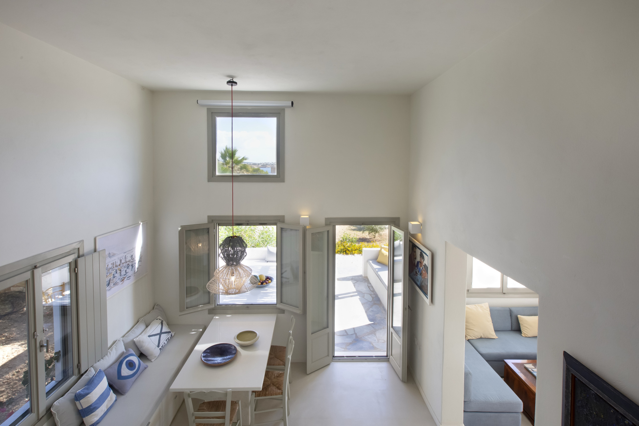 Indoors, the large living, dining and kitchen area is very modern, full of light, with very high ceilings and gorgeous sea, island and garden views. There is a large dining table, ideal for family gatherings, a modern living area and a fully-equipped kitchen.