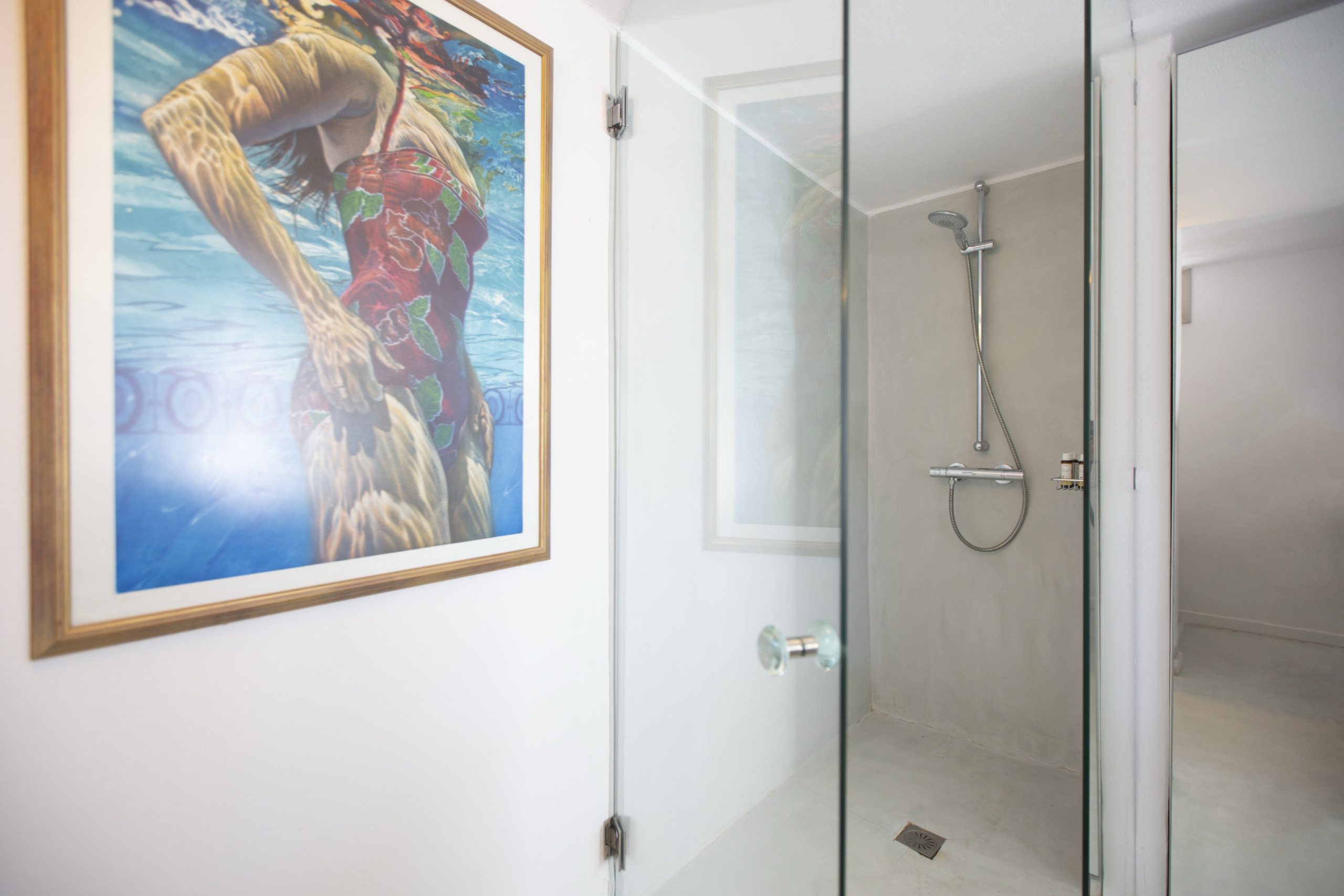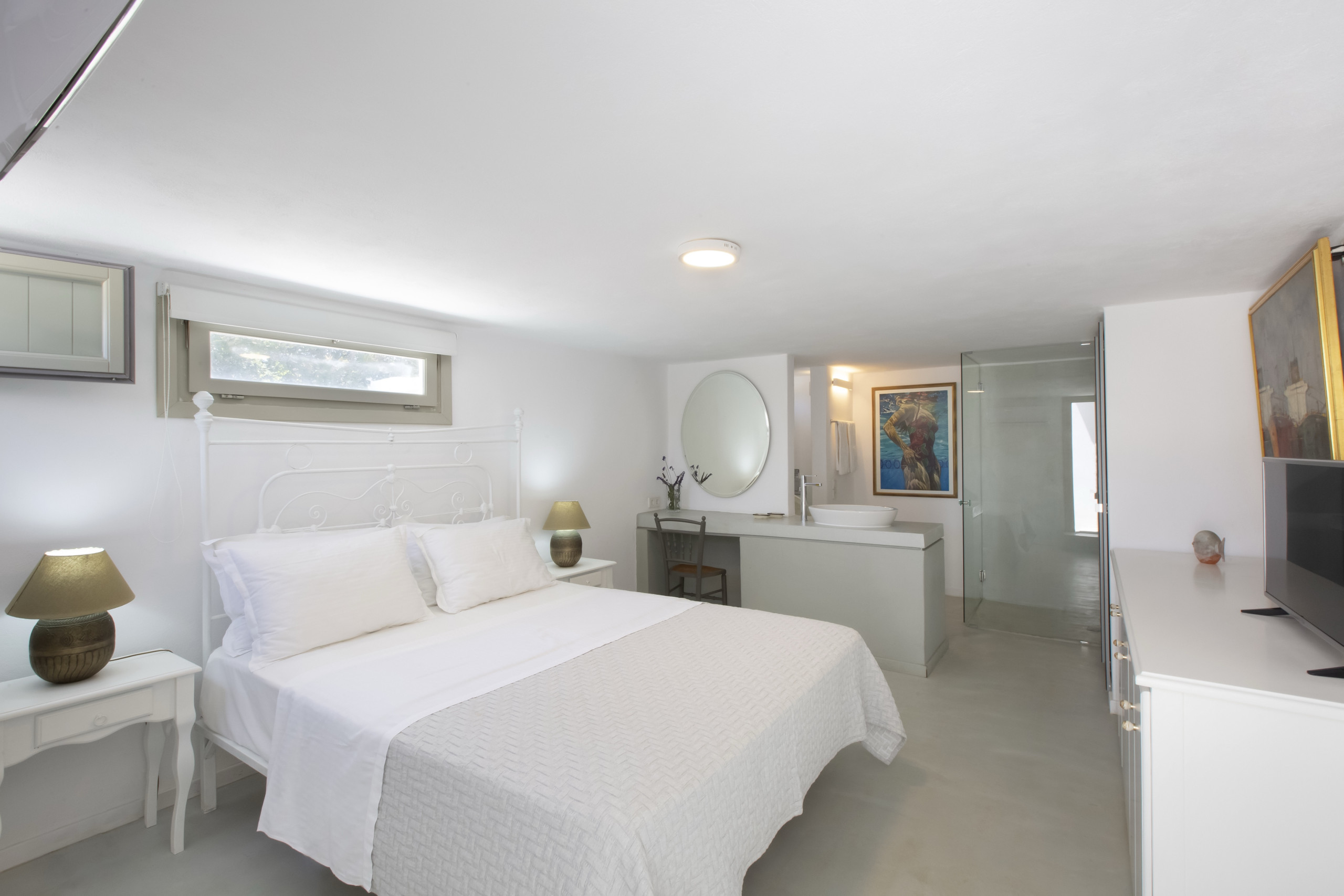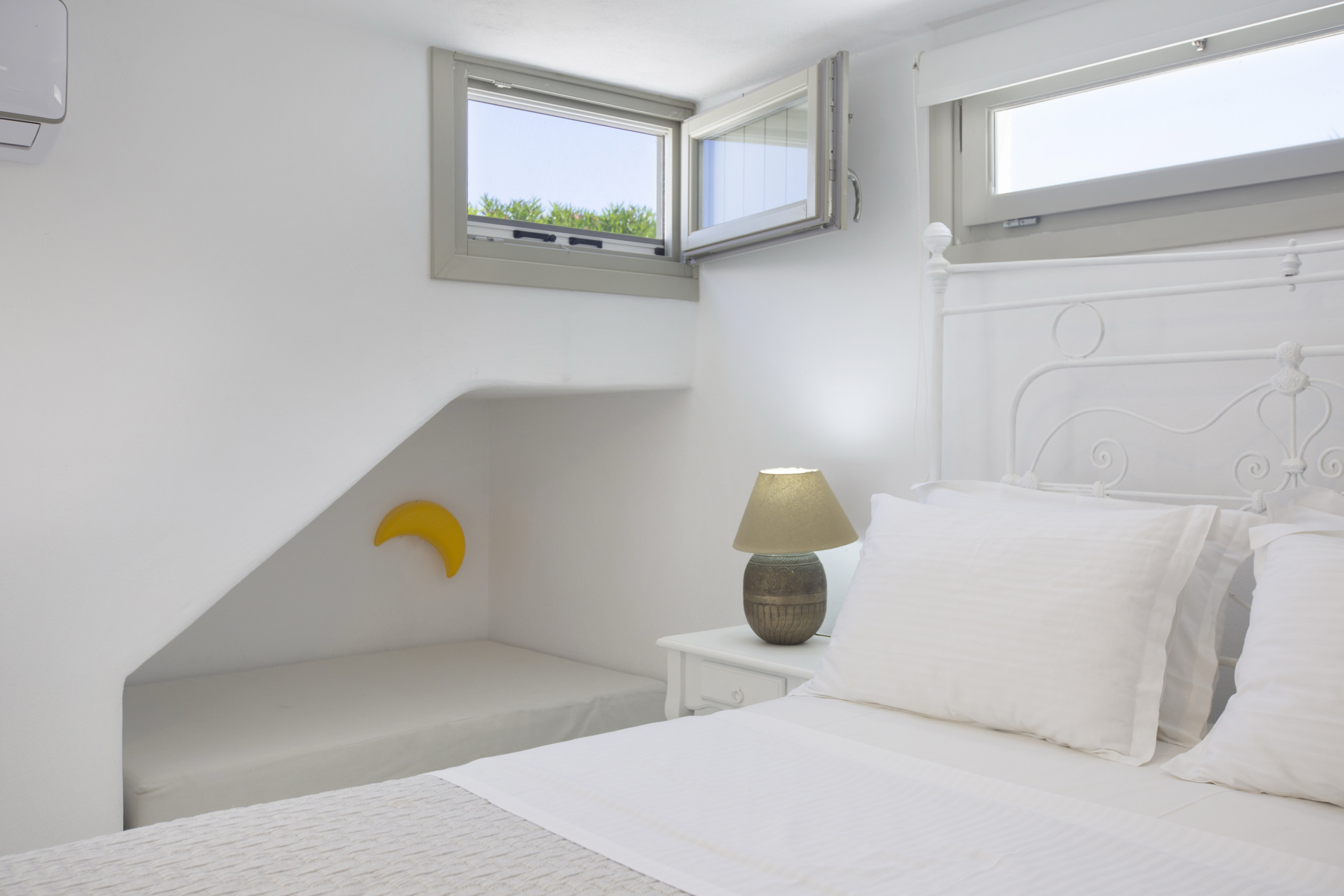 On the lower ground floor level , the second bedroom is more like a small independent studio, with a double bed, a small, traditionally-built child’s bed, and its own ensuite bathroom.