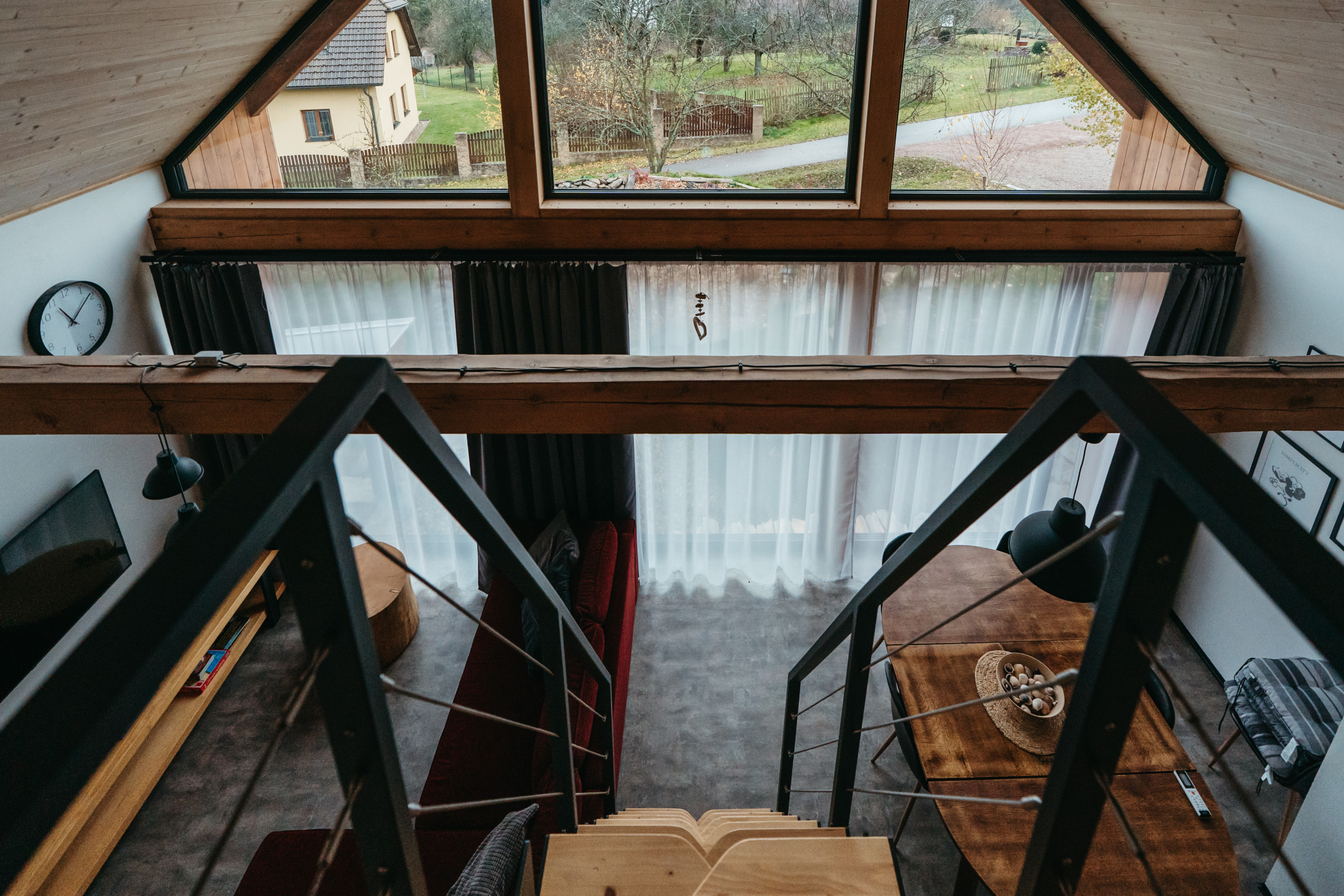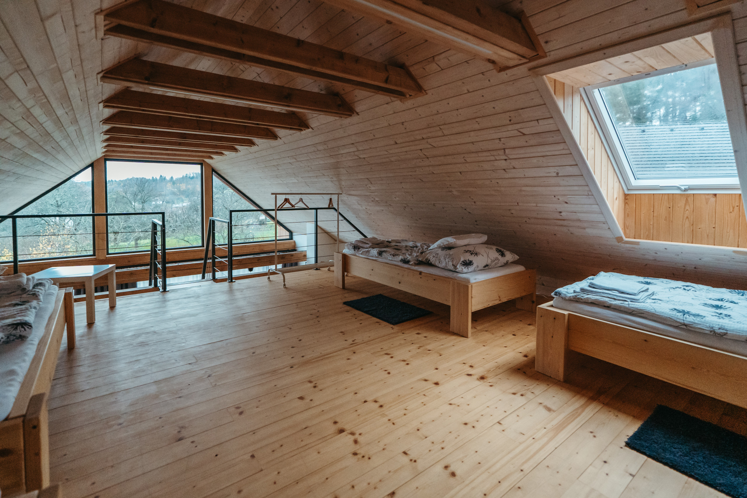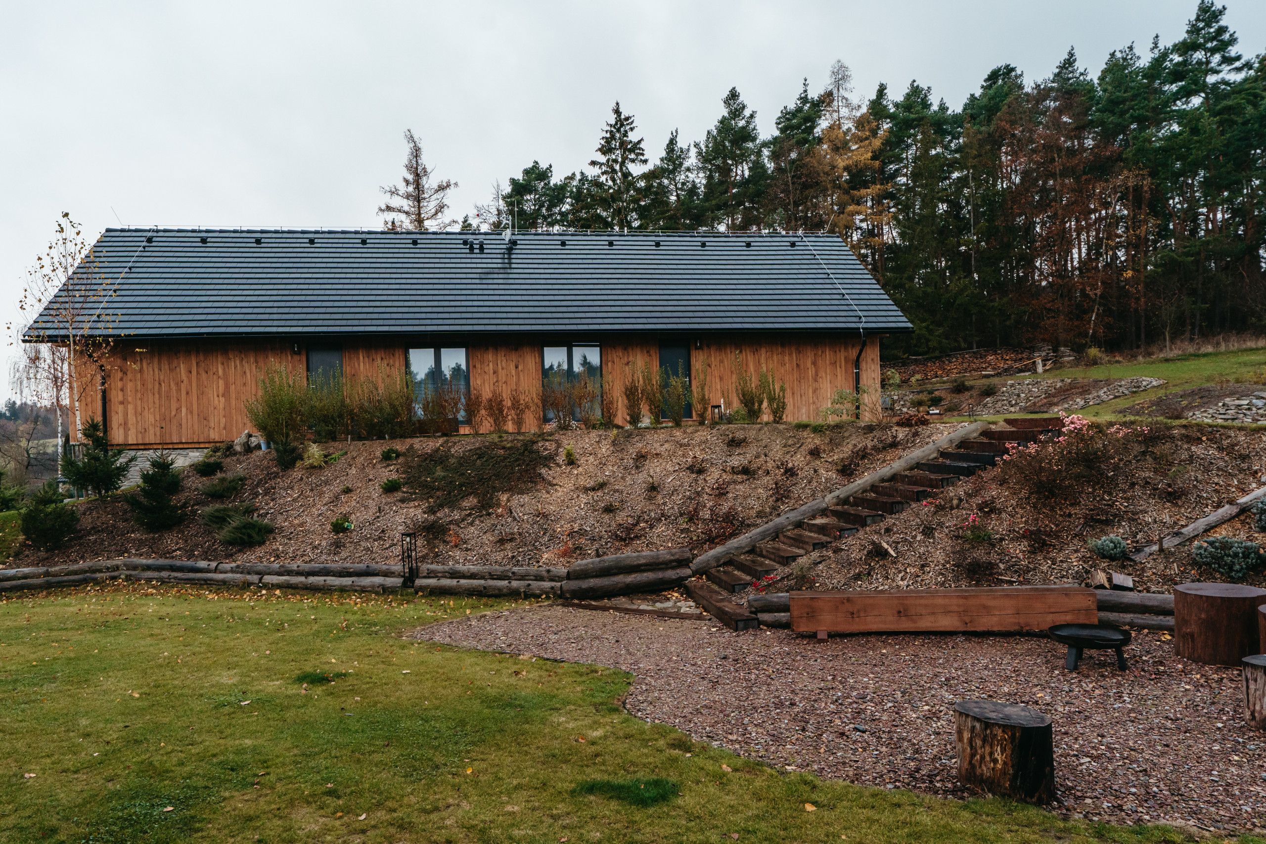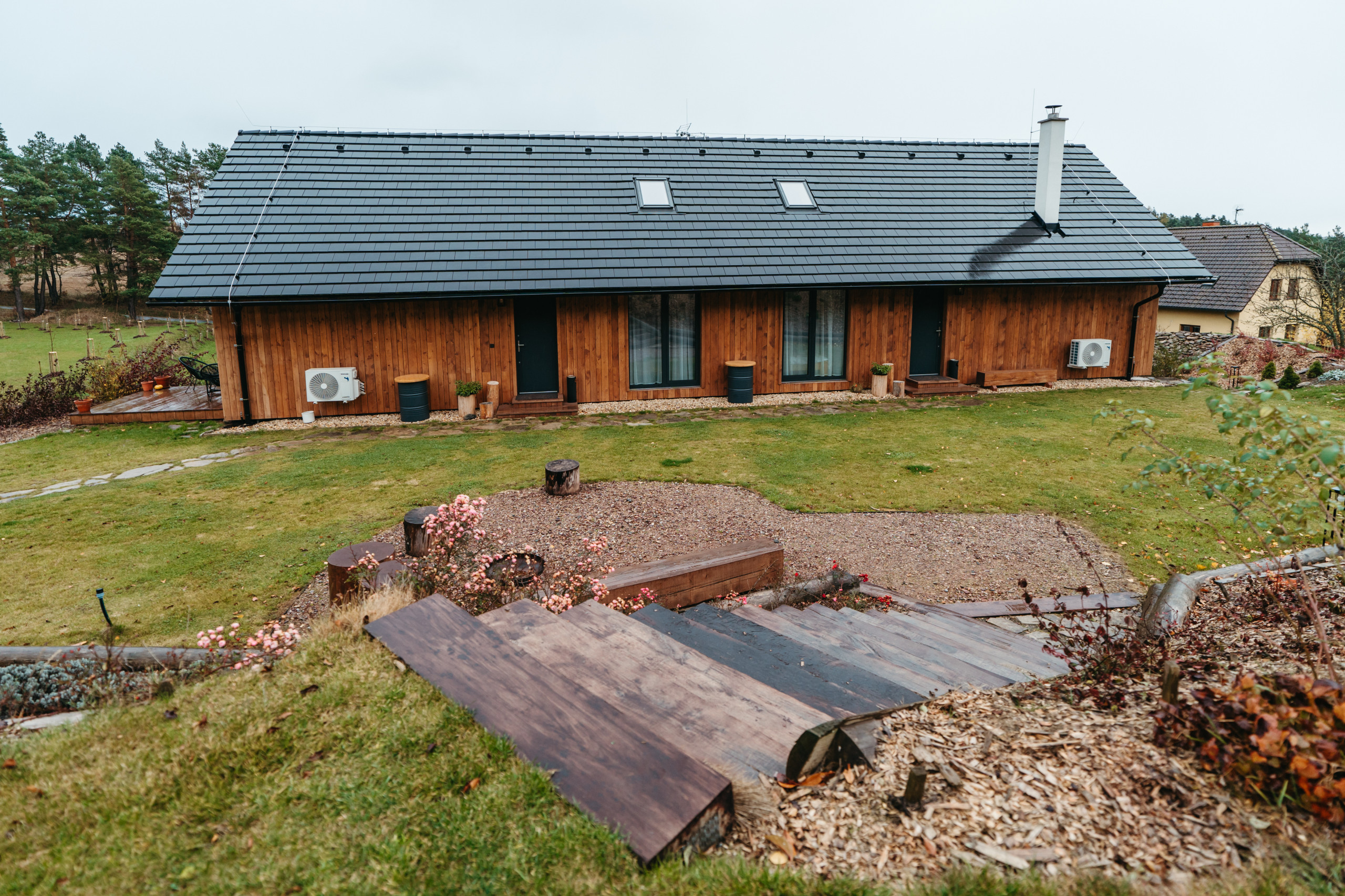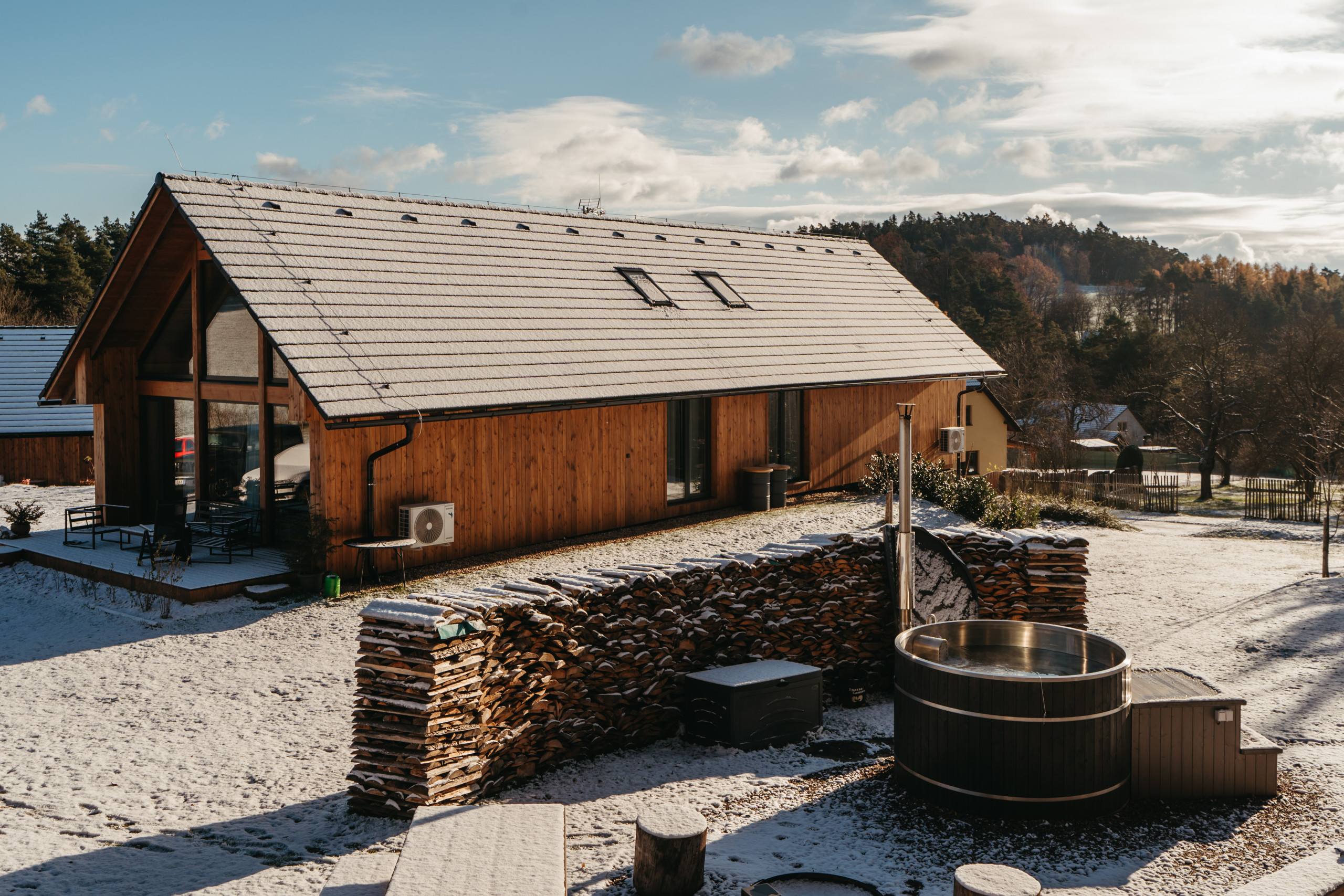 Each house is equipped with two bathrooms. One of the houses features bathrooms with bathtubs, while the other house has showers. In addition to the four bathrooms, there are also separate toilets, ensuring that it doesn't matter whether you are traveling with a large group or not. No queues will be formed. Both houses can accommodate up to 12 people and have their own terraces. Built in a modern style with light brown wooden tones, these houses are surrounded by an orchard. Inside, you can even catch a faint scent of wood, which truly gives you the feeling of being in the Czech countryside.