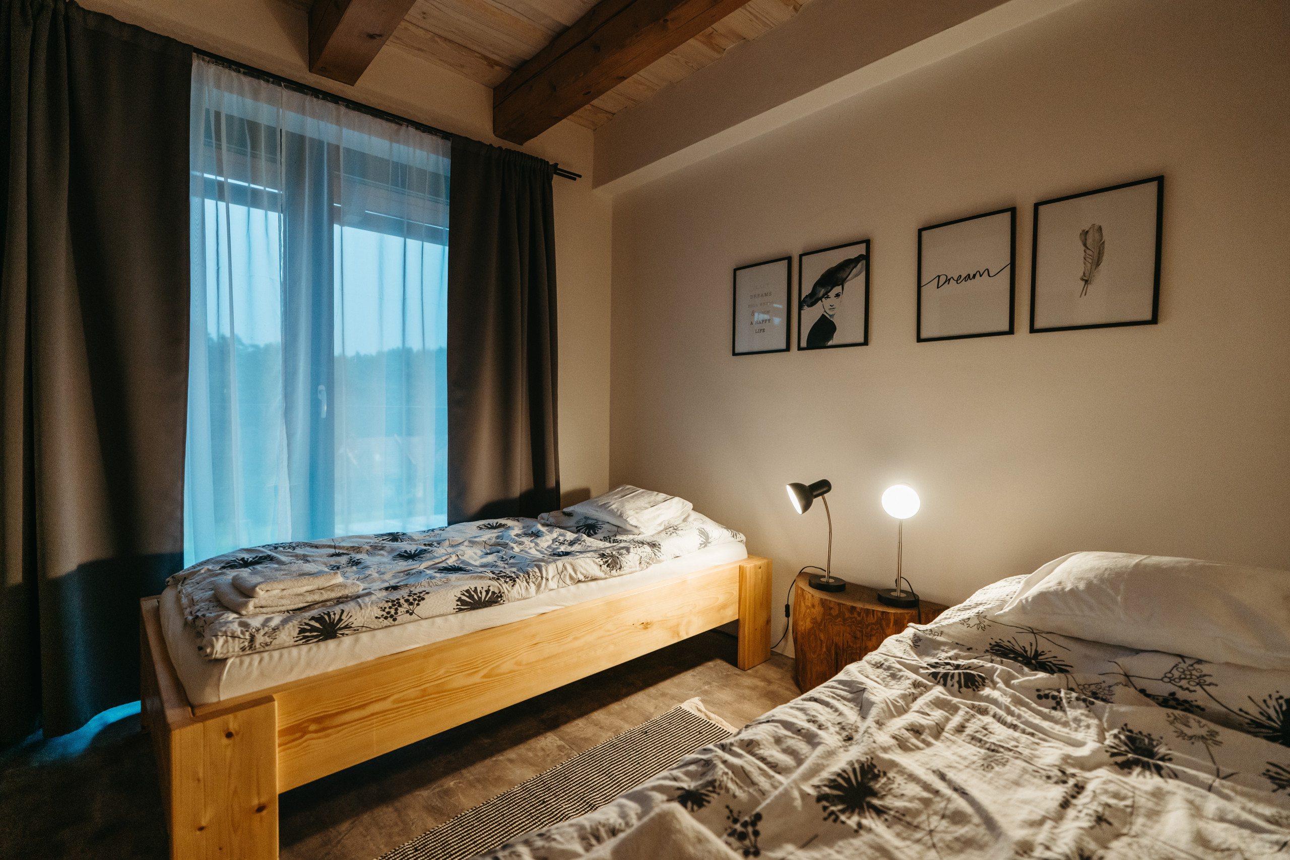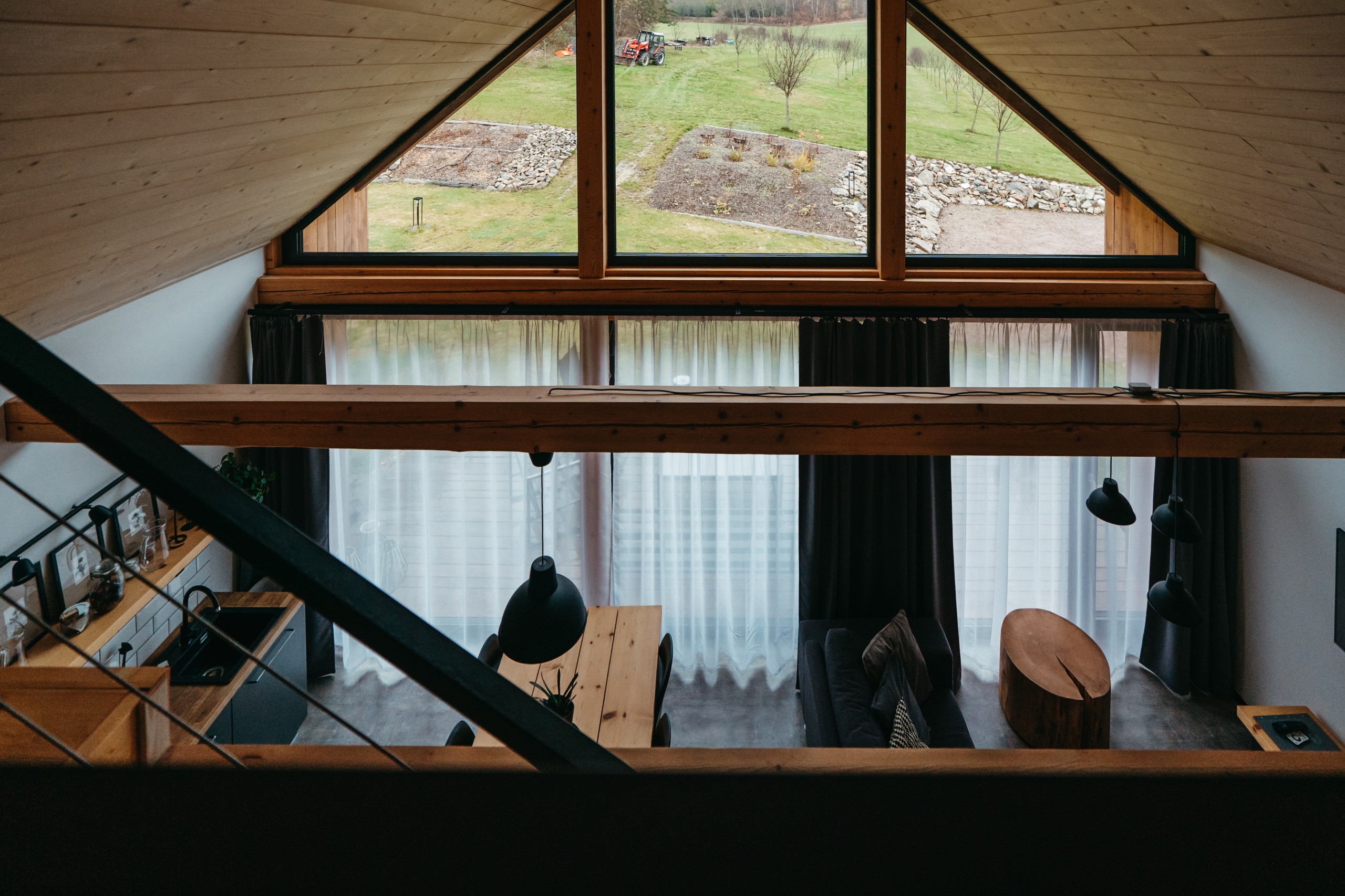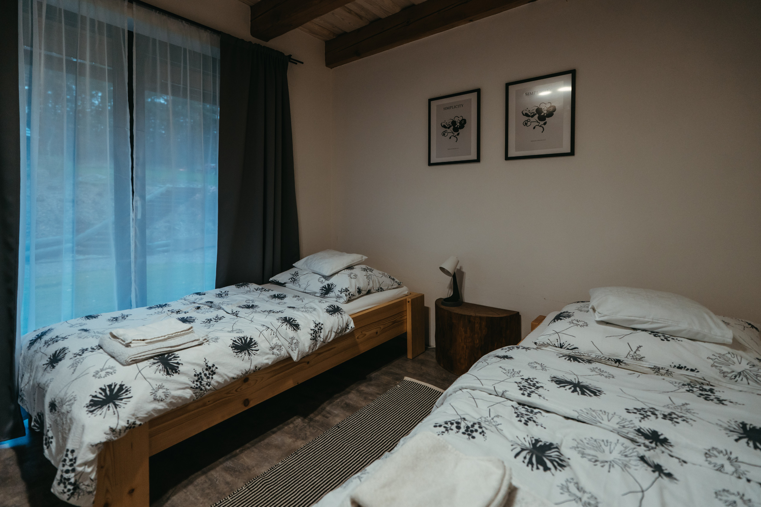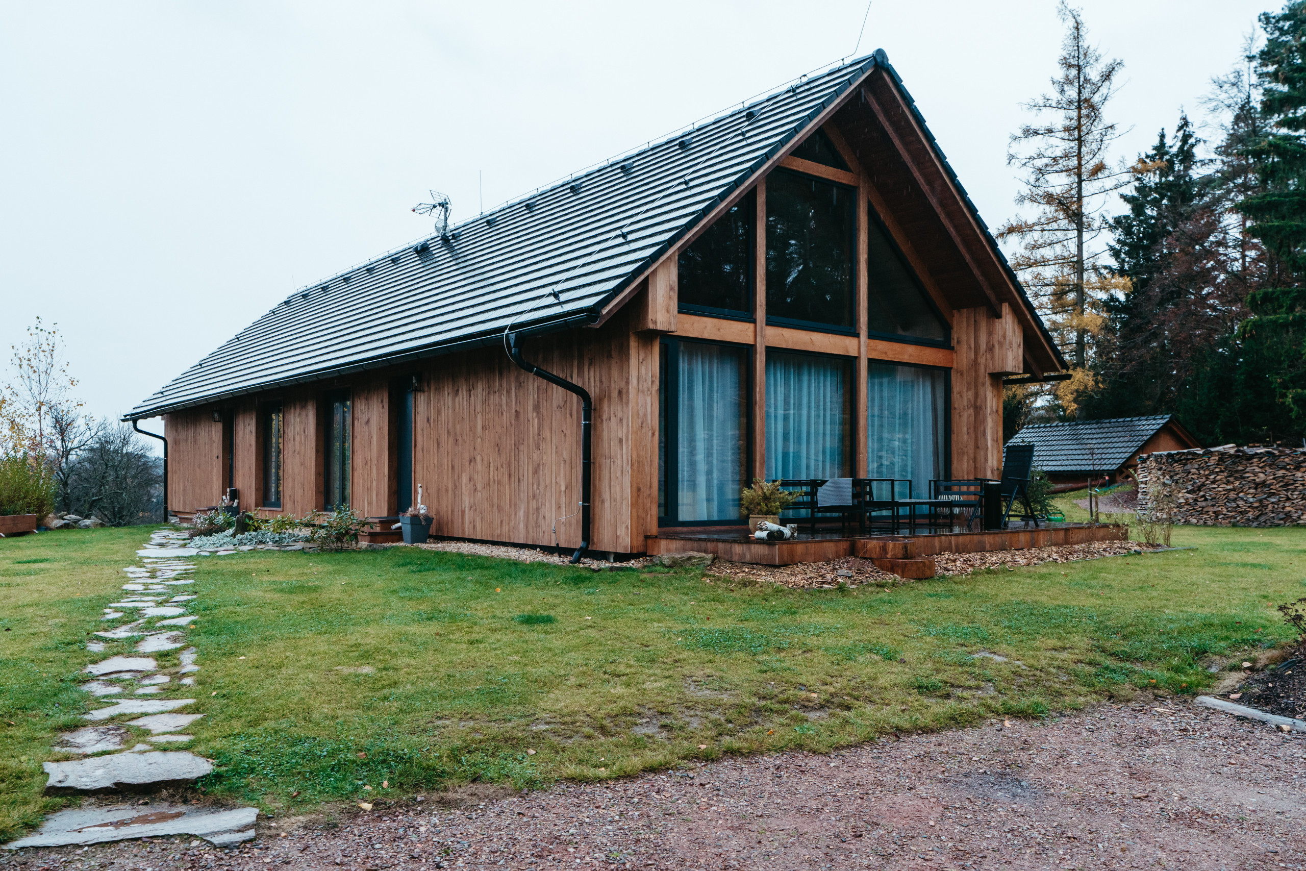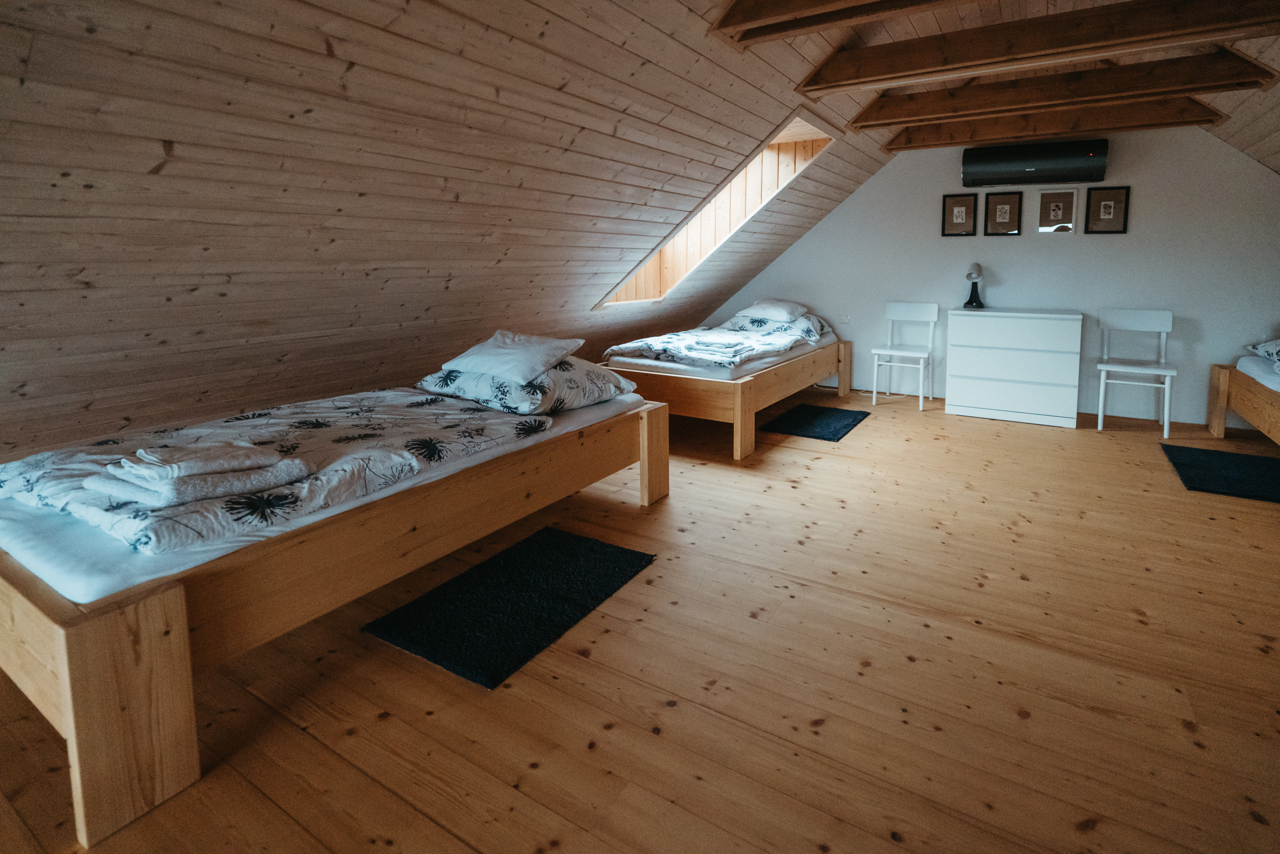 Each house is equipped with two bathrooms. One of the houses features bathrooms with bathtubs, while the other house has showers. In addition to the four bathrooms, there are also separate toilets, ensuring that it doesn't matter whether you are traveling with a large group or not. No queues will be formed. Both houses can accommodate up to 12 people and have their own terraces. Built in a modern style with light brown wooden tones, these houses are surrounded by an orchard. Inside, you can even catch a faint scent of wood, which truly gives you the feeling of being in the Czech countryside.
