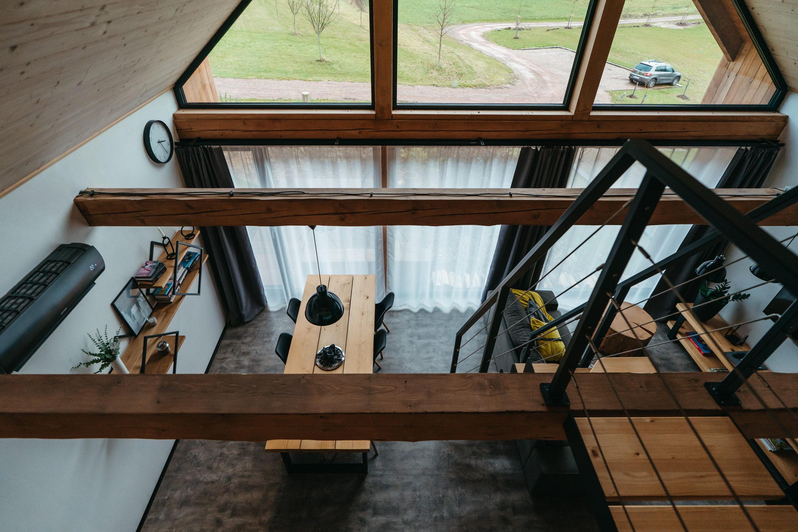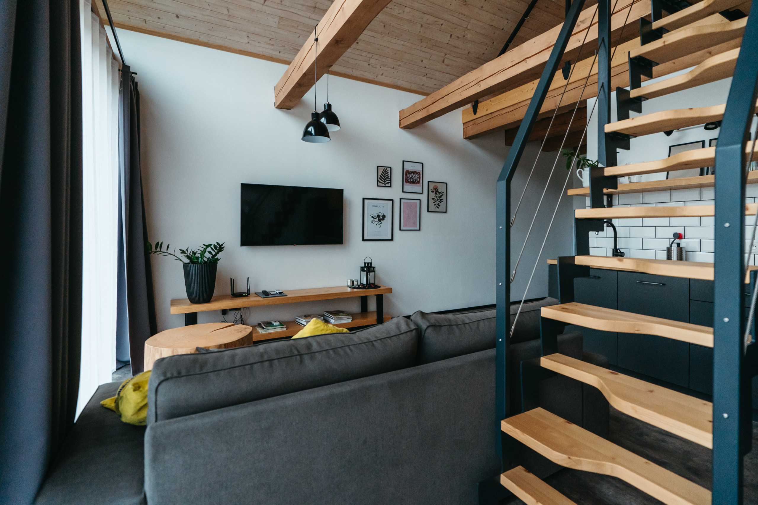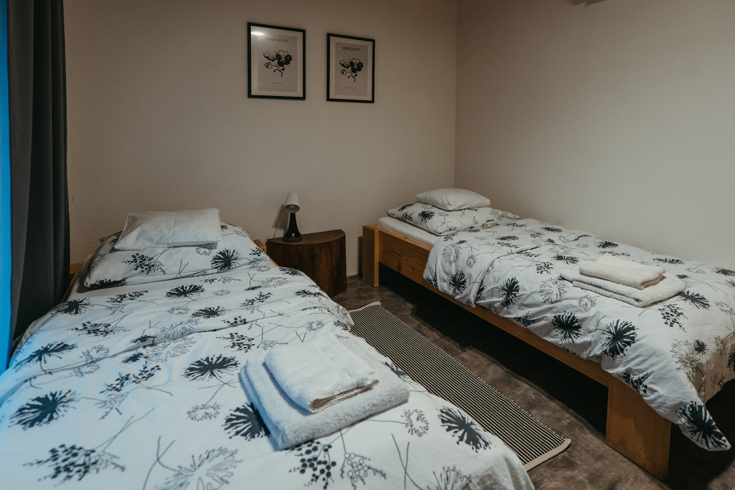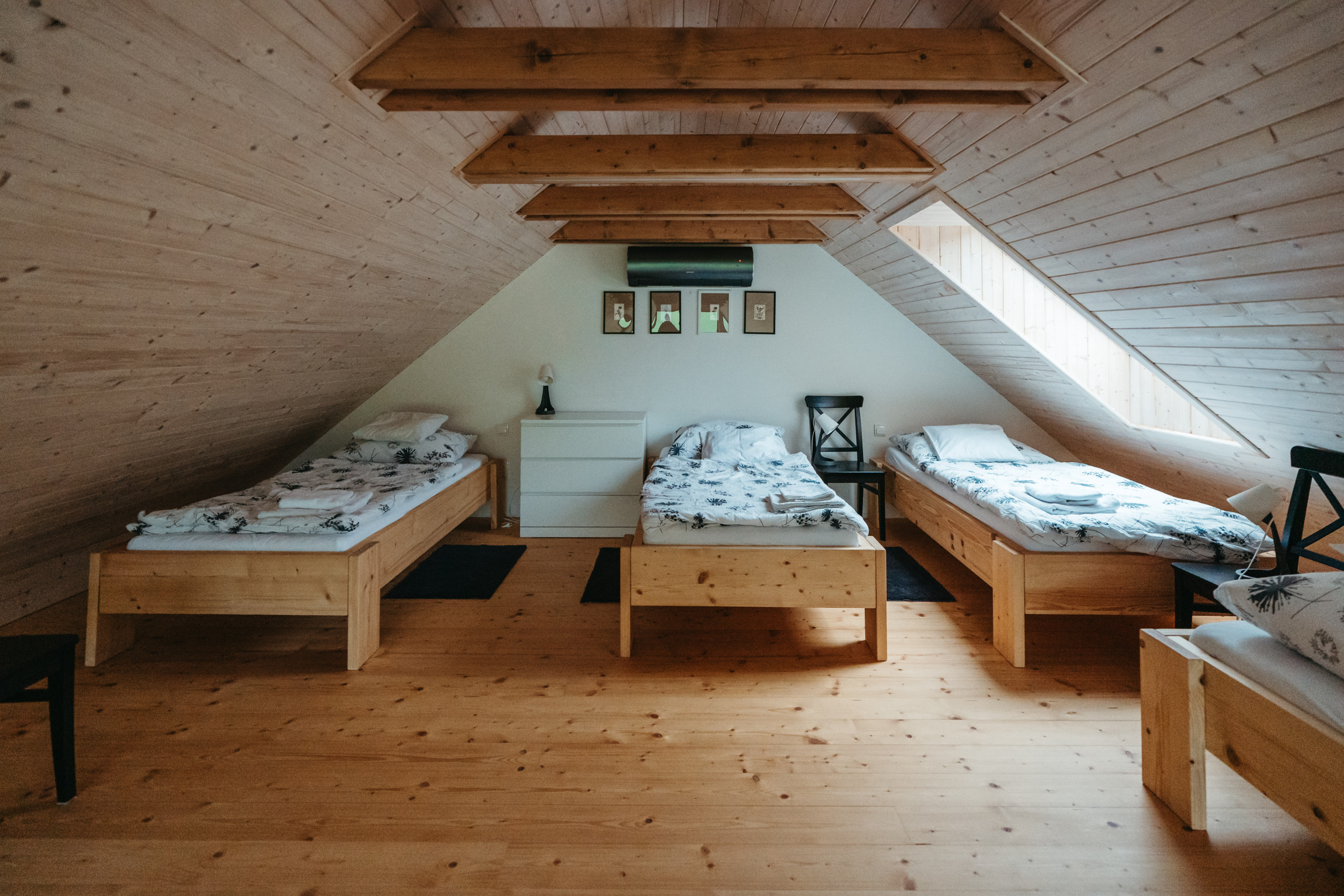 Each house is equipped with two bathrooms. One of the houses features bathrooms with bathtubs, while the other house has showers. In addition to the four bathrooms, there are also separate toilets, ensuring that it doesn't matter whether you are traveling with a large group or not. No queues will be formed. Both houses can accommodate up to 12 people and have their own terraces. Built in a modern style with light brown wooden tones, these houses are surrounded by an orchard. Inside, you can even catch a faint scent of wood, which truly gives you the feeling of being in the Czech countryside.