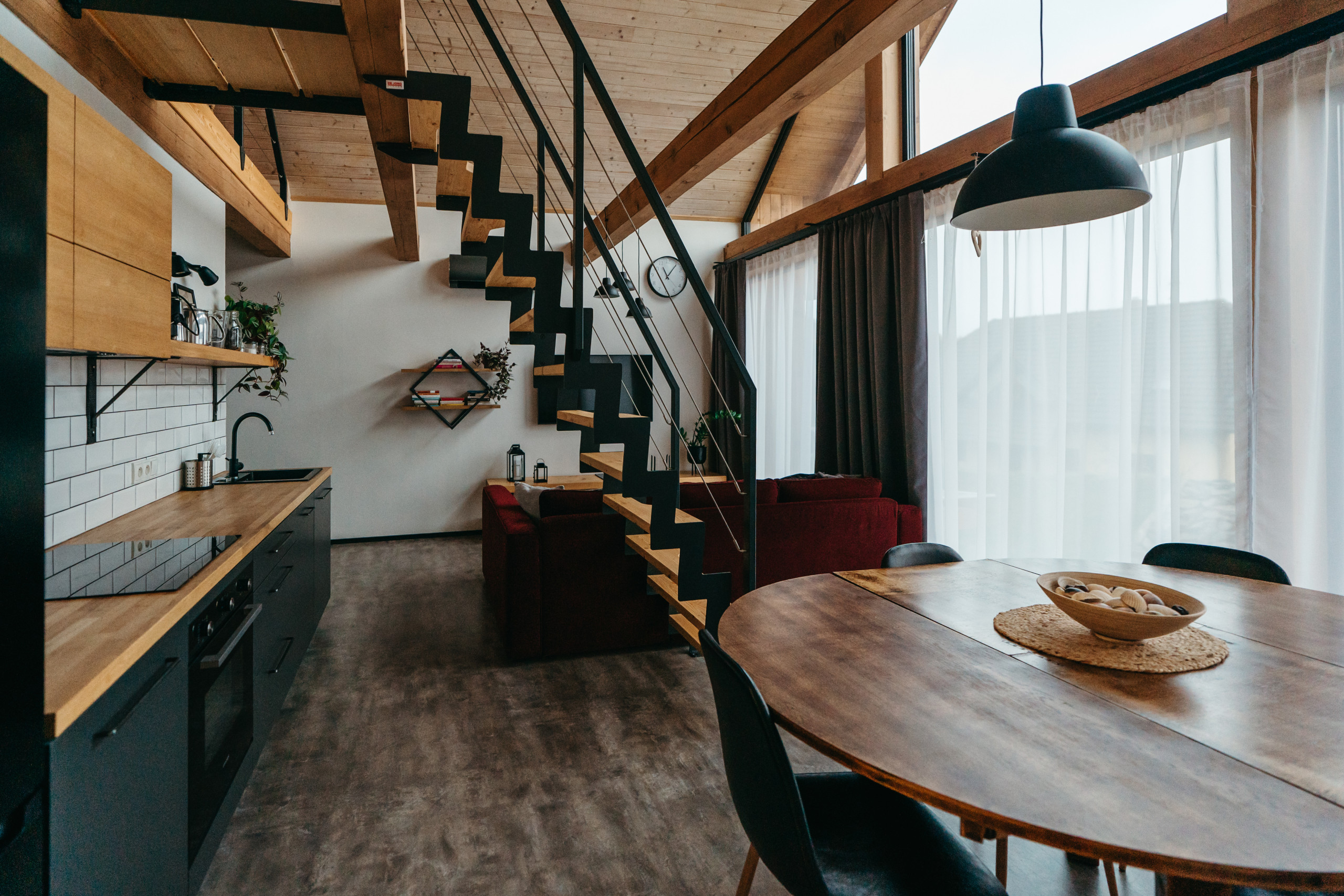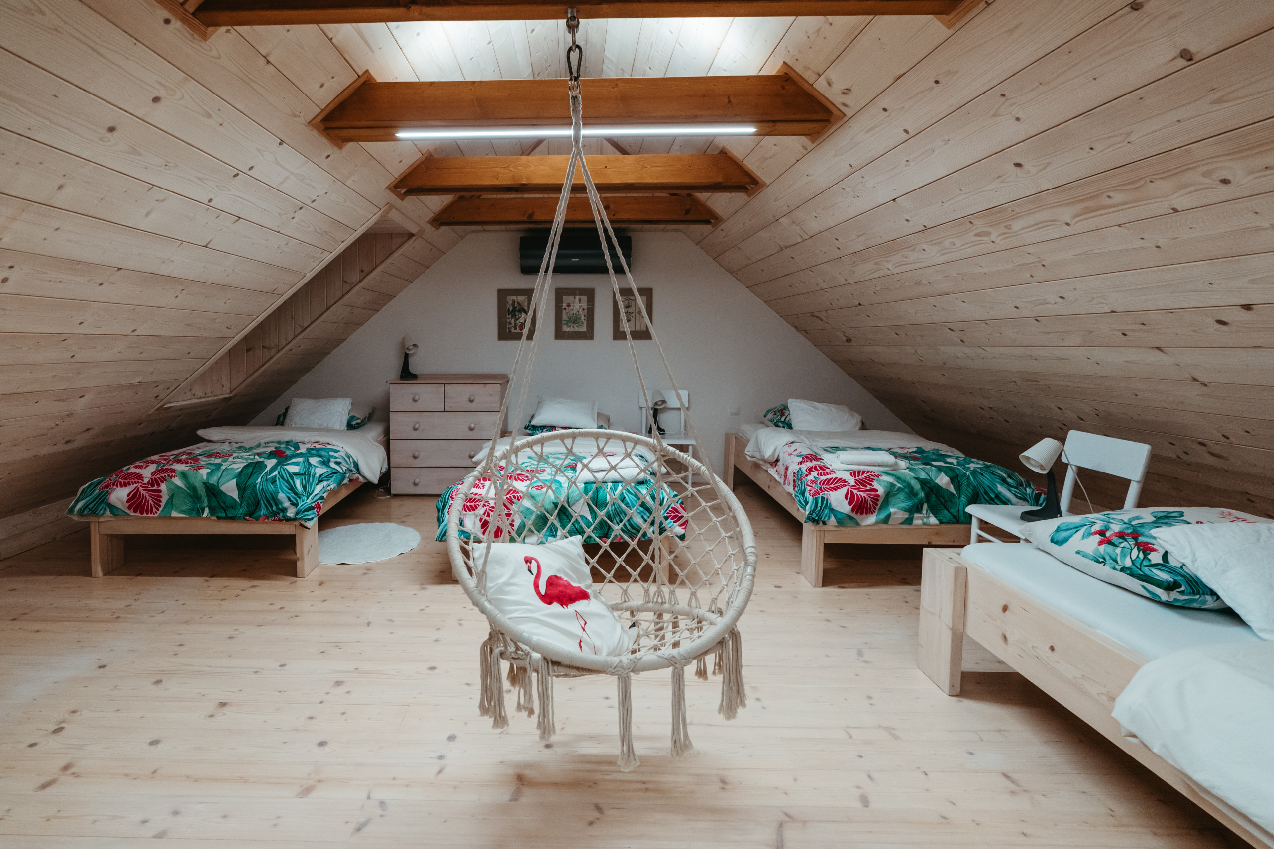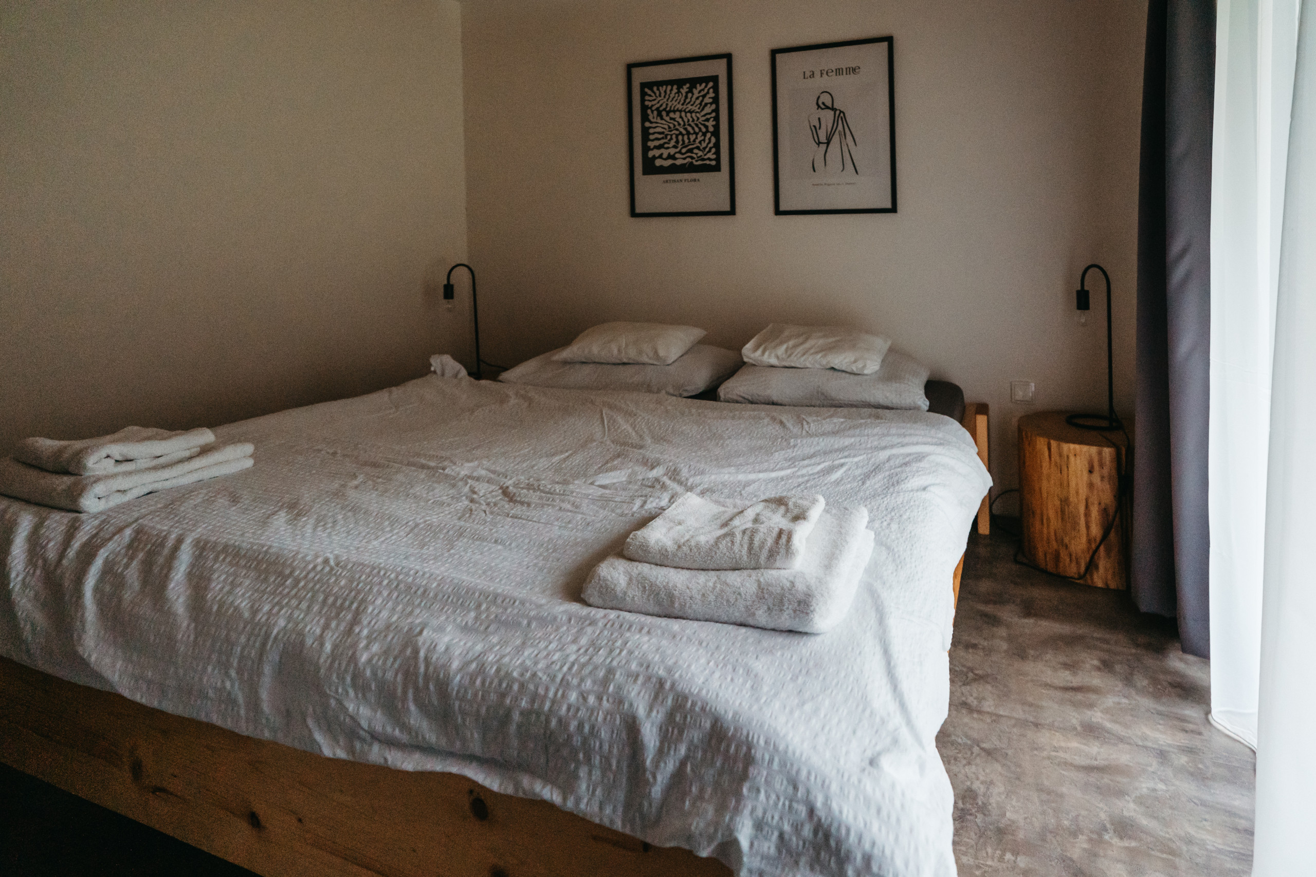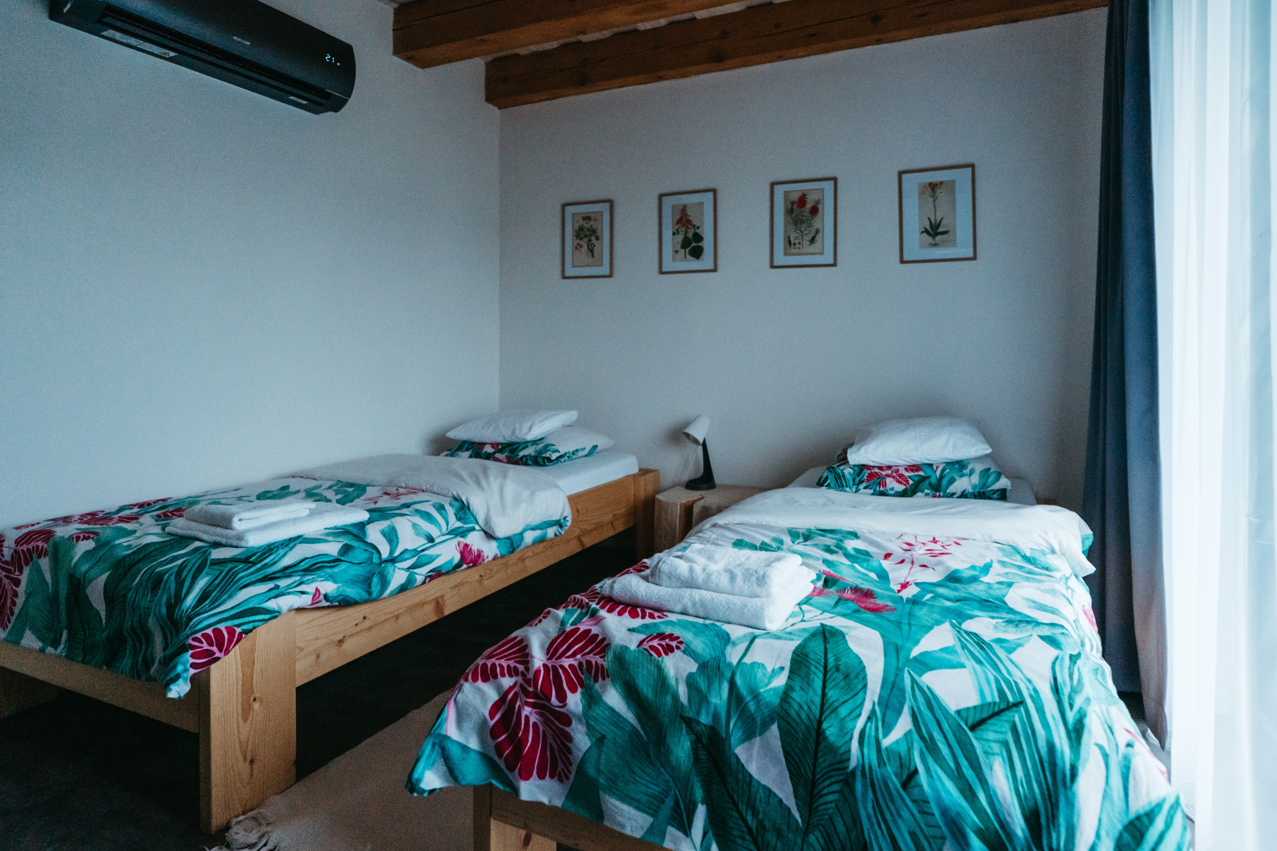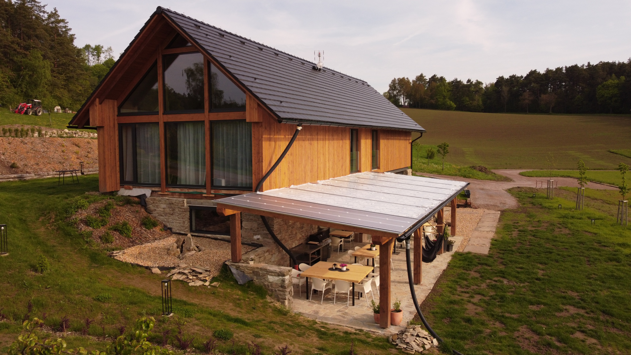 Each house is equipped with two bathrooms. One of the houses features bathrooms with bathtubs, while the other house has showers. In addition to the four bathrooms, there are also separate toilets, ensuring that it doesn't matter whether you are traveling with a large group or not. No queues will be formed. Both houses can accommodate up to 12 people and have their own terraces. Built in a modern style with light brown wooden tones, these houses are surrounded by an orchard. Inside, you can even catch a faint scent of wood, which truly gives you the feeling of being in the Czech countryside.