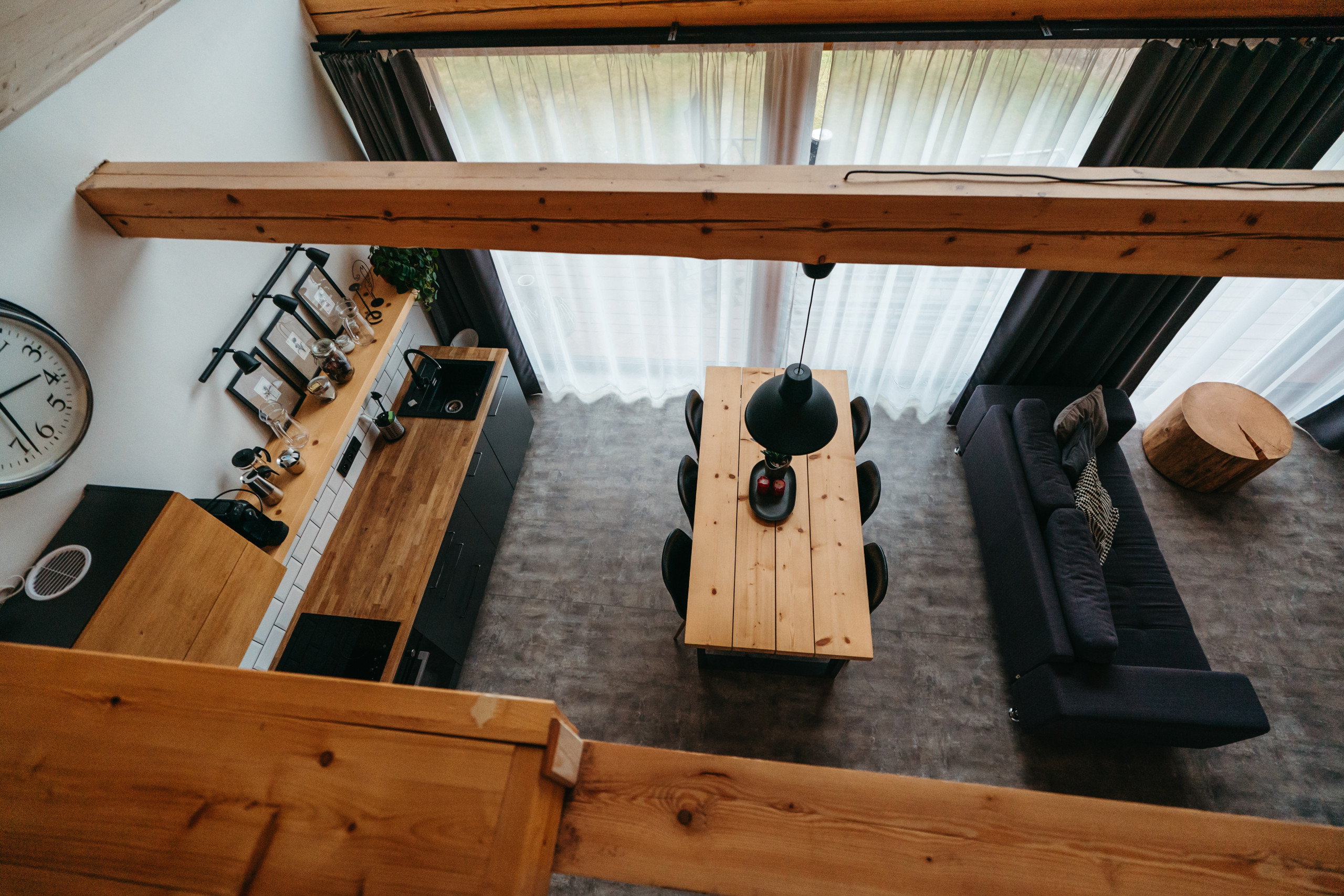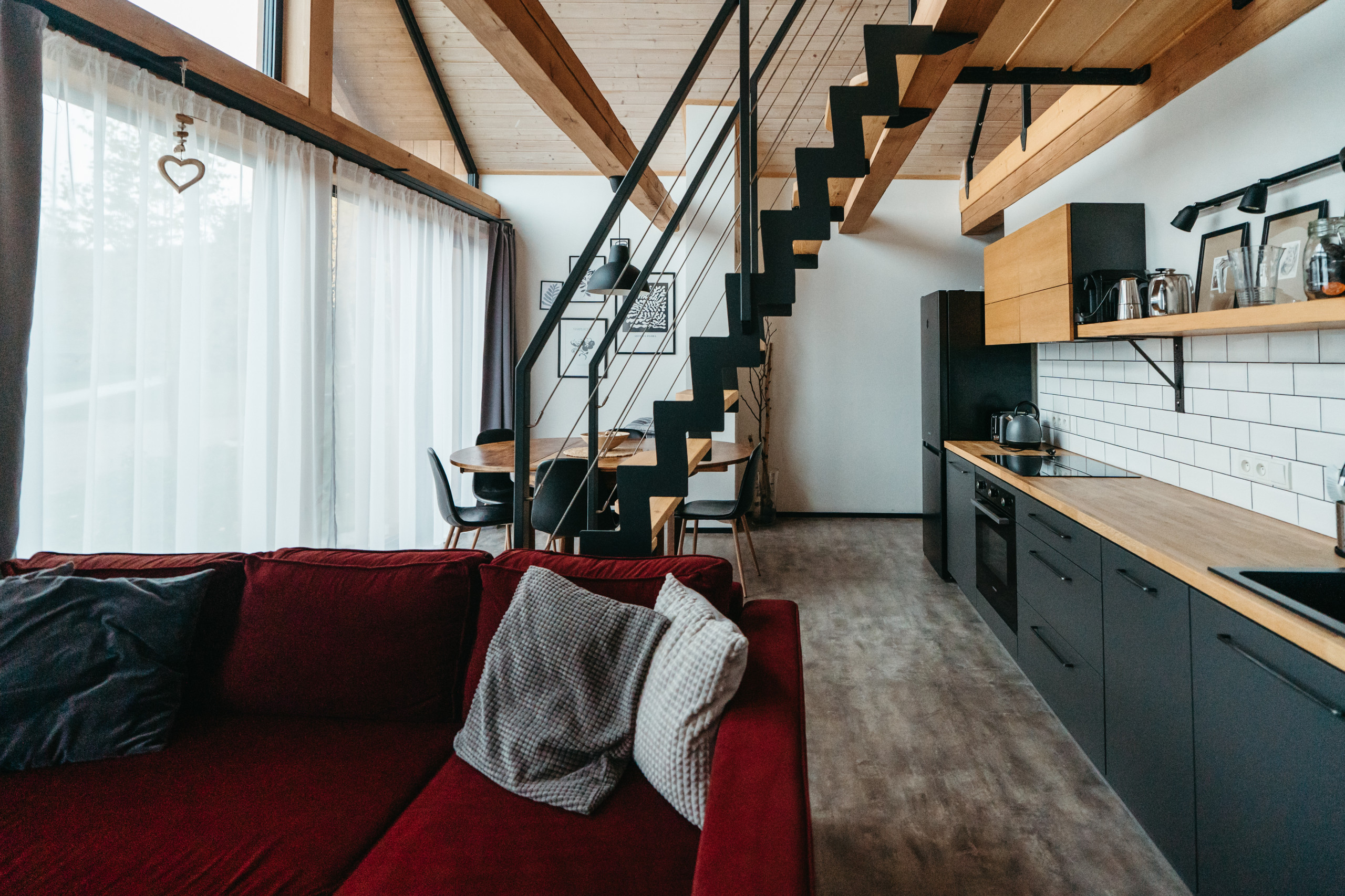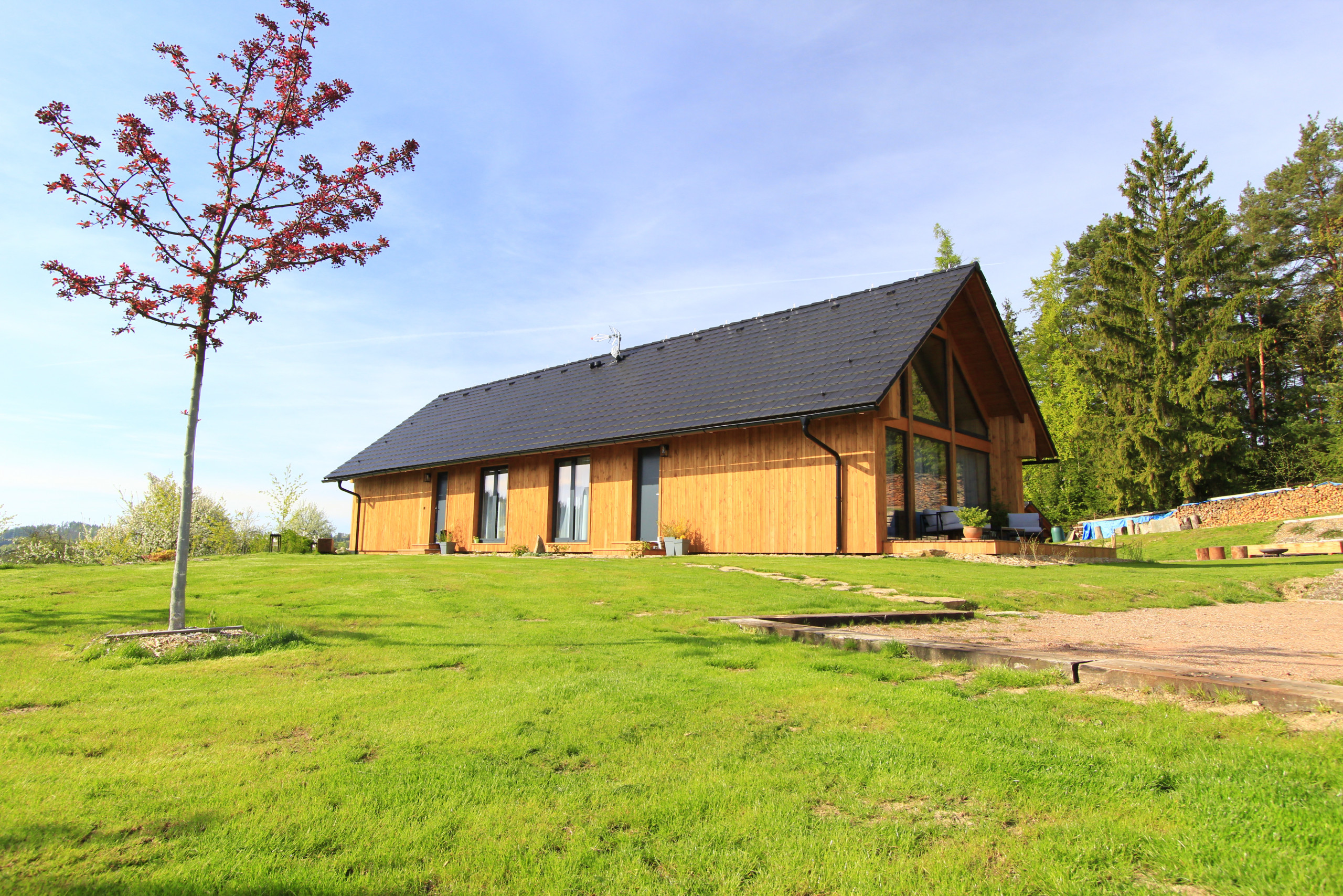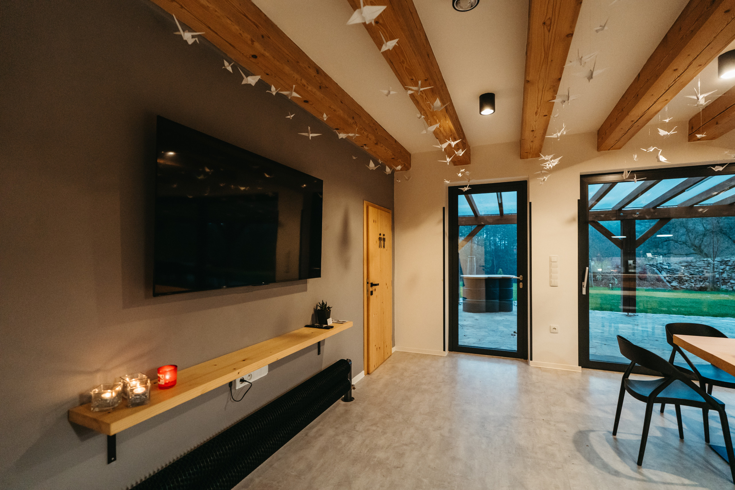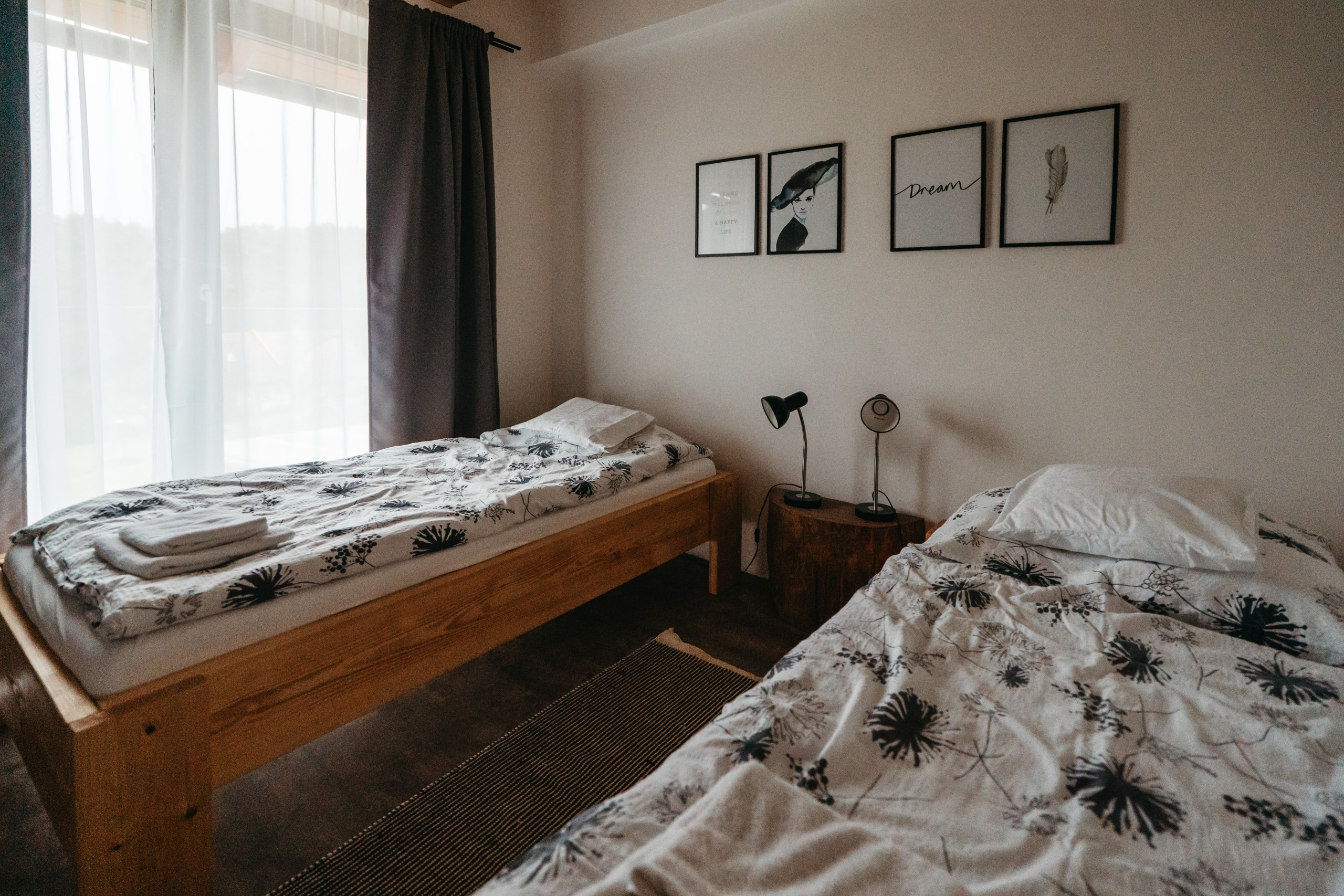 Each house is equipped with two bathrooms. One of the houses features bathrooms with bathtubs, while the other house has showers. In addition to the four bathrooms, there are also separate toilets, ensuring that it doesn't matter whether you are traveling with a large group or not. No queues will be formed. Both houses can accommodate up to 12 people and have their own terraces. Built in a modern style with light brown wooden tones, these houses are surrounded by an orchard. Inside, you can even catch a faint scent of wood, which truly gives you the feeling of being in the Czech countryside.