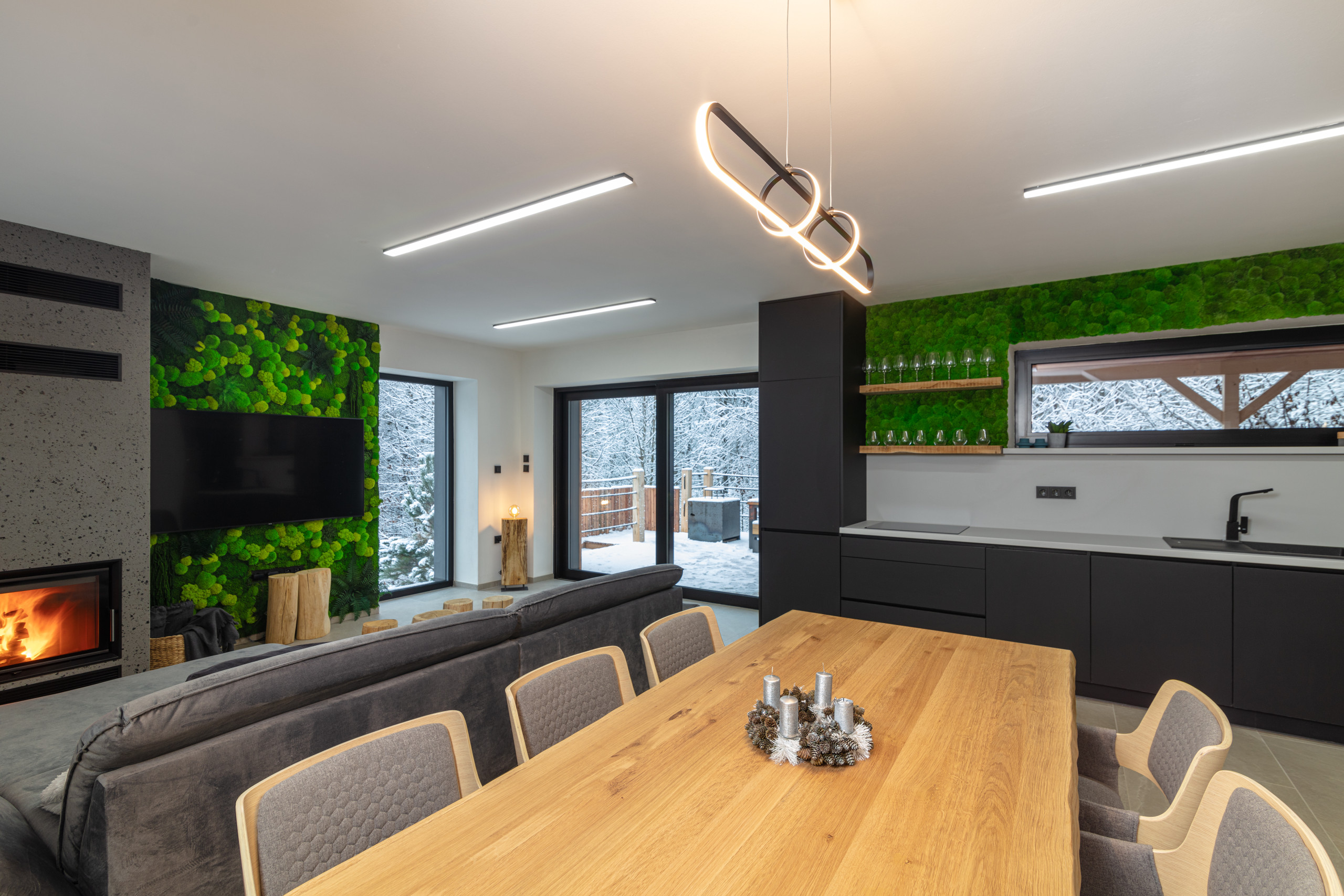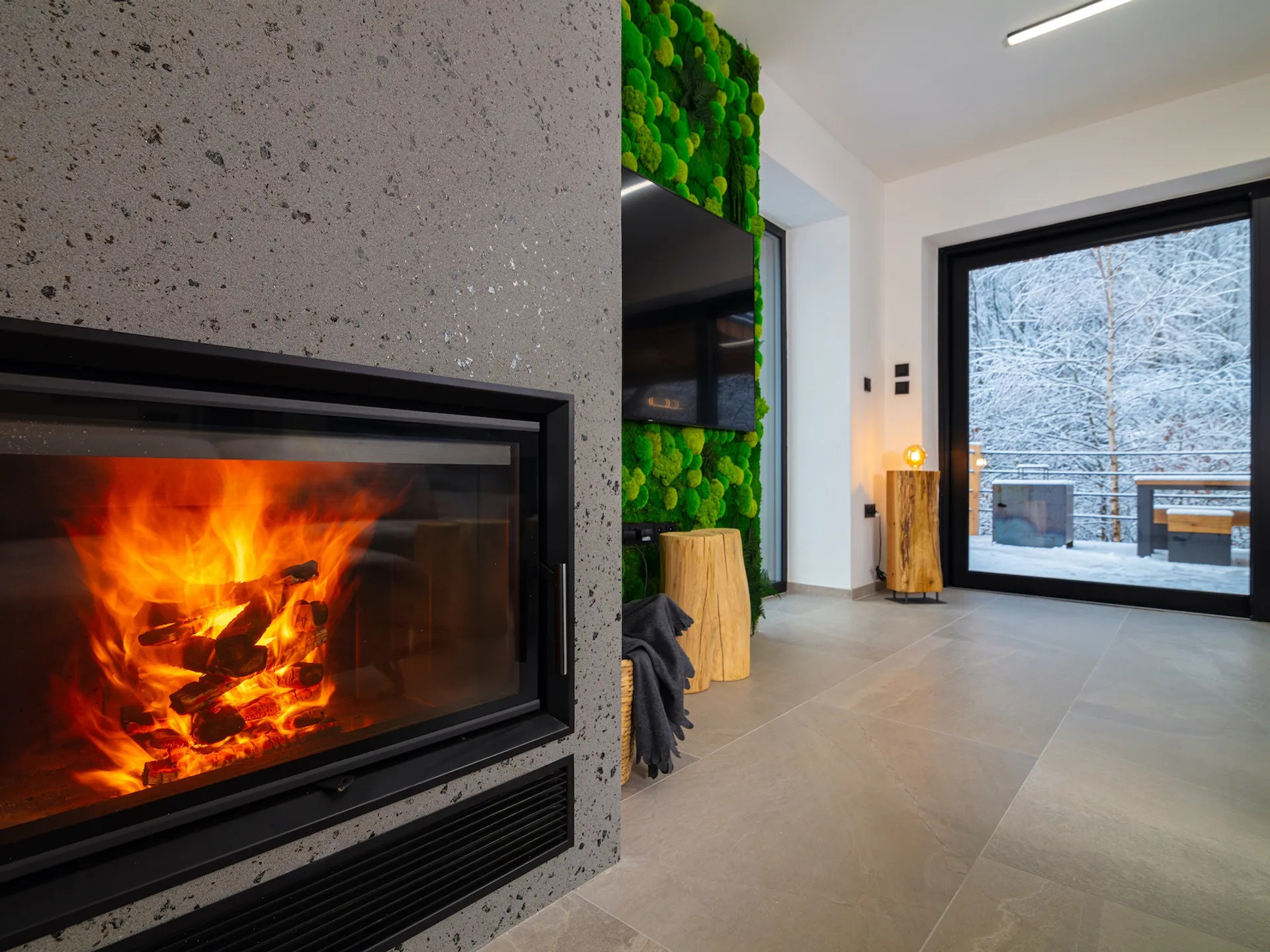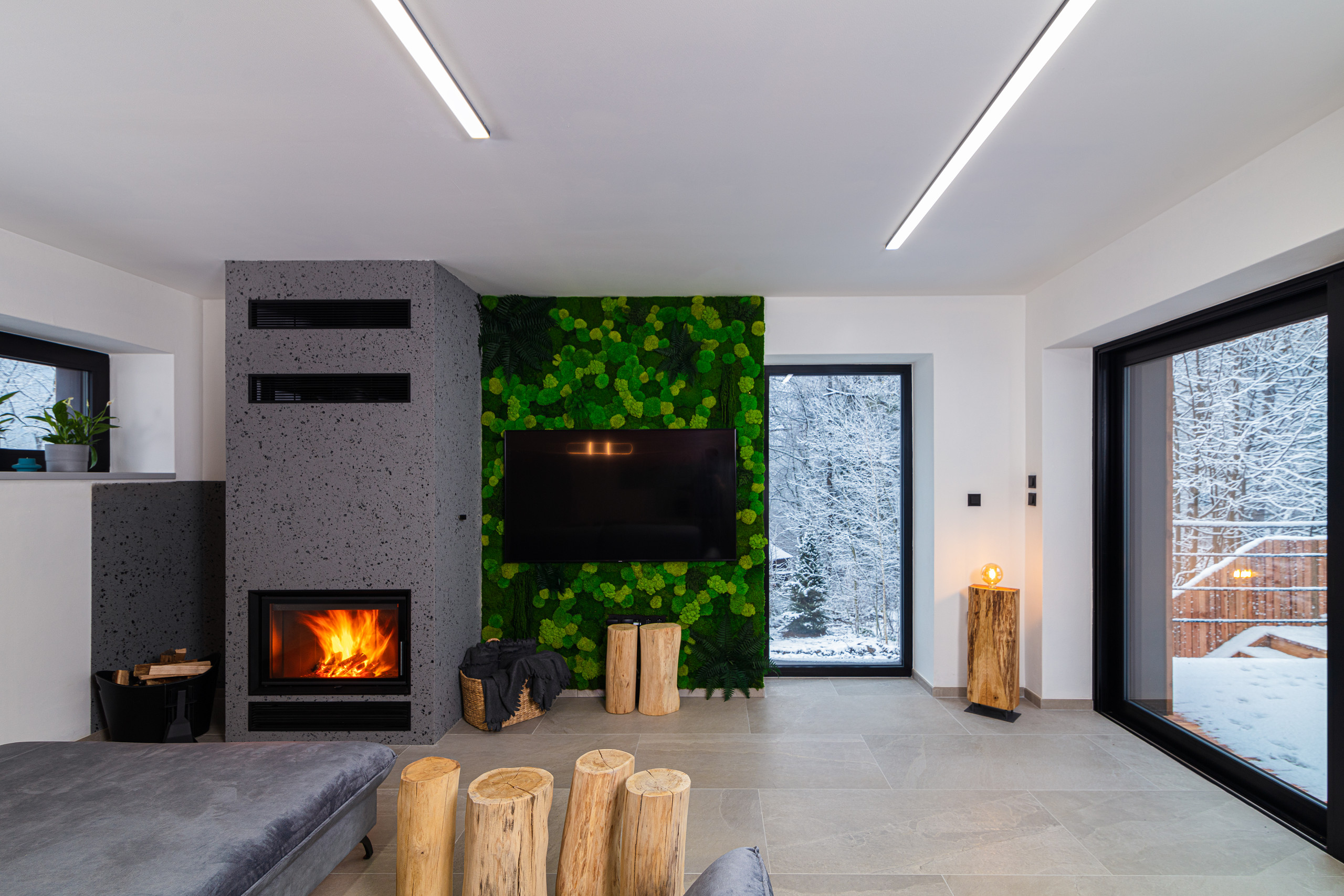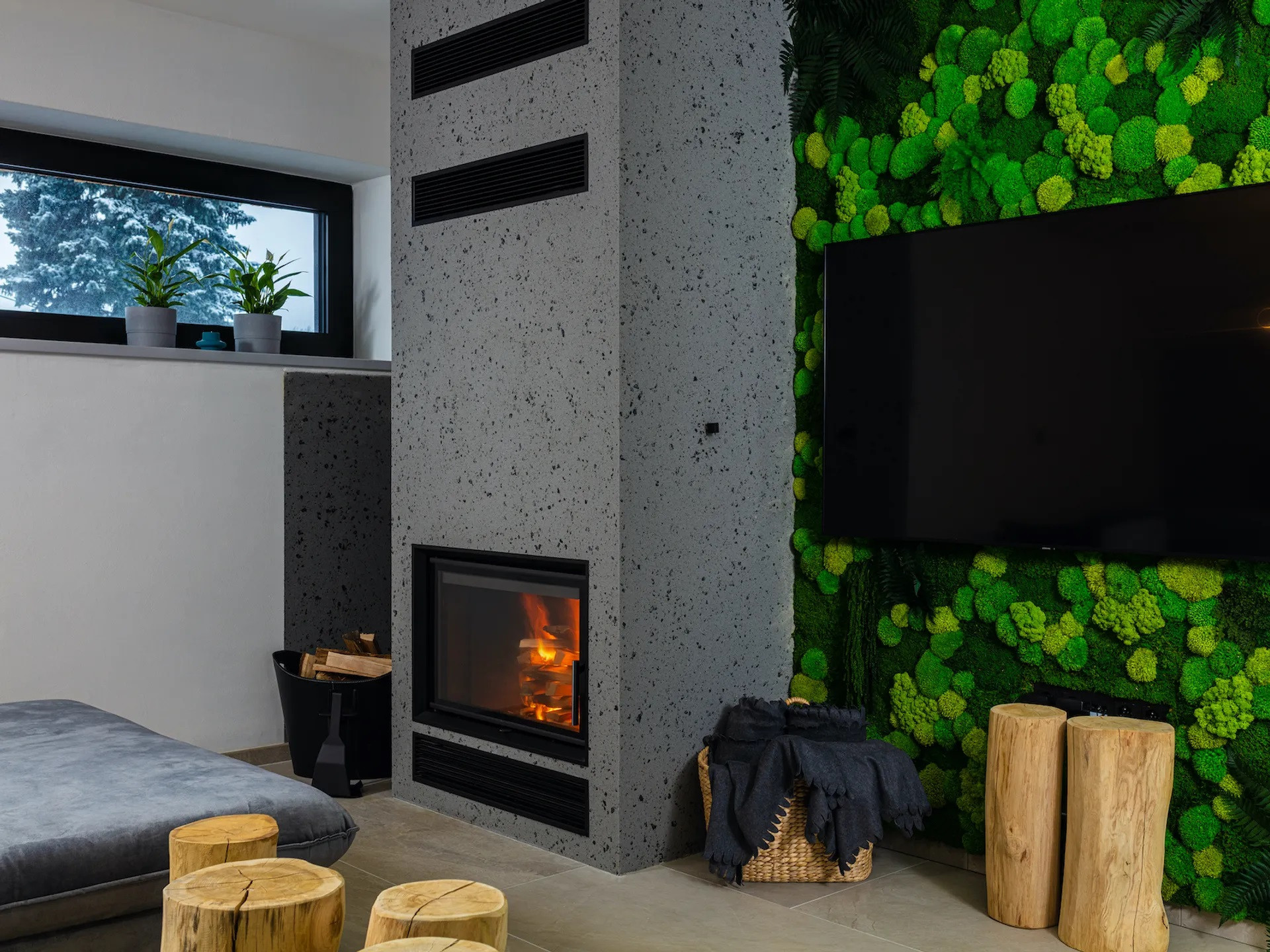 Inside, it’s stylish and comfortable, with warm floors under your feet, a cosy living room with fireplace, and a striking moss wall. The kitchen is fully equipped. Upstairs you’ll find two atmospheric bedrooms and a spacious bathroom – perfect for families or a group of friends enjoying a holiday together.