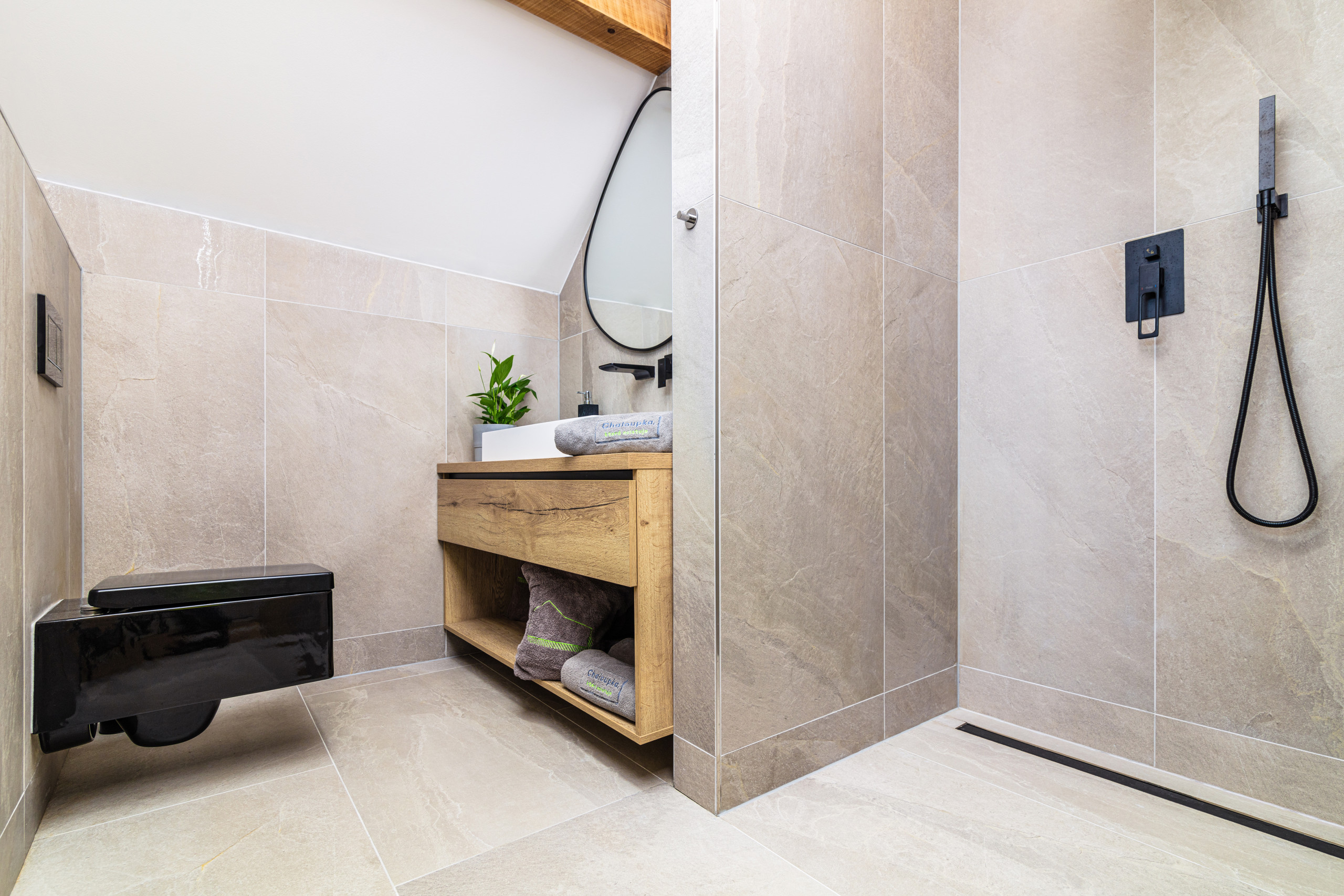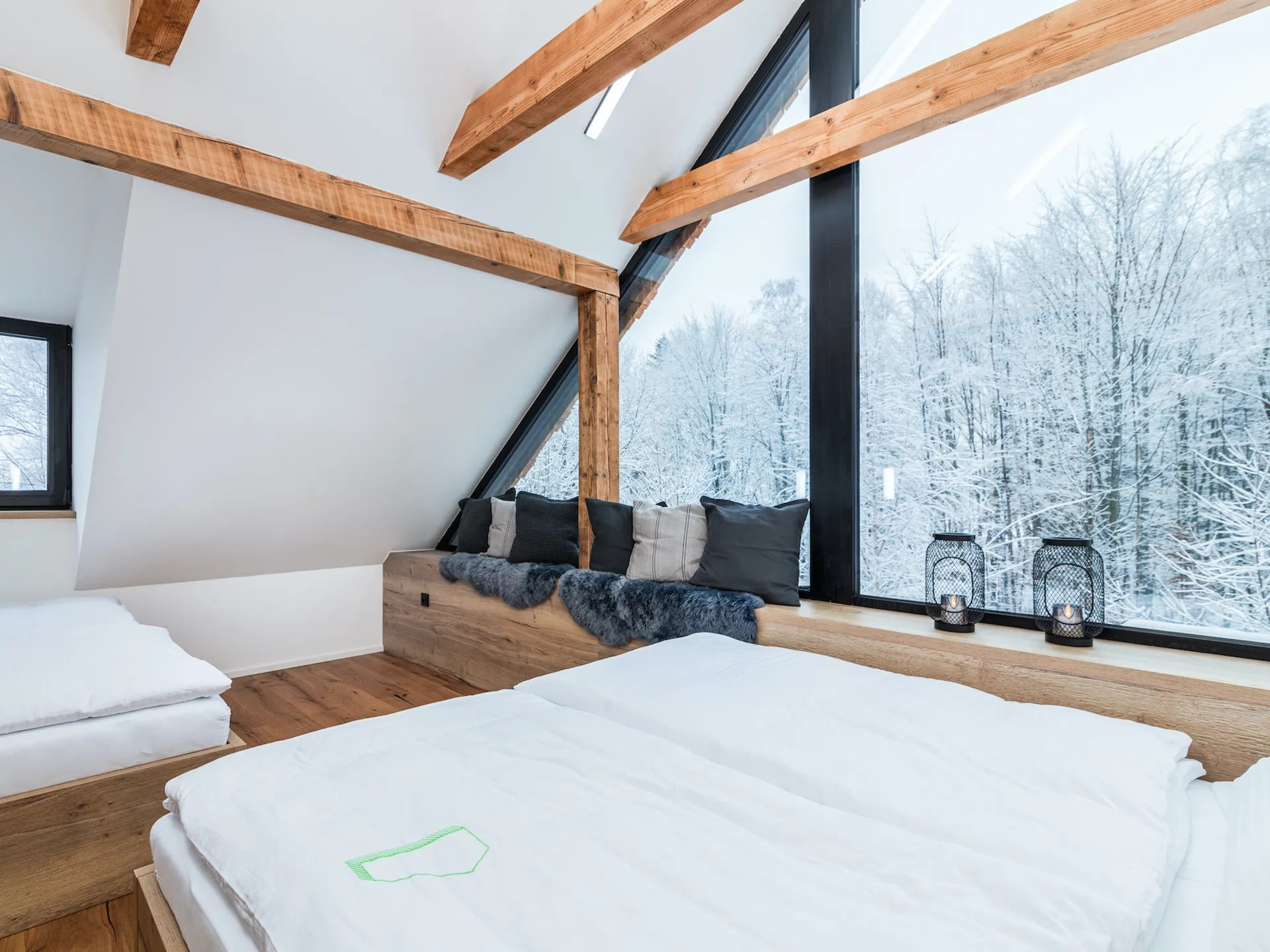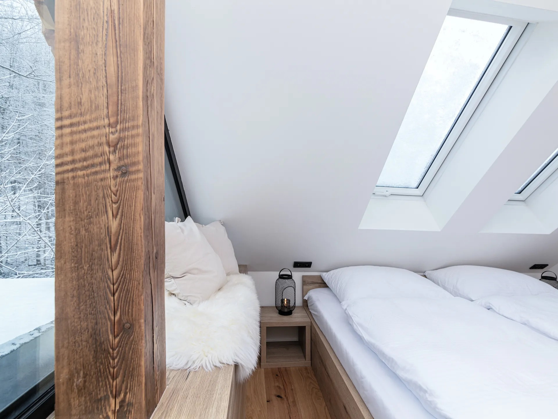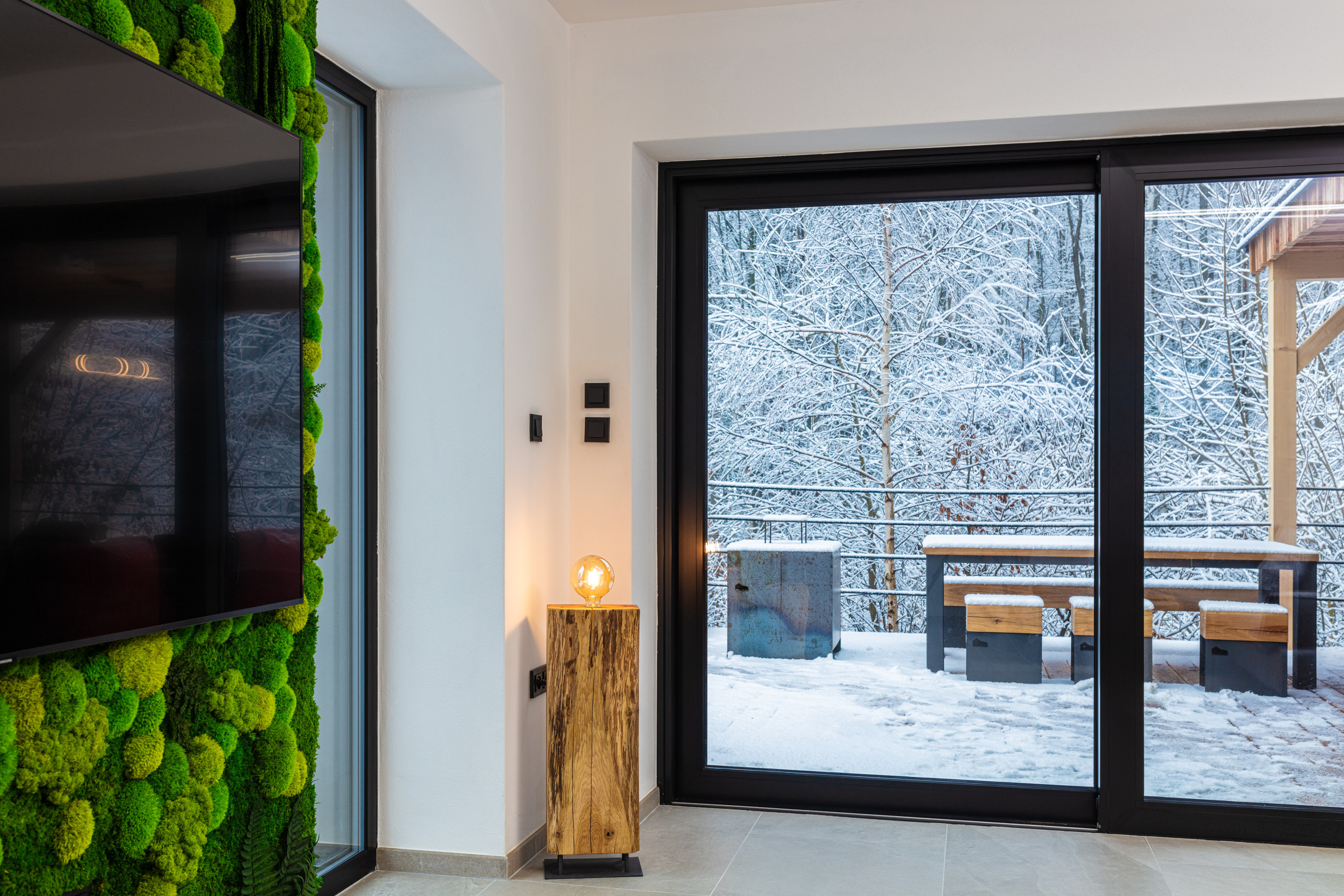 Inside, it’s stylish and comfortable, with warm floors under your feet, a cosy living room with fireplace, and a striking moss wall. The kitchen is fully equipped. Upstairs you’ll find two atmospheric bedrooms and a spacious bathroom – perfect for families or a group of friends enjoying a holiday together.