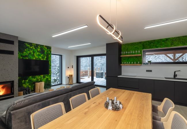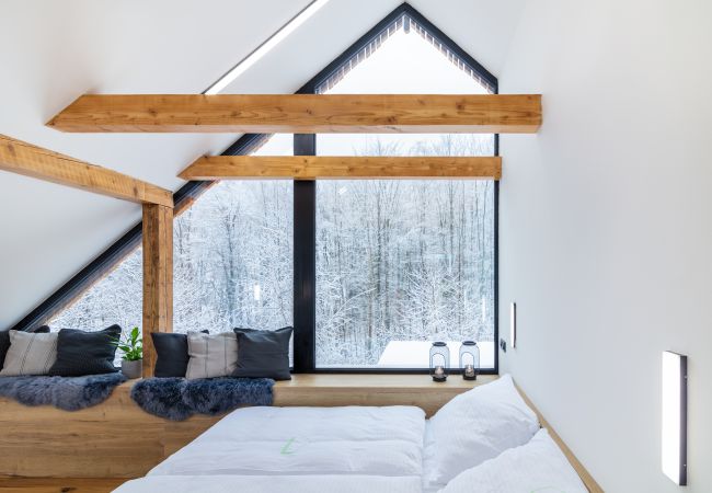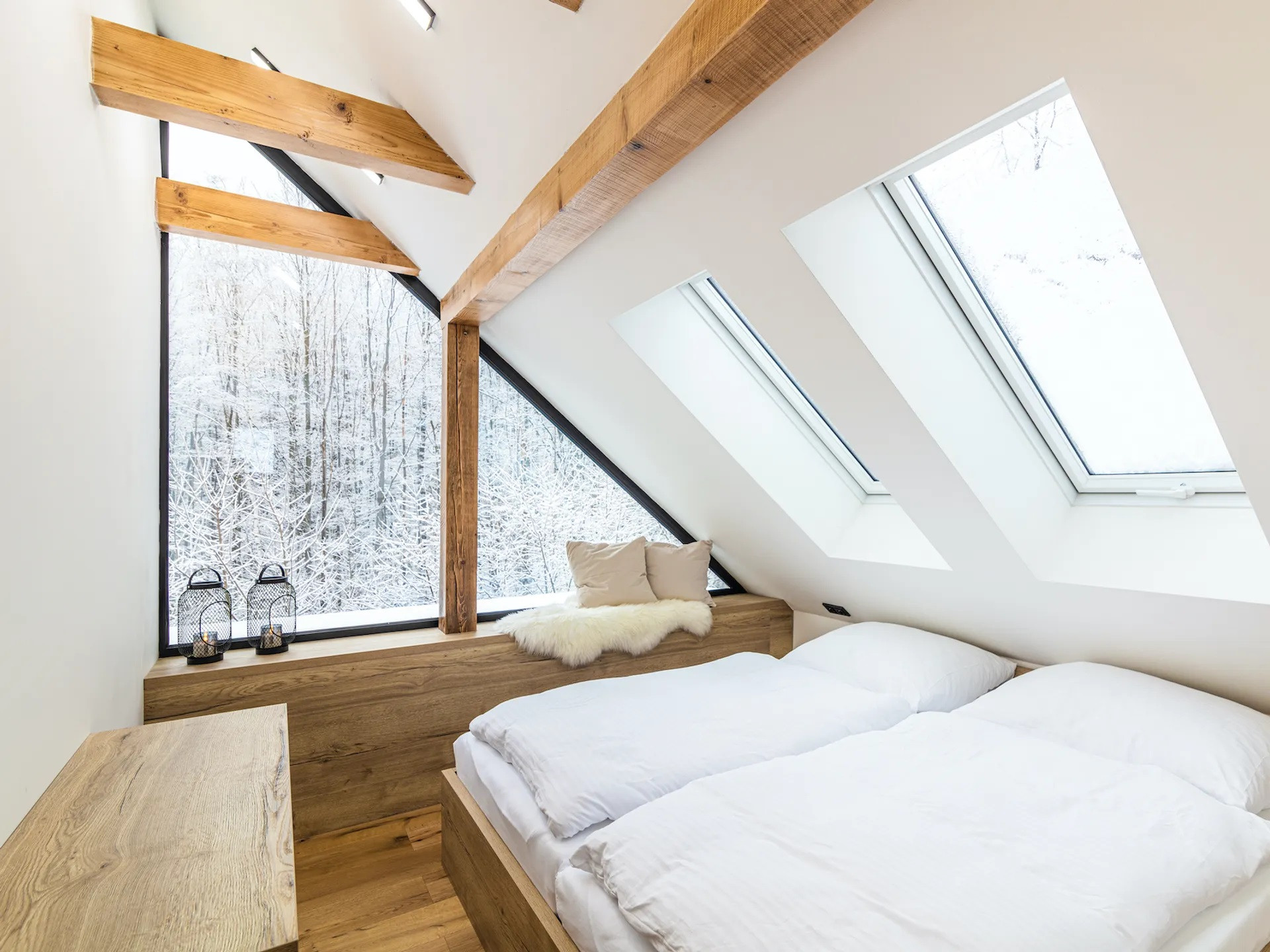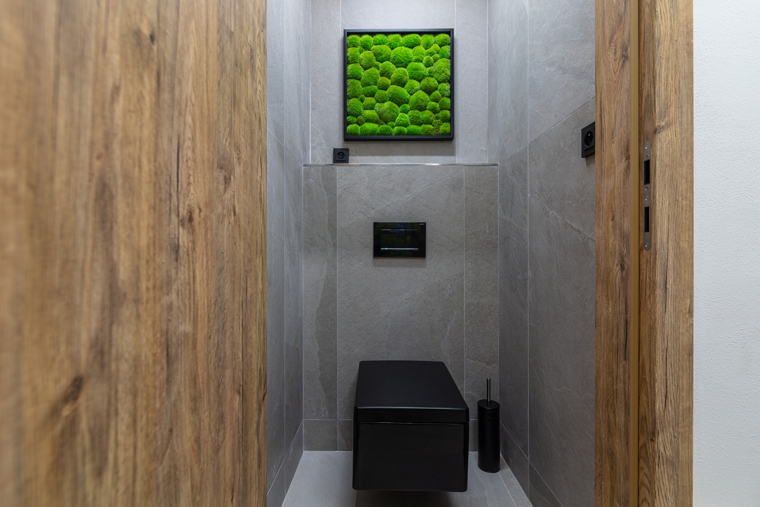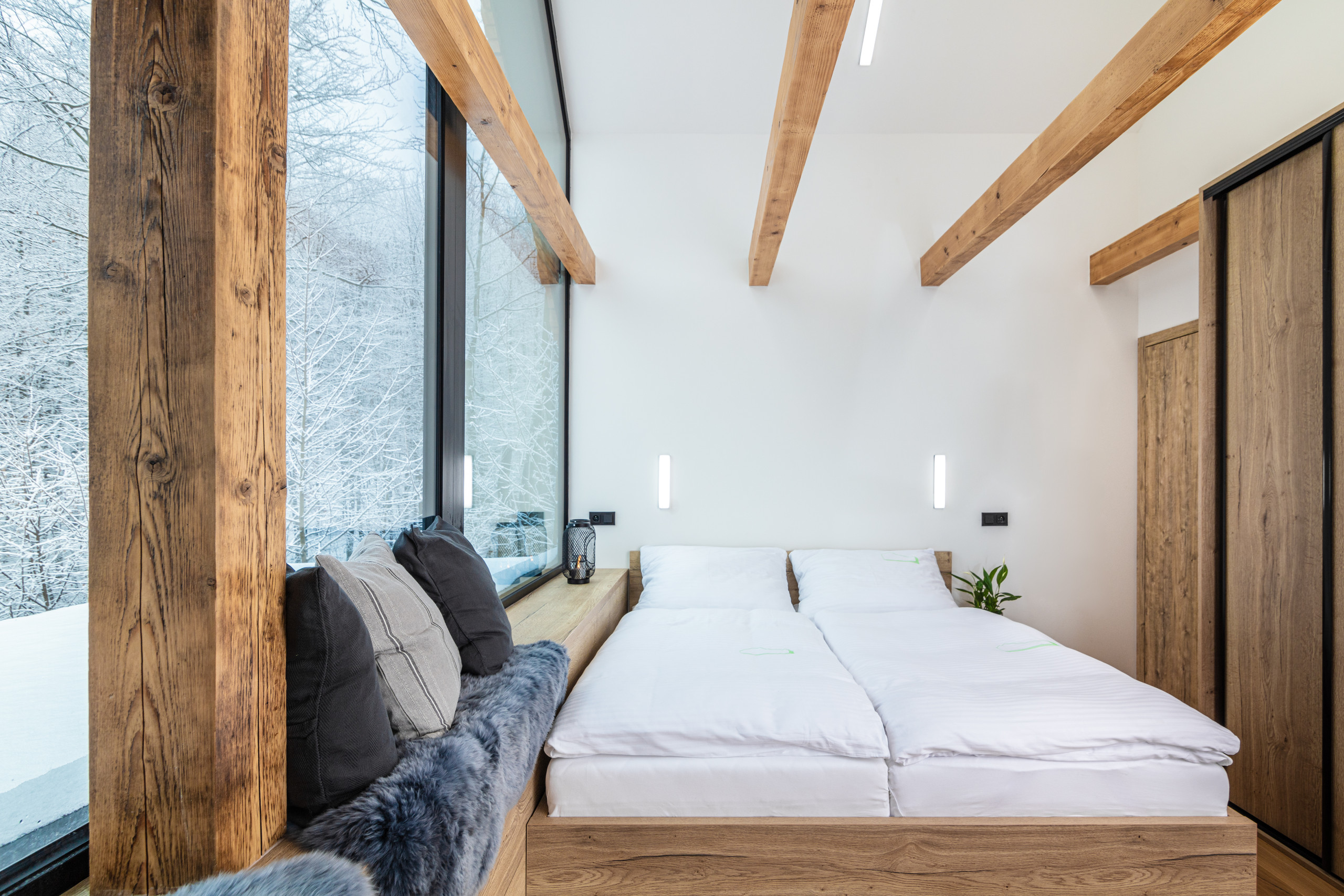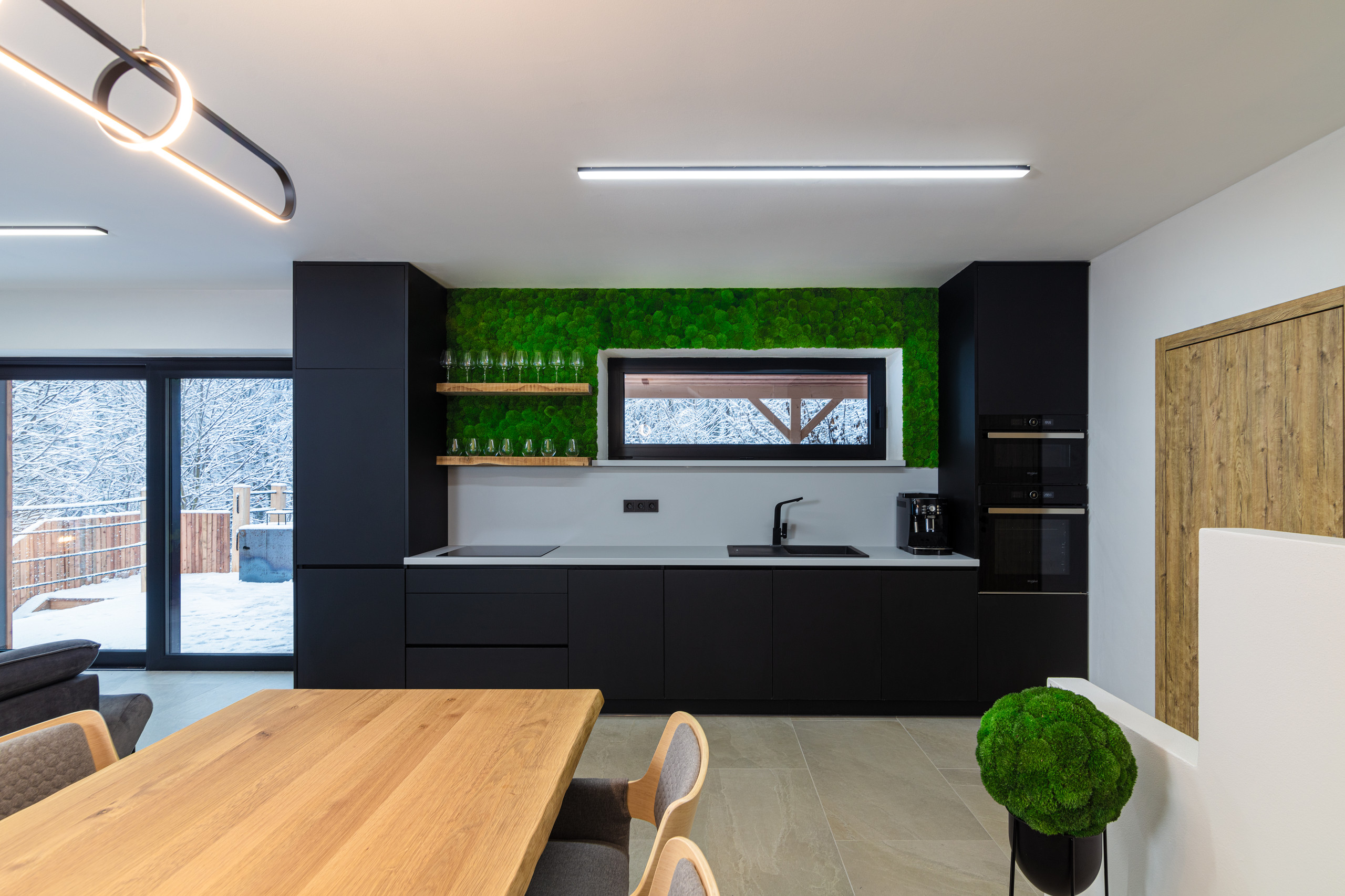 Inside, it’s stylish and comfortable, with warm floors under your feet, a cosy living room with fireplace, and a striking moss wall. The kitchen is fully equipped. Upstairs you’ll find two atmospheric bedrooms and a spacious bathroom – perfect for families or a group of friends enjoying a holiday together.