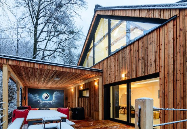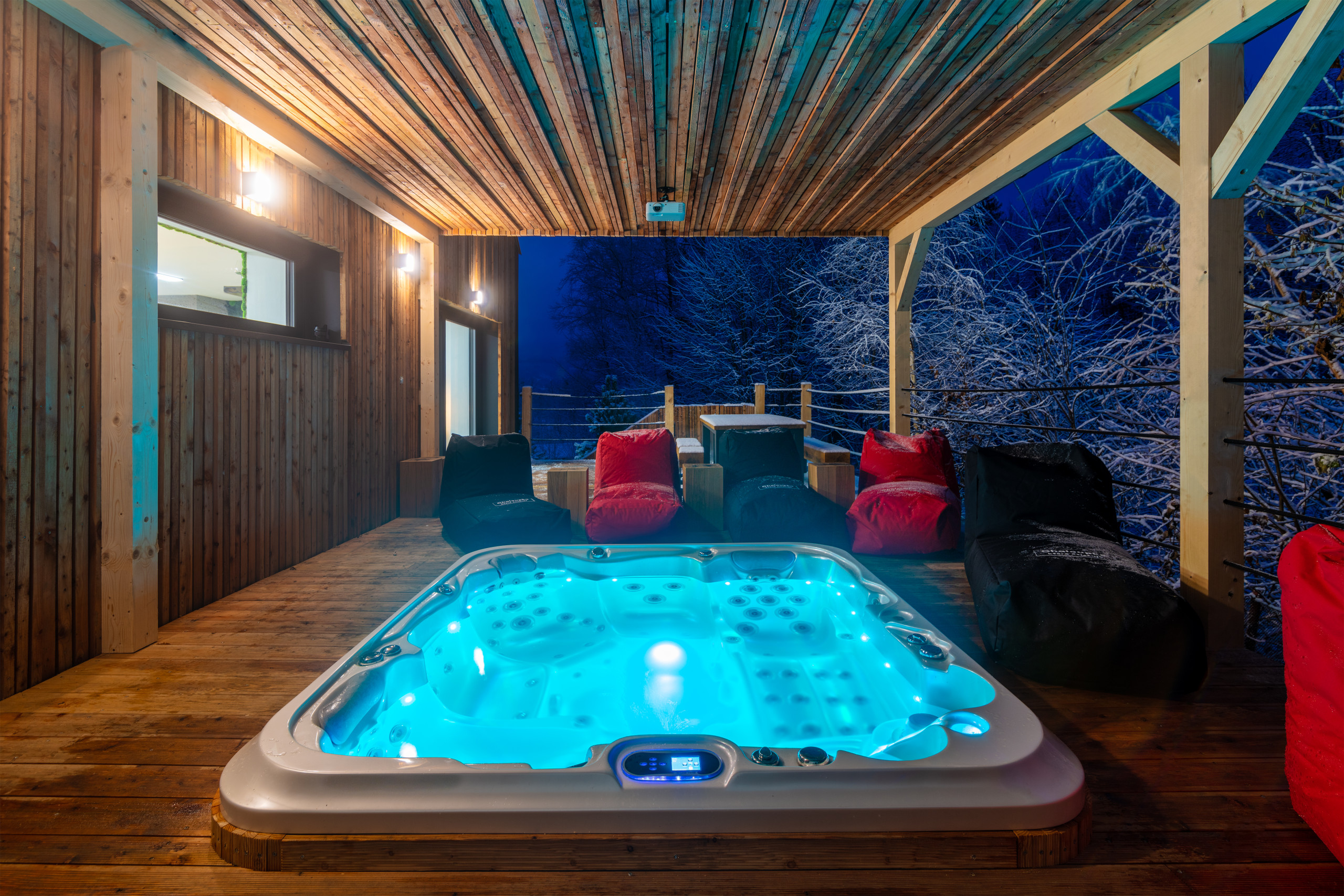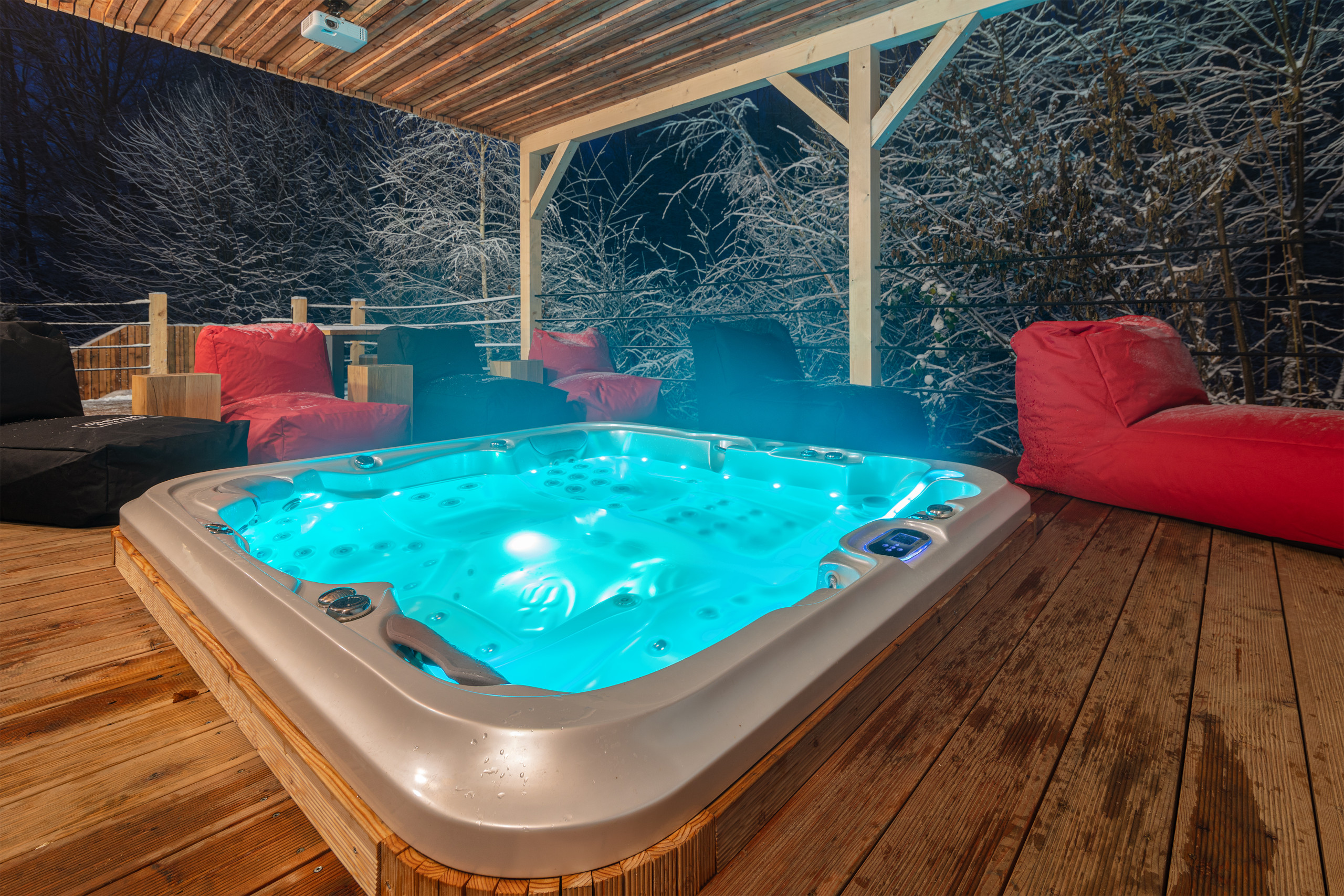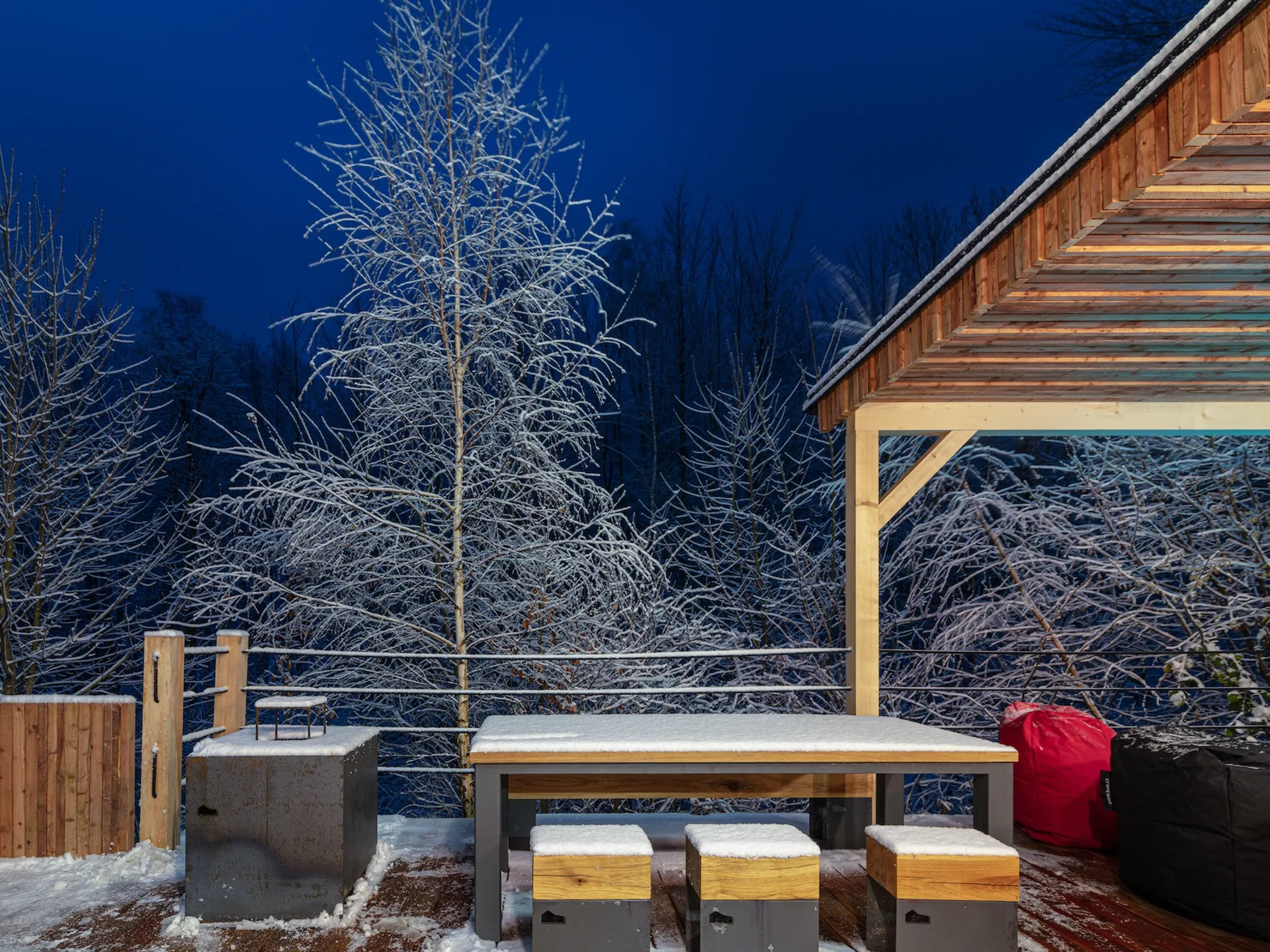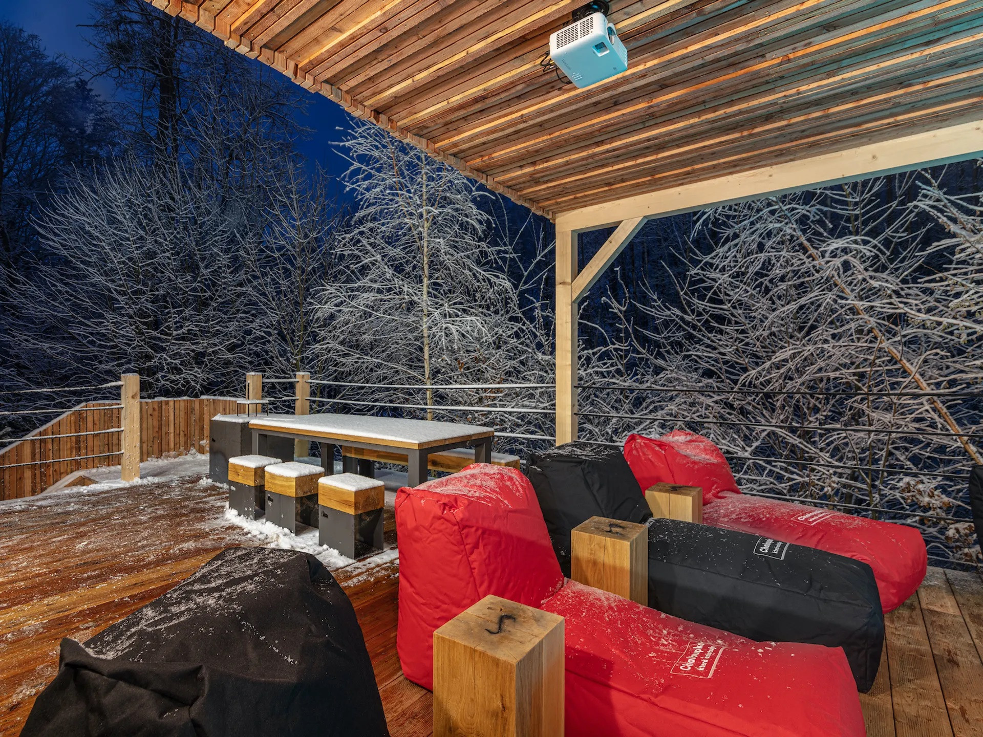 Outside, a large terrace awaits with a luxurious covered whirlpool for five. You’ll be comfortable here in any weather. There’s a wood-fired grill, a large wooden dining table, and a fire pit for long evenings under the stars. And that outdoor cinema screen... grab a blanket, pour a drink, and your night is set.