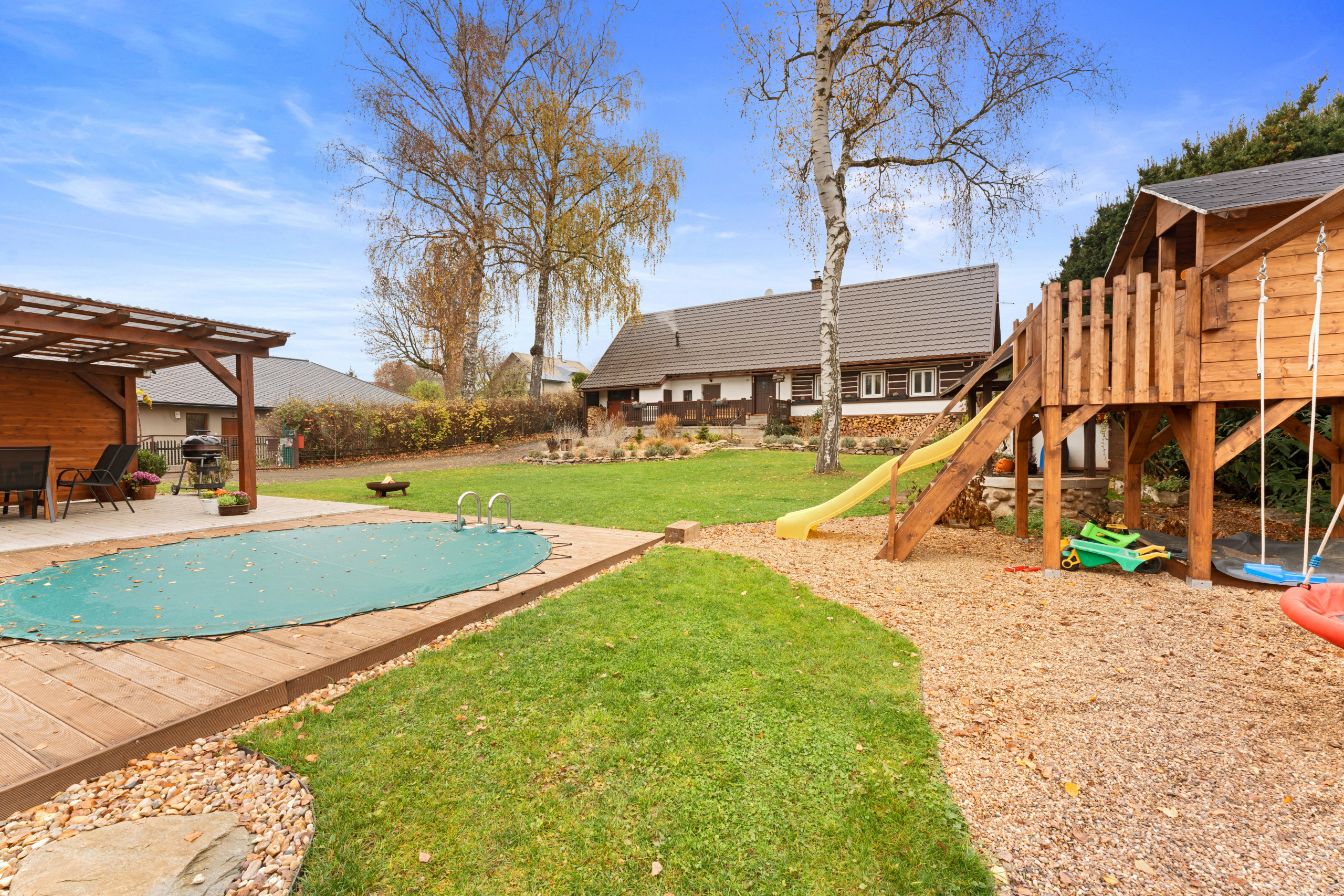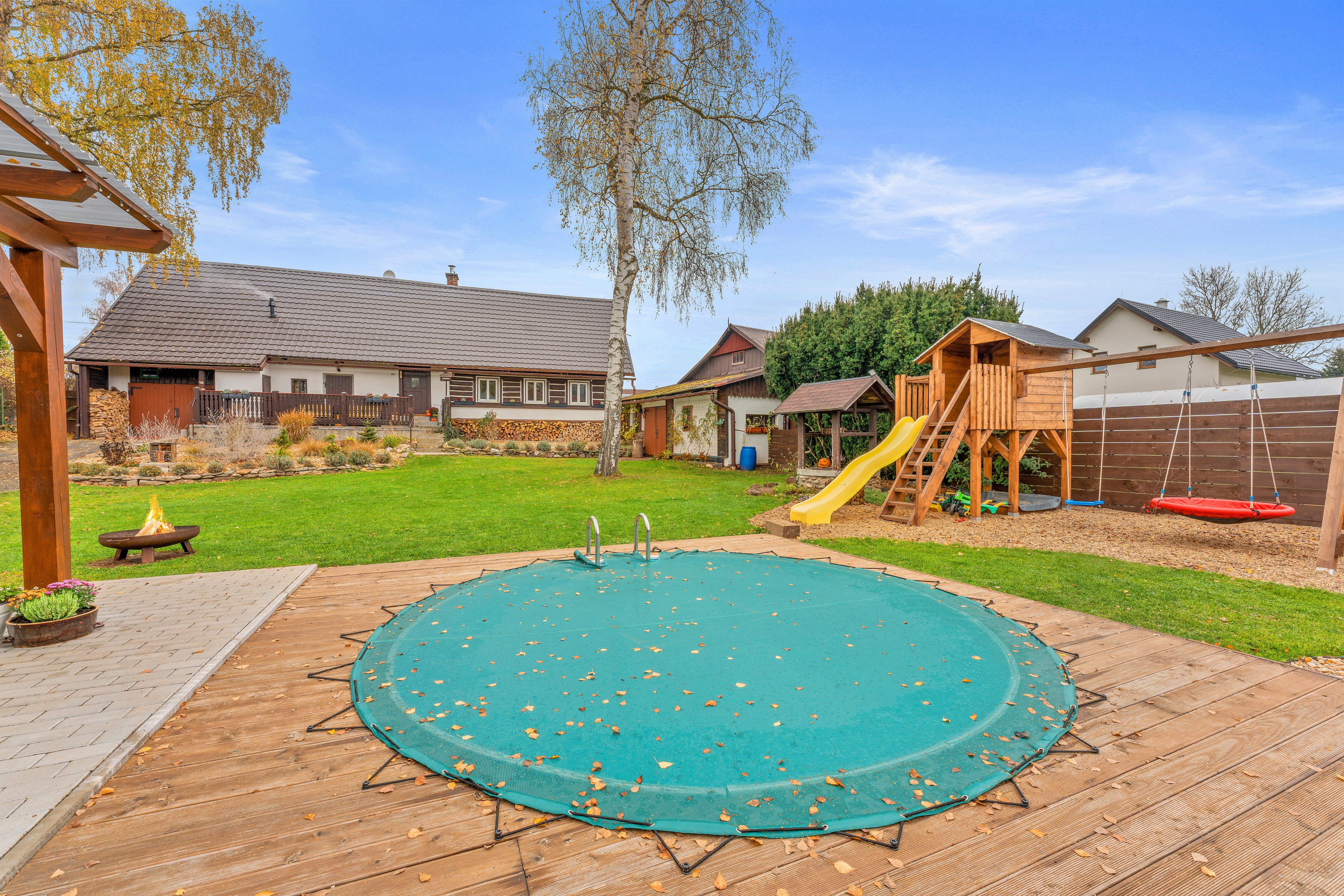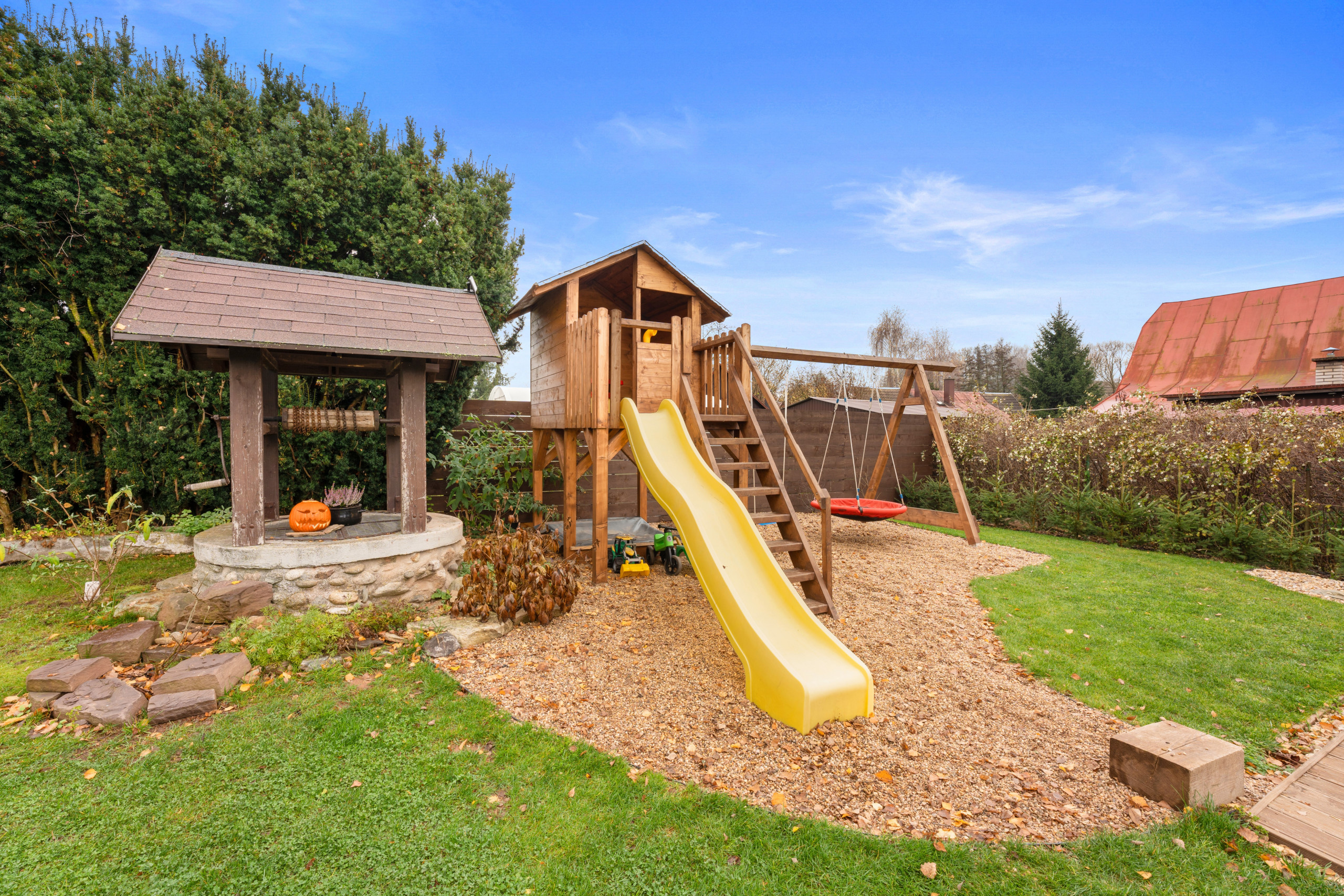 A true highlight is the private outdoor pool, perfect for cooling off after a day full of adventure, and the luxurious jacuzzi where you can unwind in style. The large, fenced garden is a safe space where children and pets can play freely. There’s even a dedicated play area with a slide, swing, and trampoline – perfect for the little ones. On the spacious terrace, you can enjoy the sunshine while keeping an eye on your playful company.