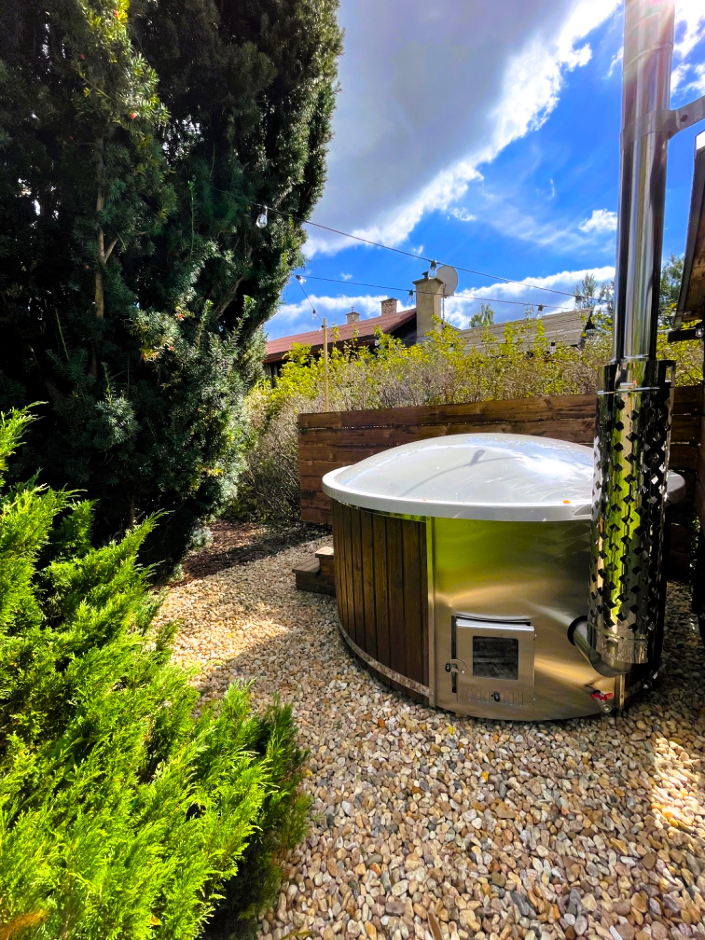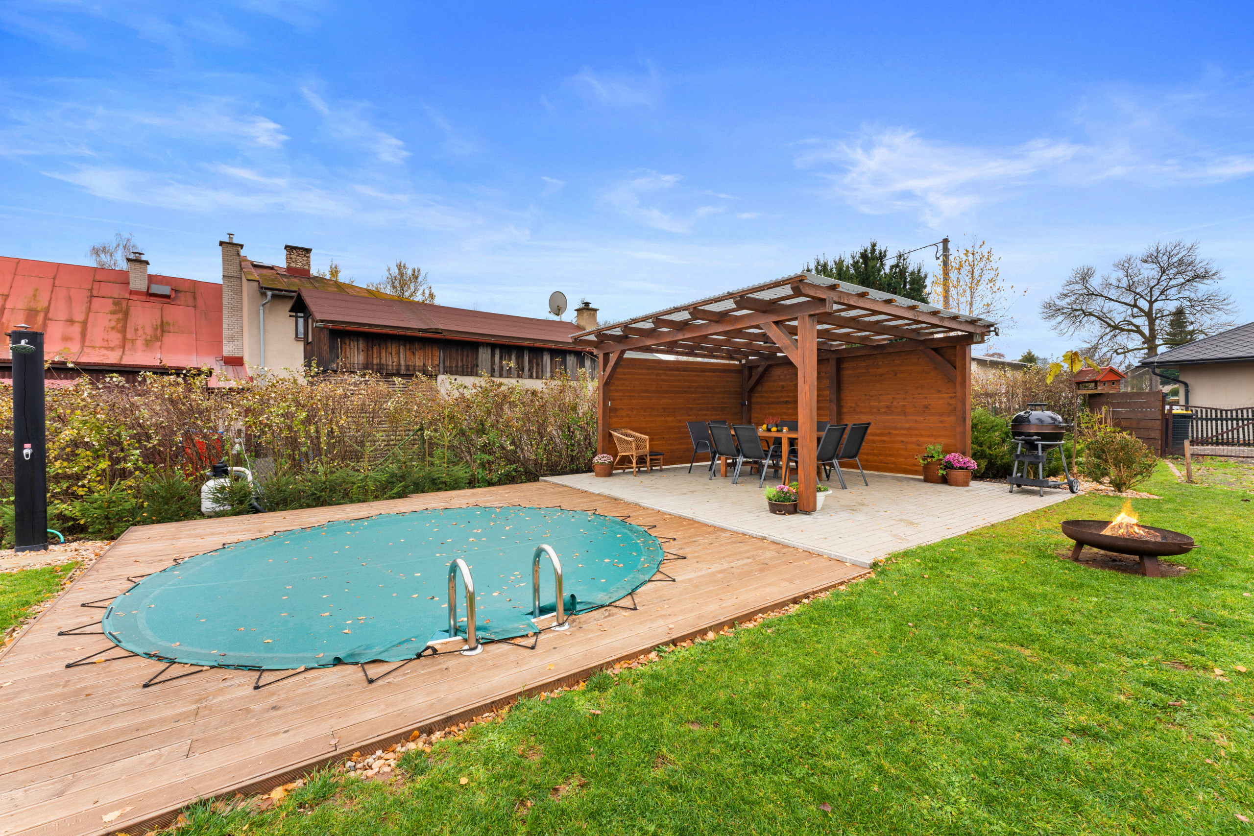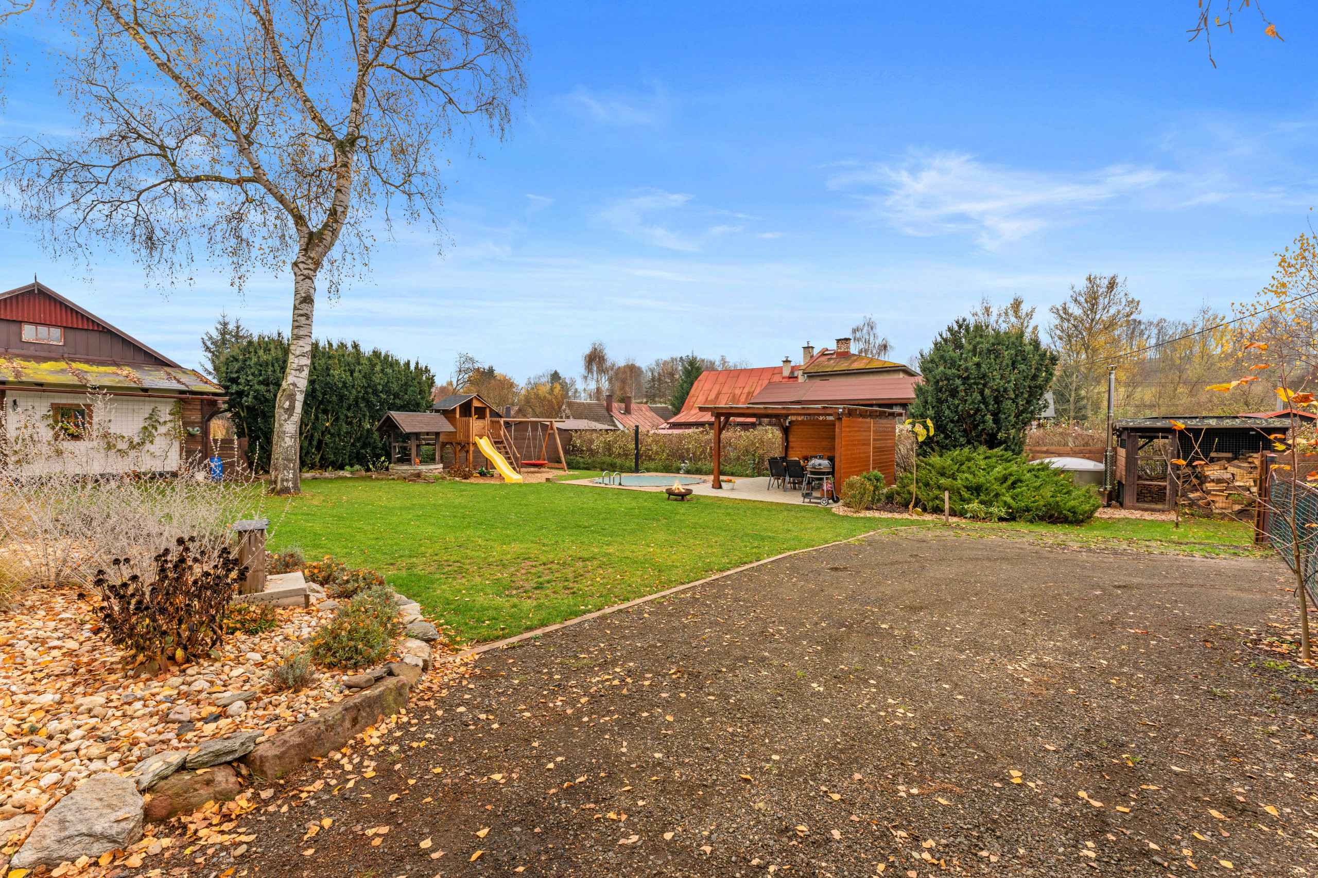 A true highlight is the private outdoor pool, perfect for cooling off after a day full of adventure, and the luxurious jacuzzi where you can unwind in style. The large, fenced garden is a safe space where children and pets can play freely. There’s even a dedicated play area with a slide, swing, and trampoline – perfect for the little ones. On the spacious terrace, you can enjoy the sunshine while keeping an eye on your playful company.