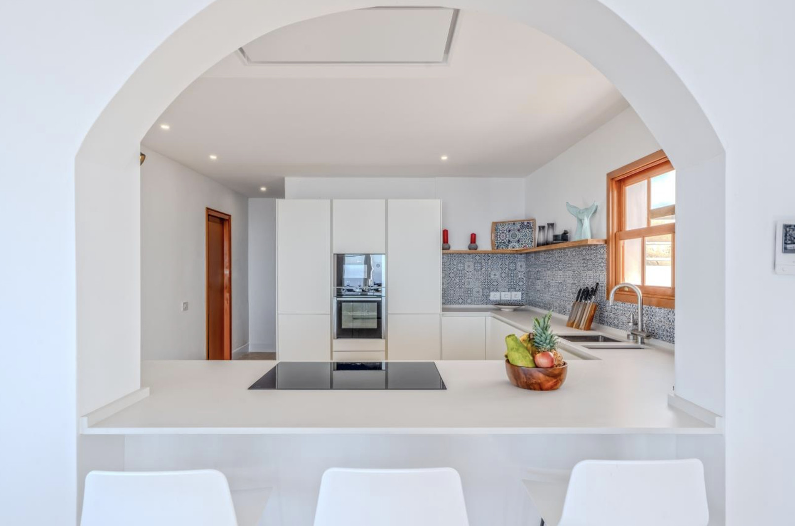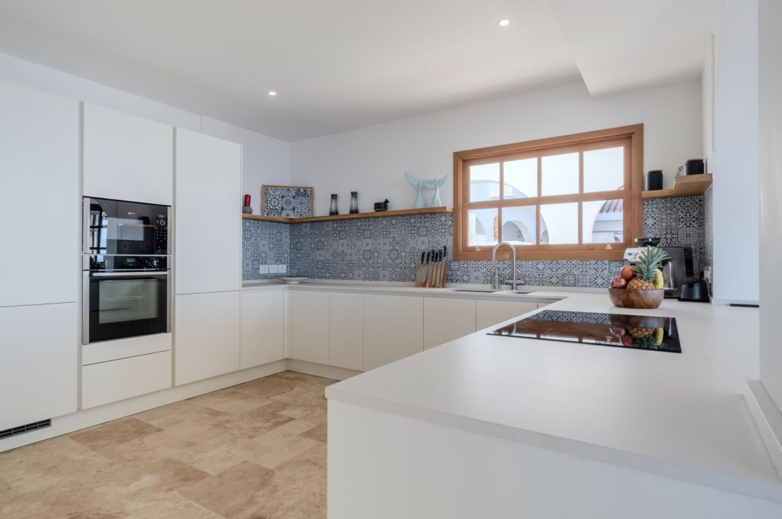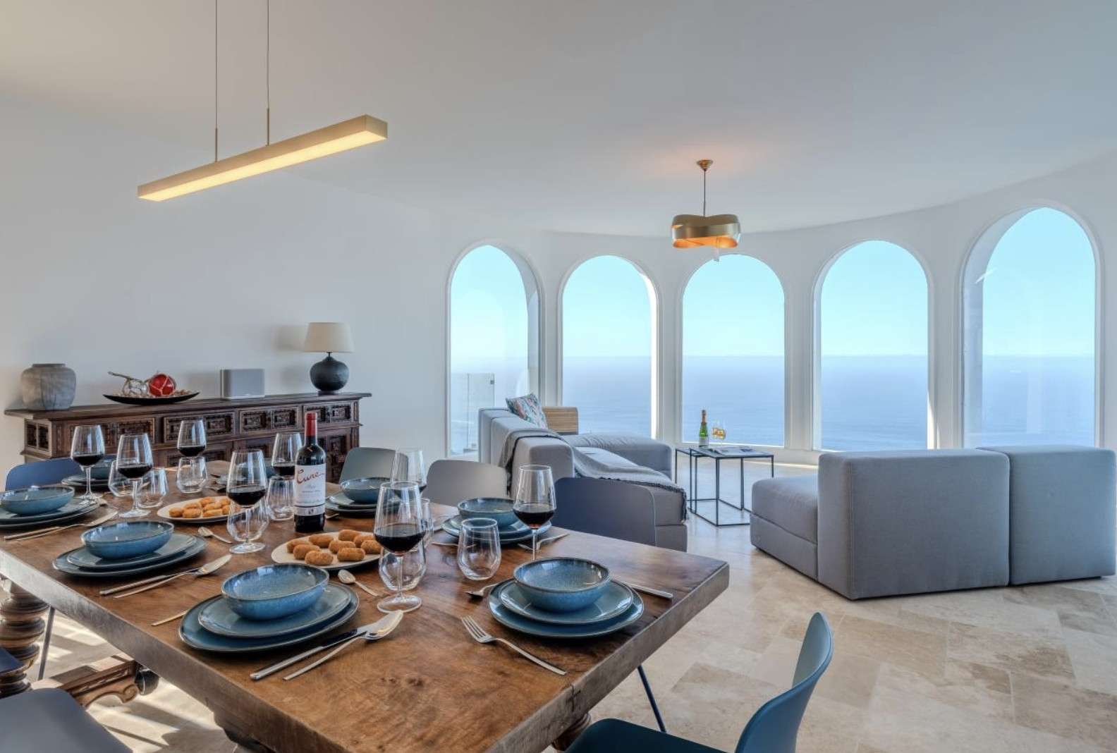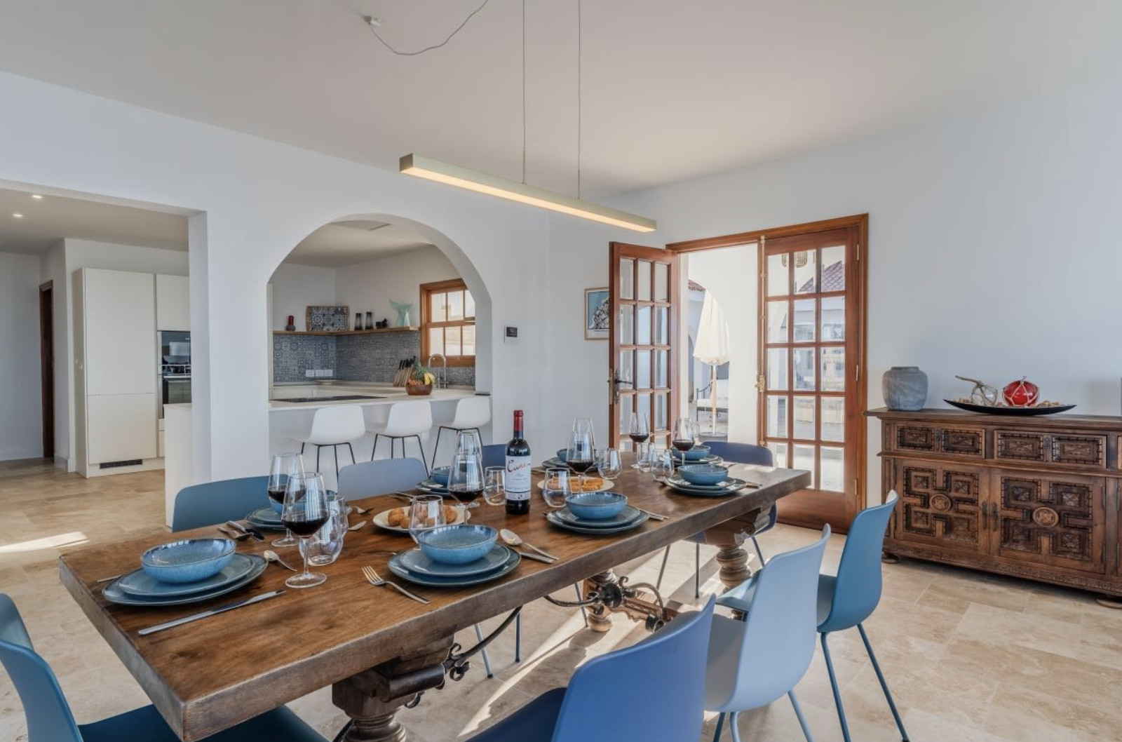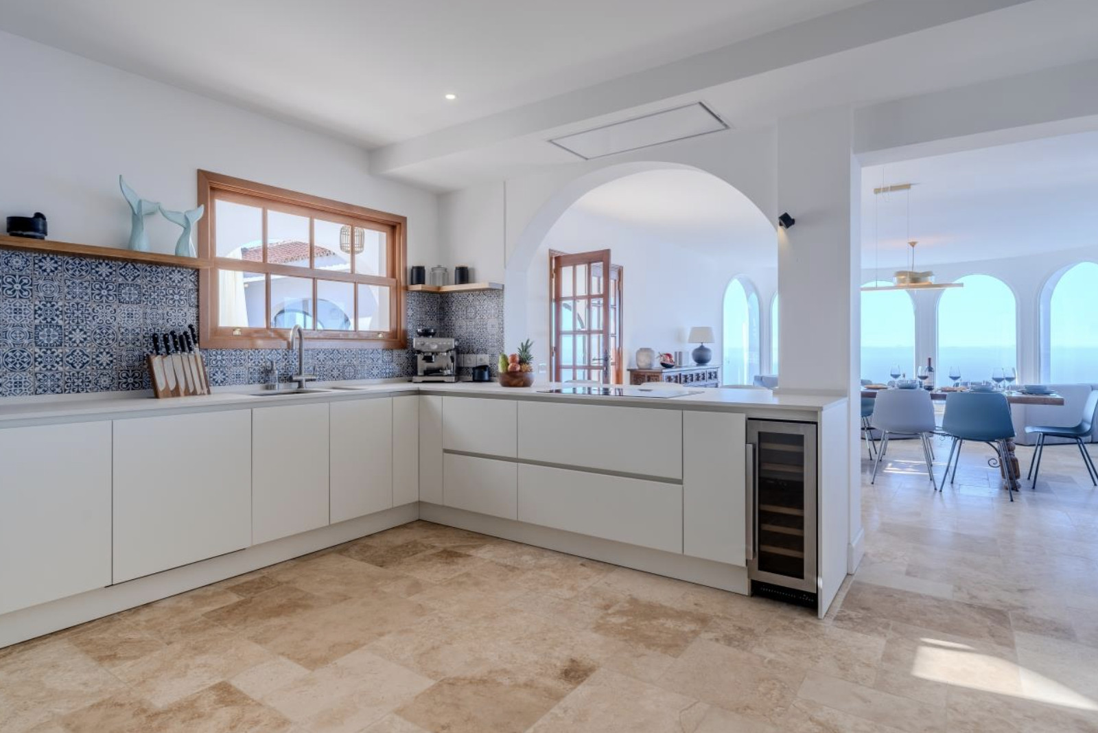 The villa is organized into two wings, connected by a charming central courtyard that invites relaxation or celebration under the sun. In the main wing are the kitchen and living-dining room, both designed to maximize natural light and panoramic sea views.