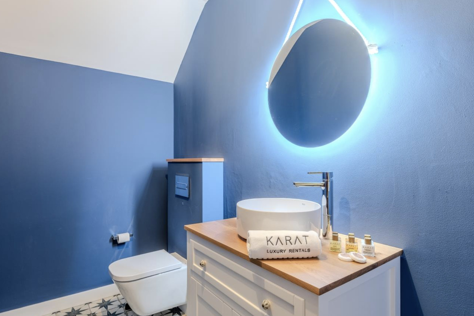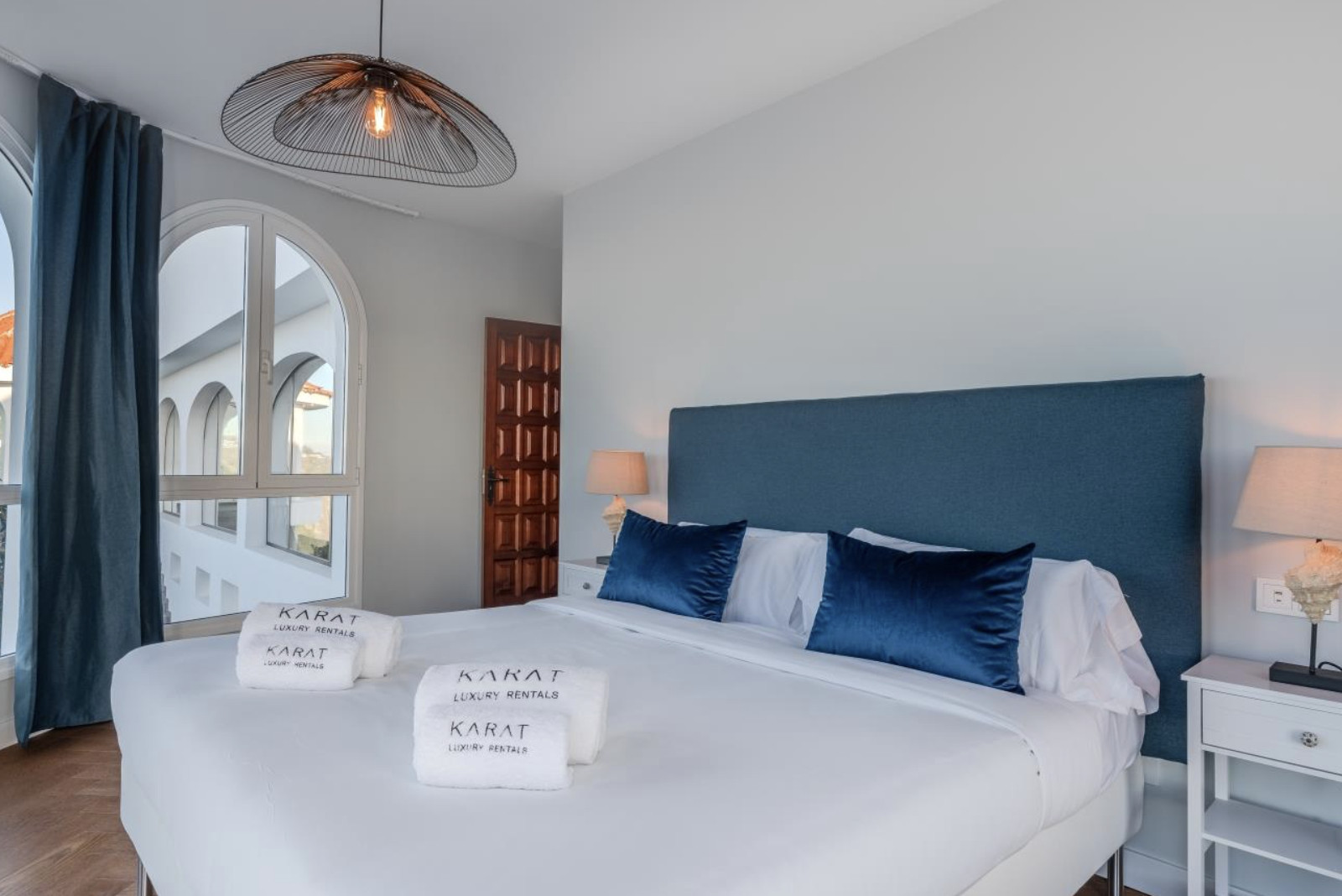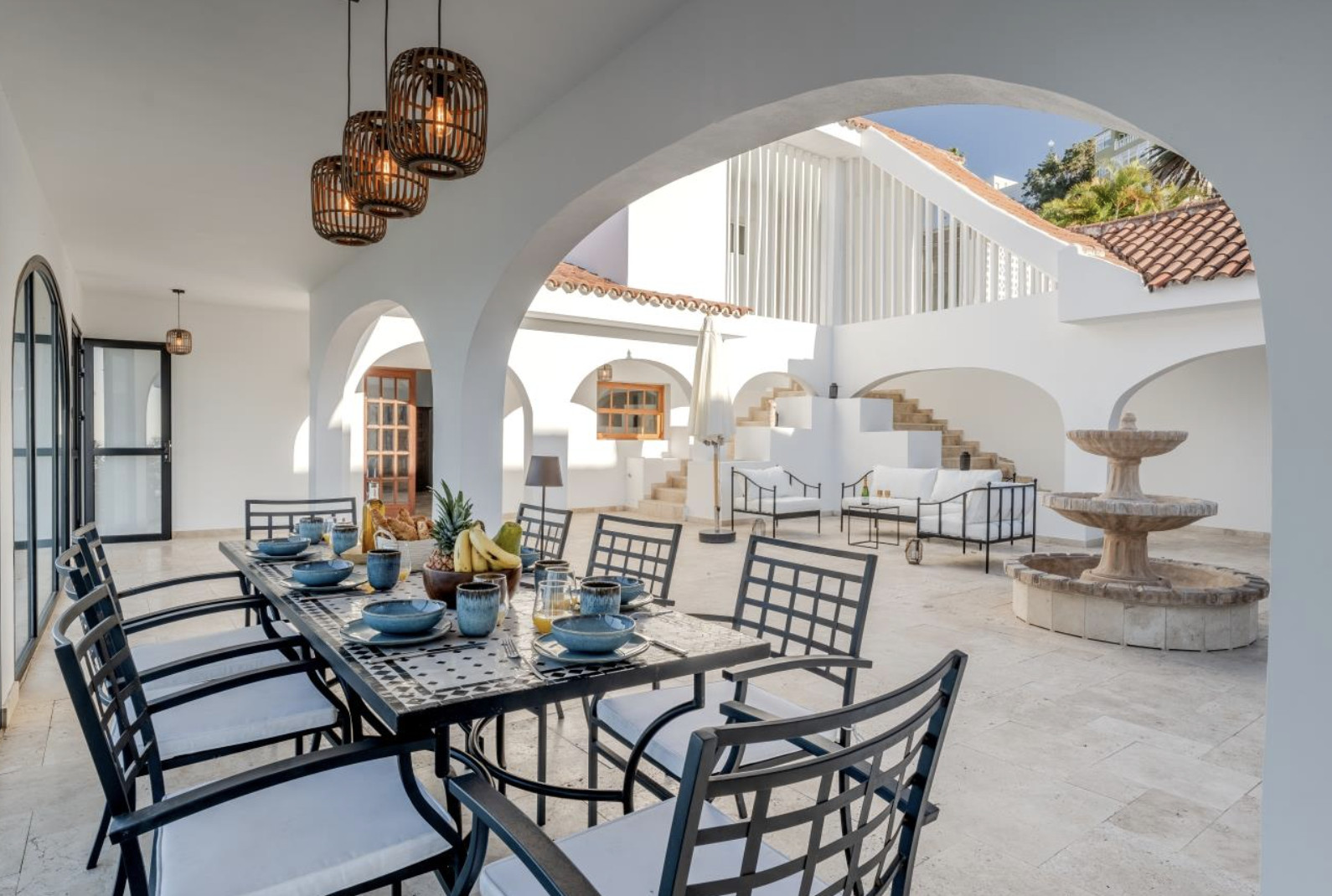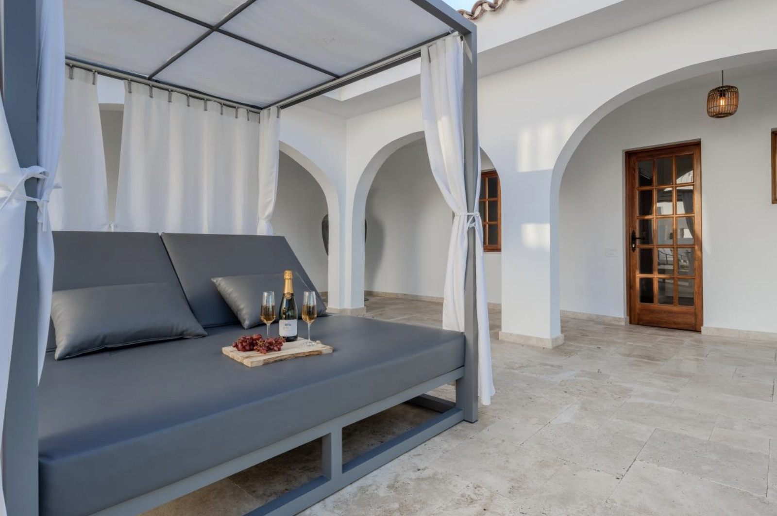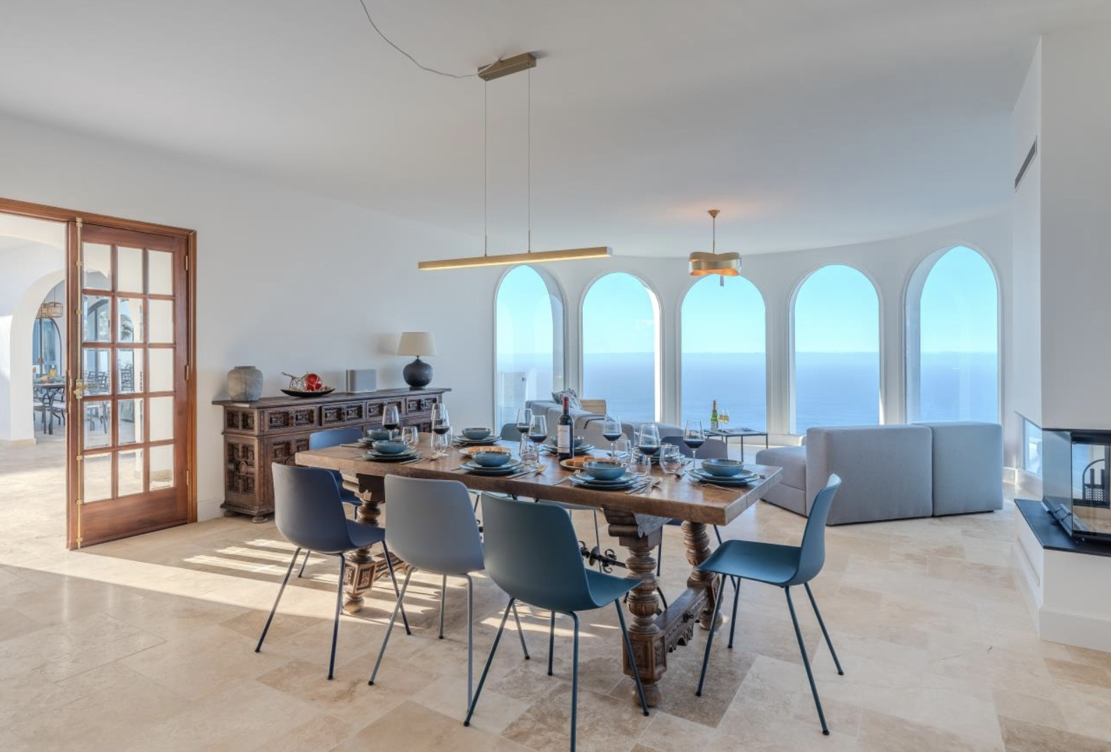 The villa is organized into two wings, connected by a charming central courtyard that invites relaxation or celebration under the sun. In the main wing are the kitchen and living-dining room, both designed to maximize natural light and panoramic sea views.