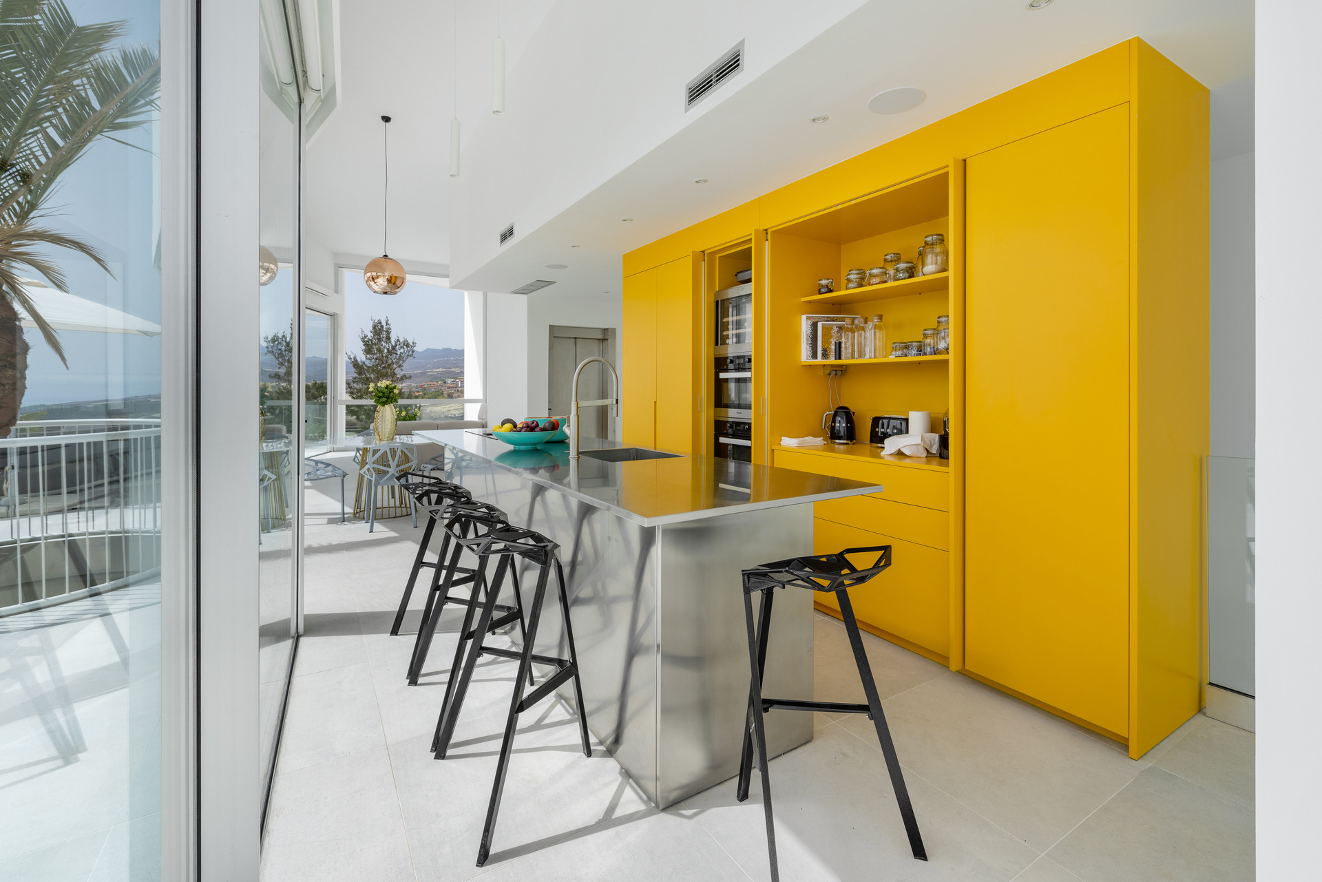 From the elegant entrance hall, you can access the upper floor via a staircase or a convenient lift. On the upper floor, you will find a spacious living room with a separate dining room, creating a sophisticated and cosy atmosphere. The fully equipped kitchen has an outdoor dining area that allows you to enjoy your meals al fresco while admiring the panoramic sea view.