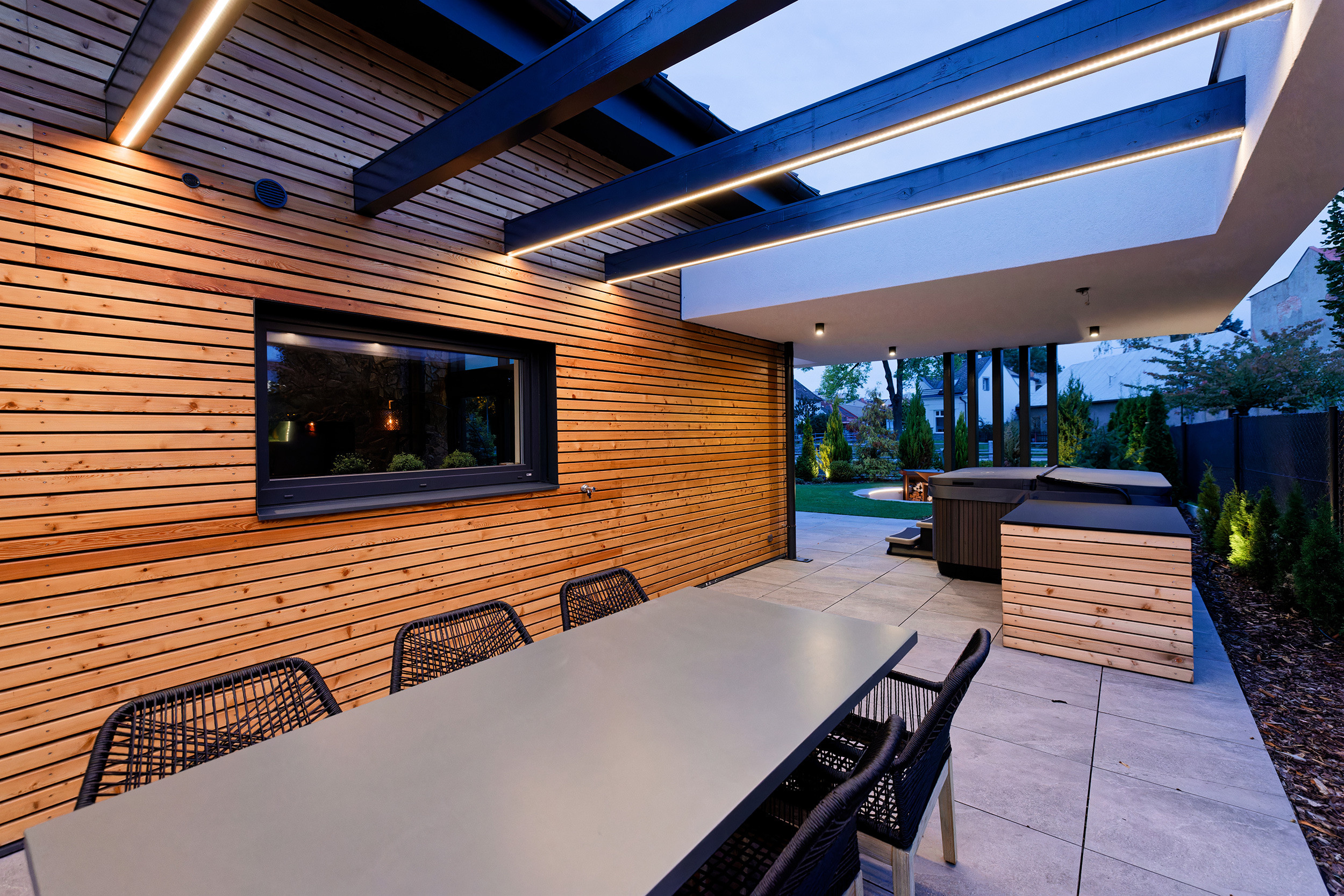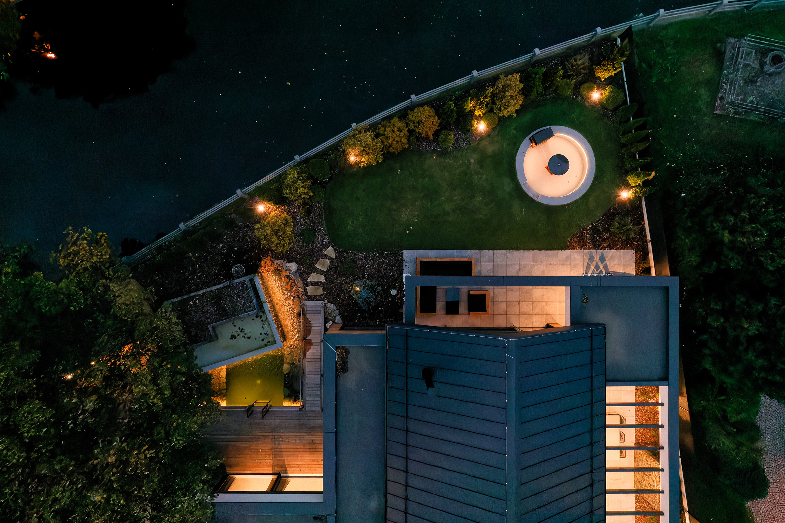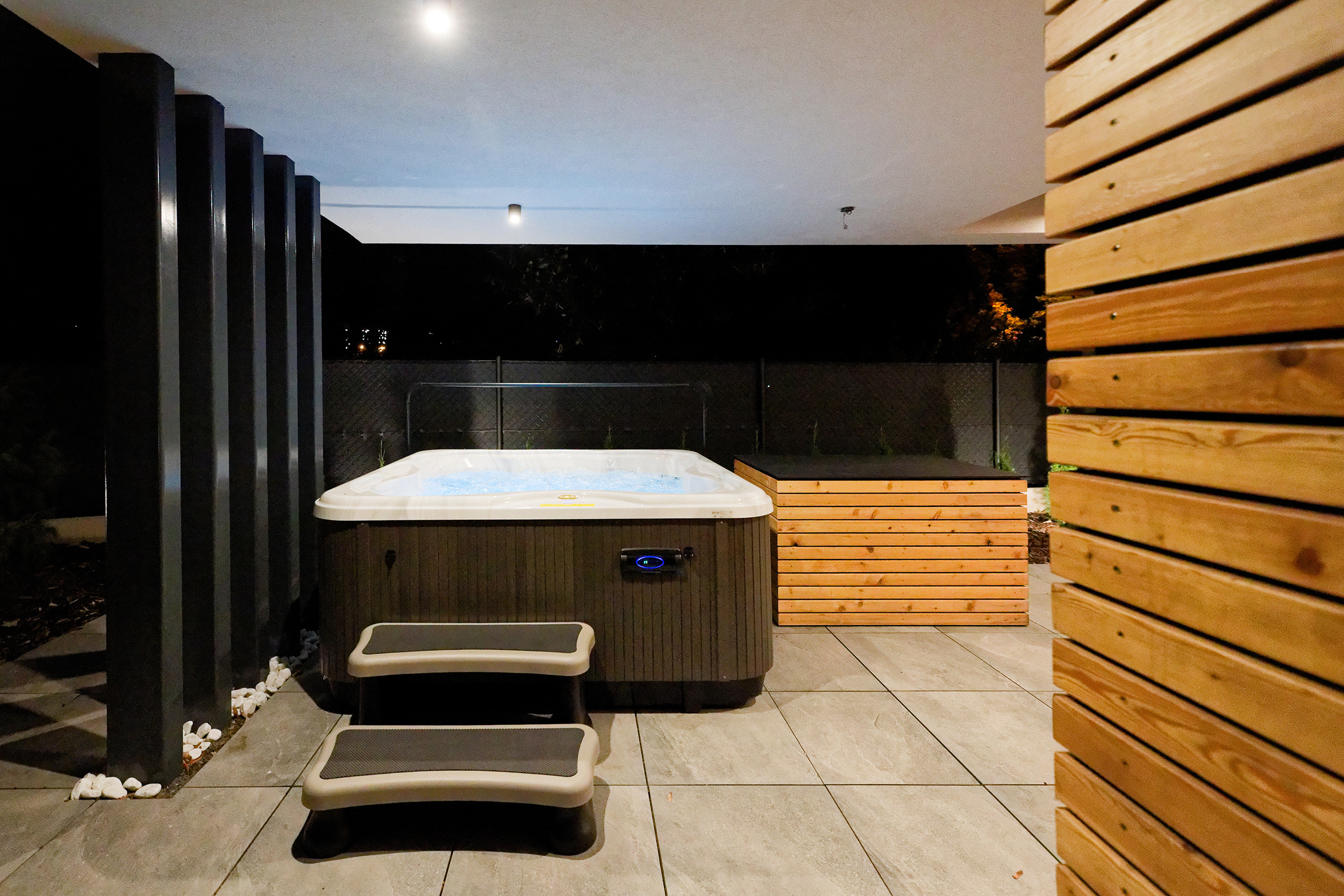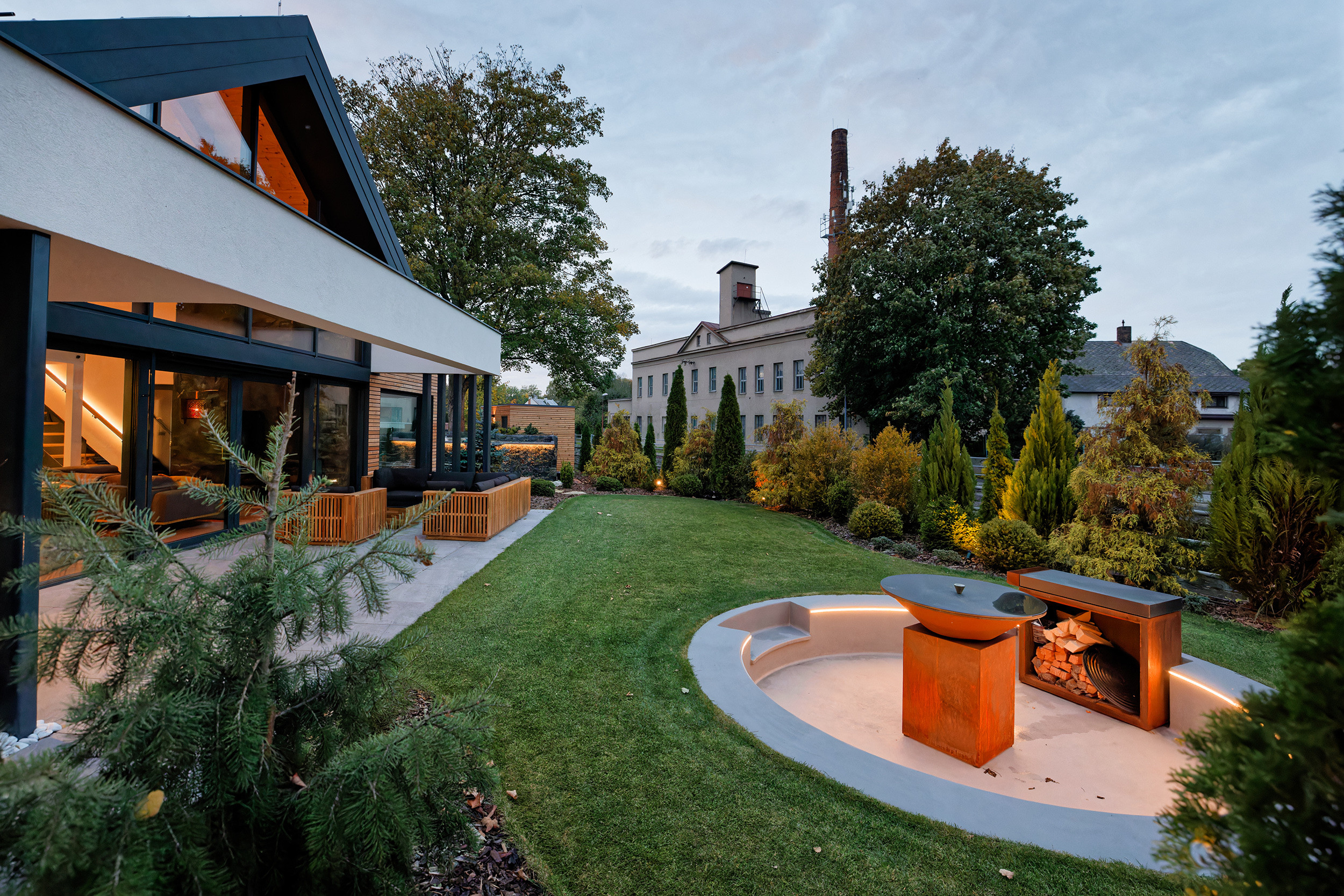 The spacious 630-square-meter garden offers plenty of privacy and comfort. Enjoy your morning coffee on the luxurious lounge set or host a cozy dinner at the large outdoor dining table. The inviting Ofyr fireplace is perfect for unwinding with a glass of wine while watching the flickering flames. For active guests, a separate storage room for bicycles and skis makes it easy to head out for an adventure in nature, whether in summer or winter.