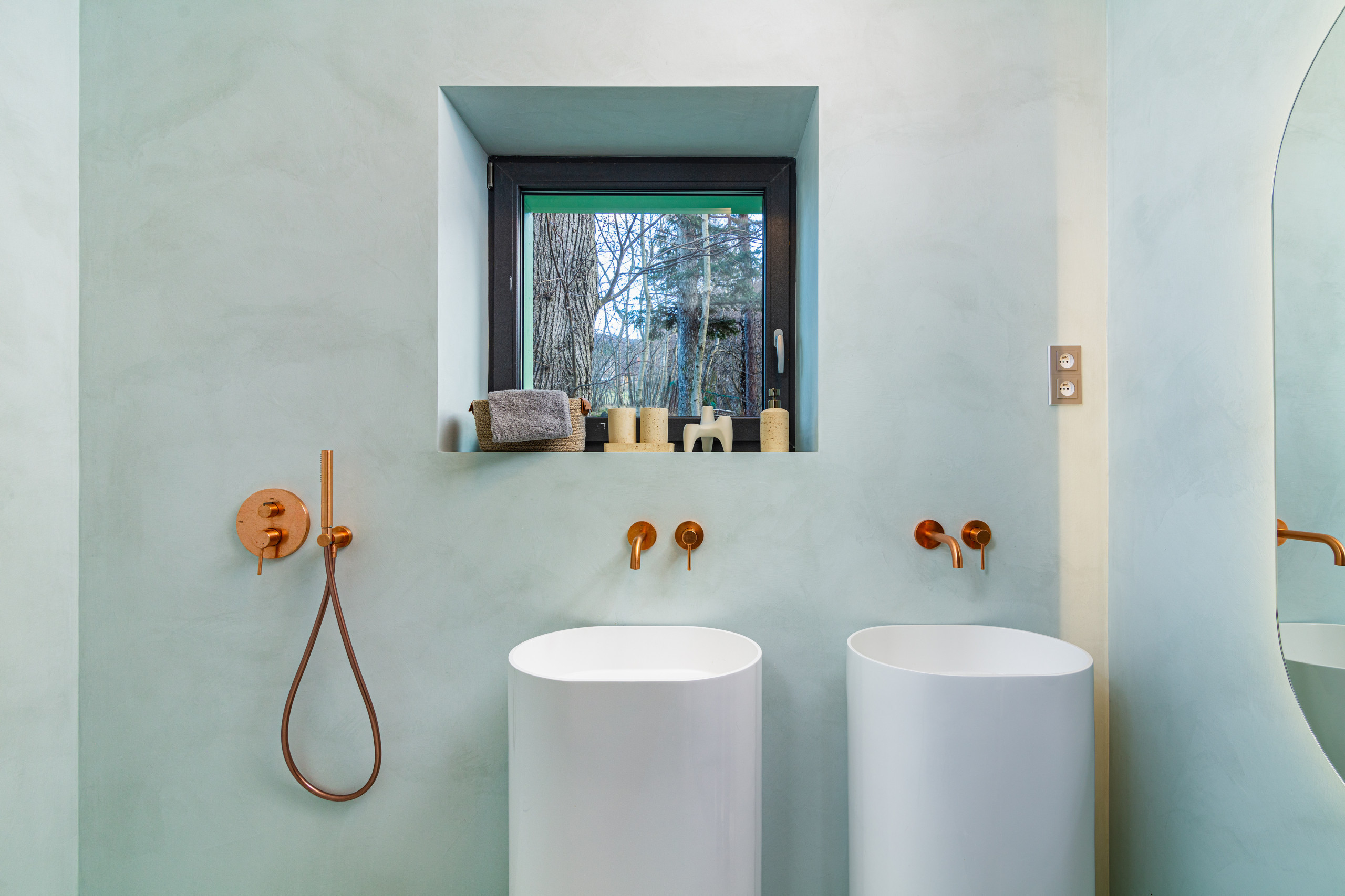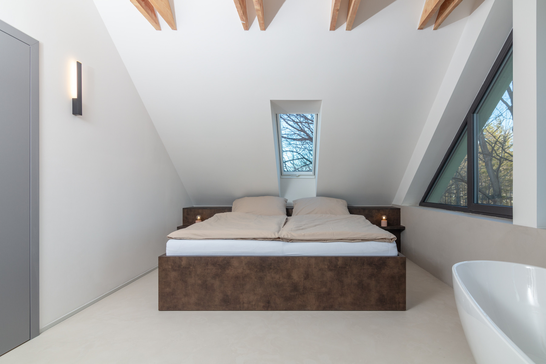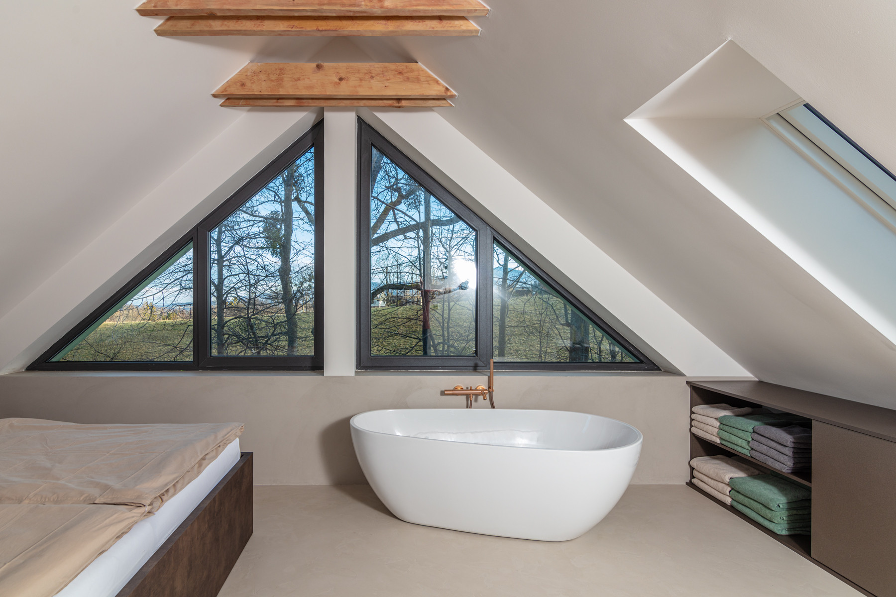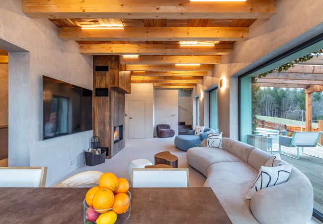 The interior of the house is stylishly decorated in earthy tones, creating a warm and inviting atmosphere that perfectly blends with the surrounding nature. The house accommodates up to 8 people and features 3 comfortable bedrooms. The master bedroom has a large double bed, stunning views of the surrounding landscape, and a freestanding bathtub for extra relaxation. The other two bedrooms are spacious and offer plenty of comfort for the whole family.