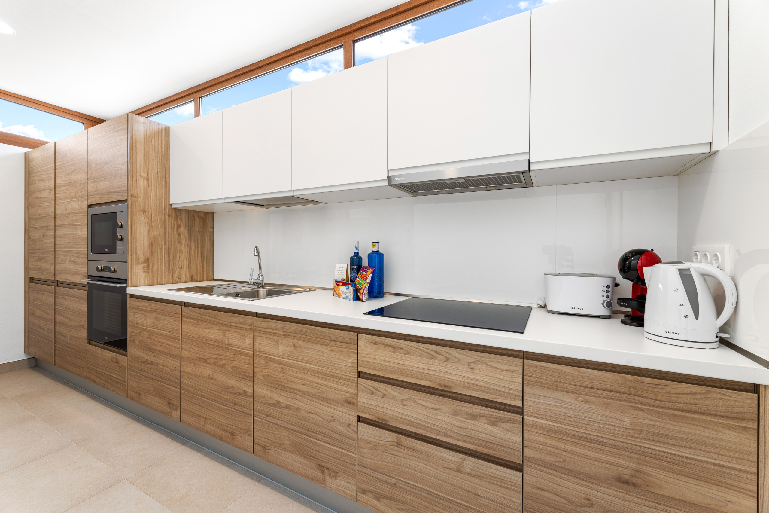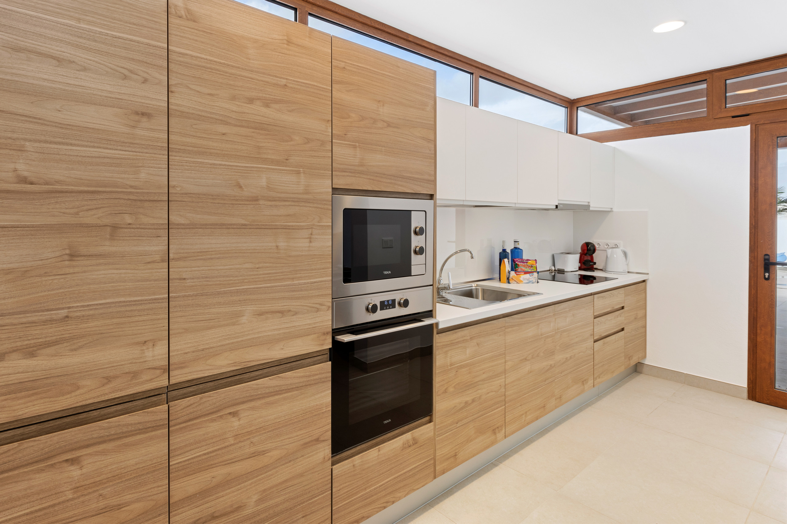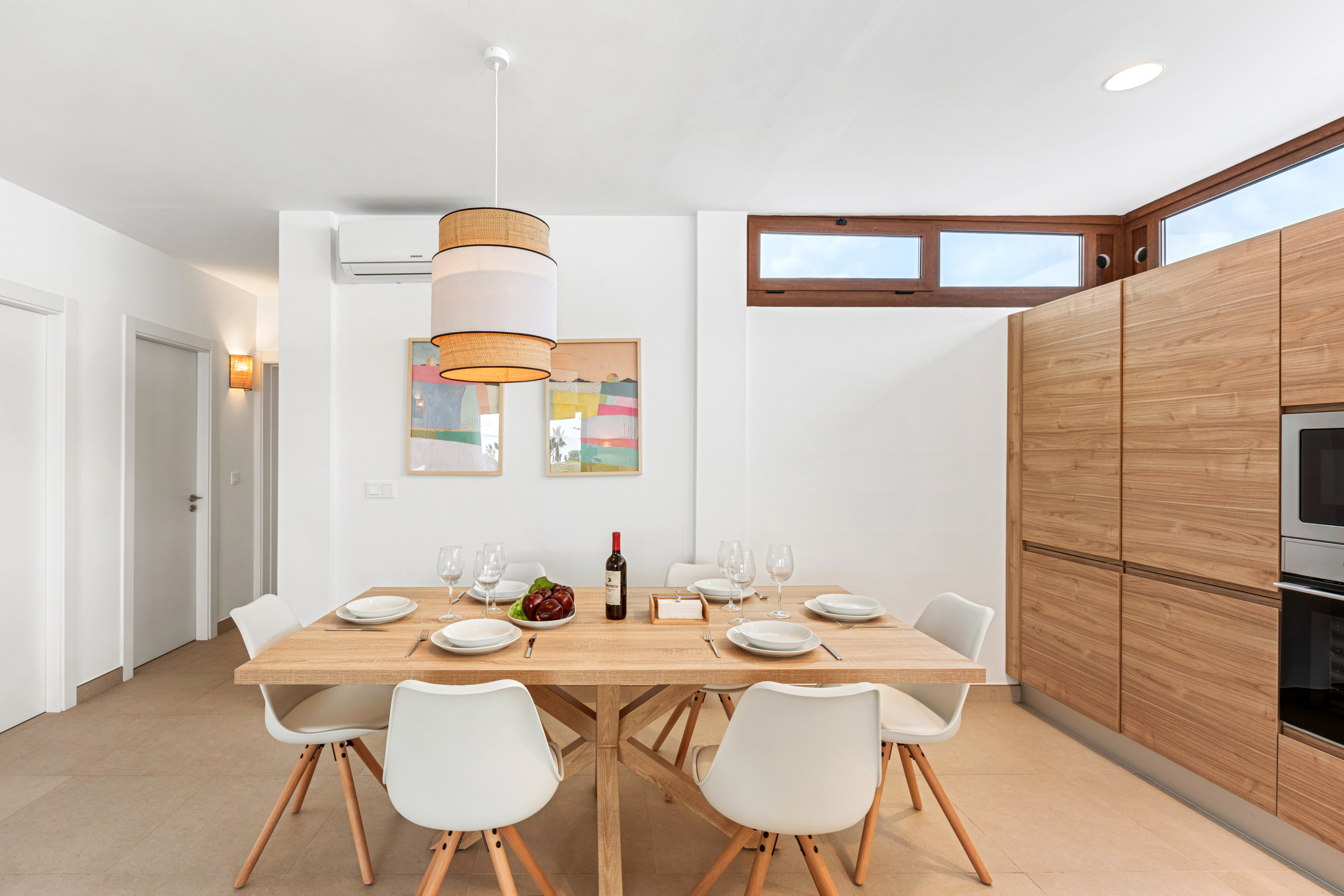 The open-plan kitchen is fully equipped with state-of-the-art appliances, including a fridge, freezer, washing machine, dishwasher, oven, microwave, coffee maker and everything you need to prepare delicious meals.