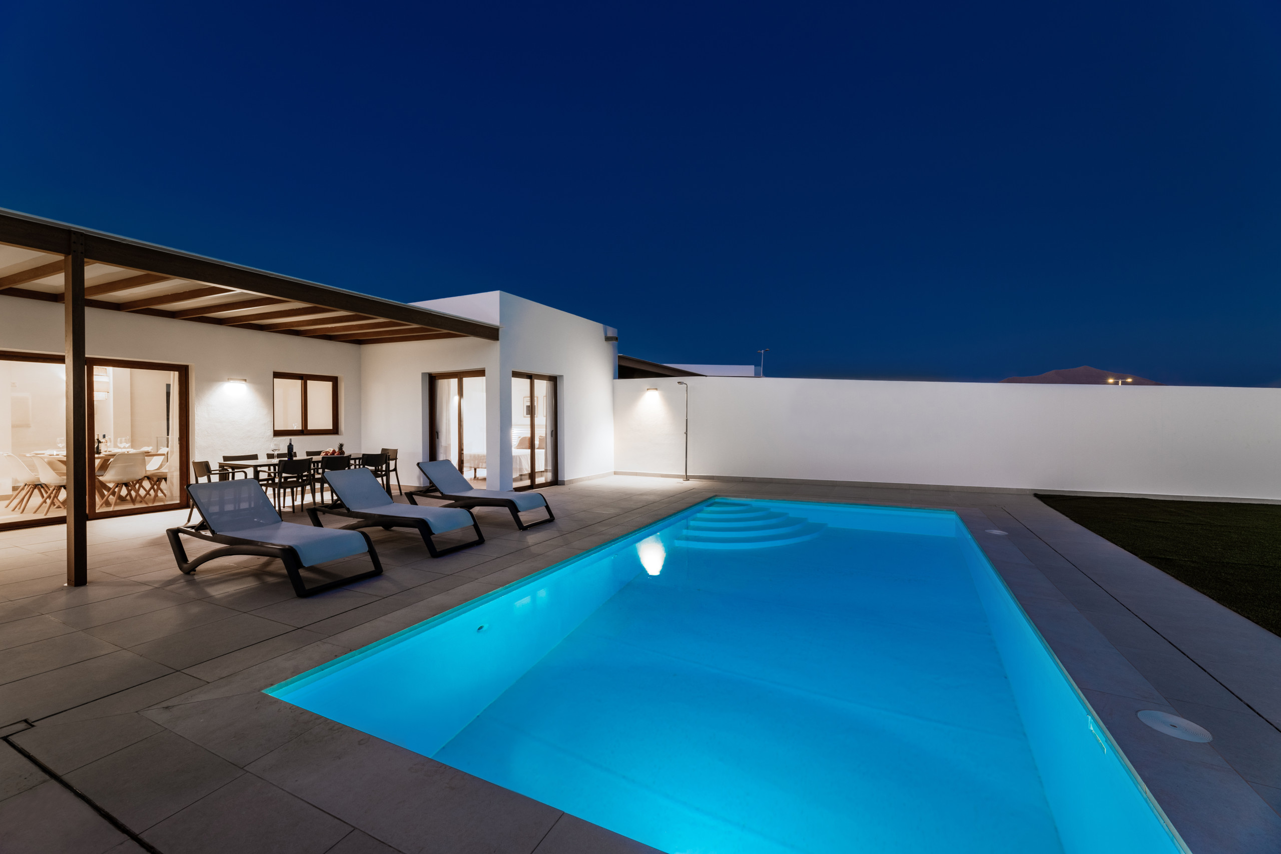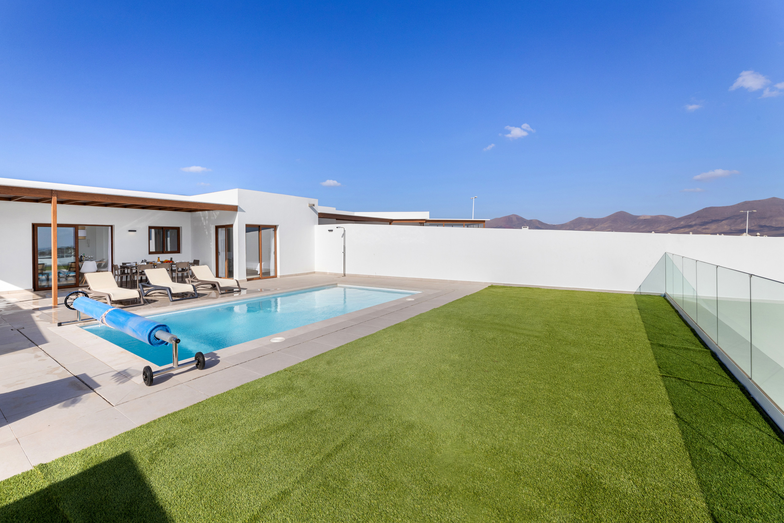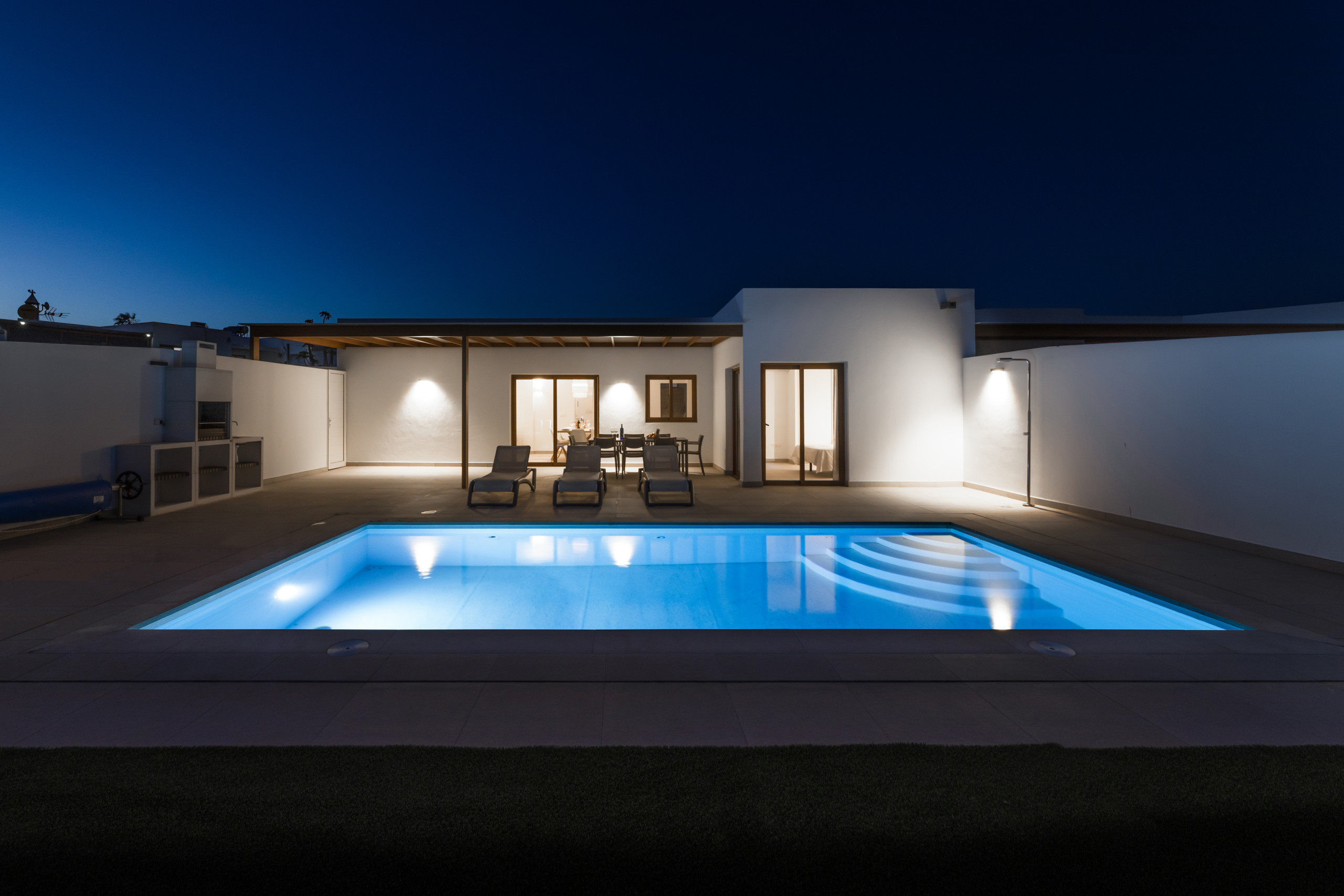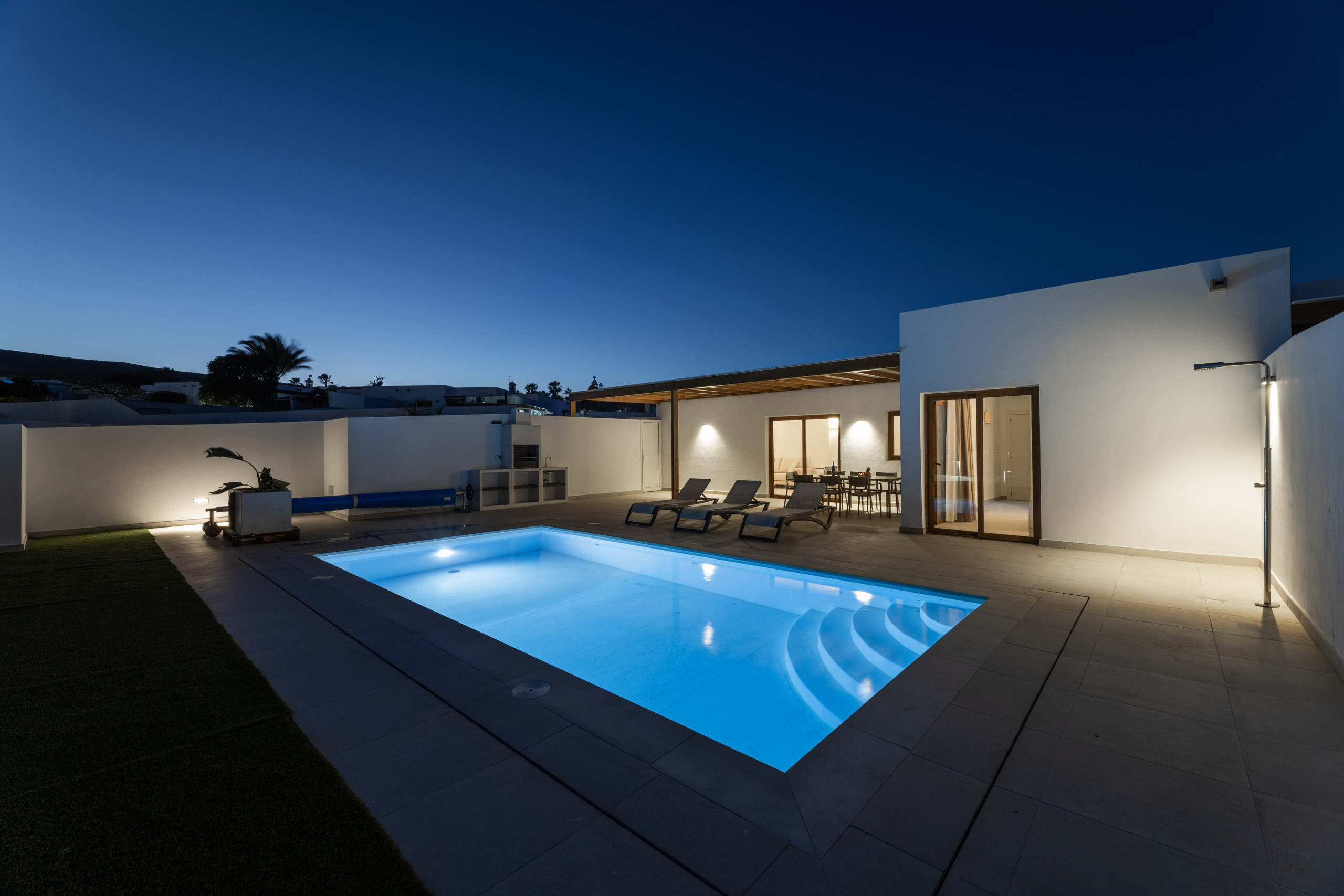 And what can be said about the heated private pool... Immerse yourself in its crystal-clear waters and feel the sun recharging your energy while contemplating the immensity of the ocean. Children can play freely in the garden while you relax on a sunbed with a good book, or perhaps you prefer to enjoy a glass of wine at sunset with views of Lanzarote's magical volcanic landscape.