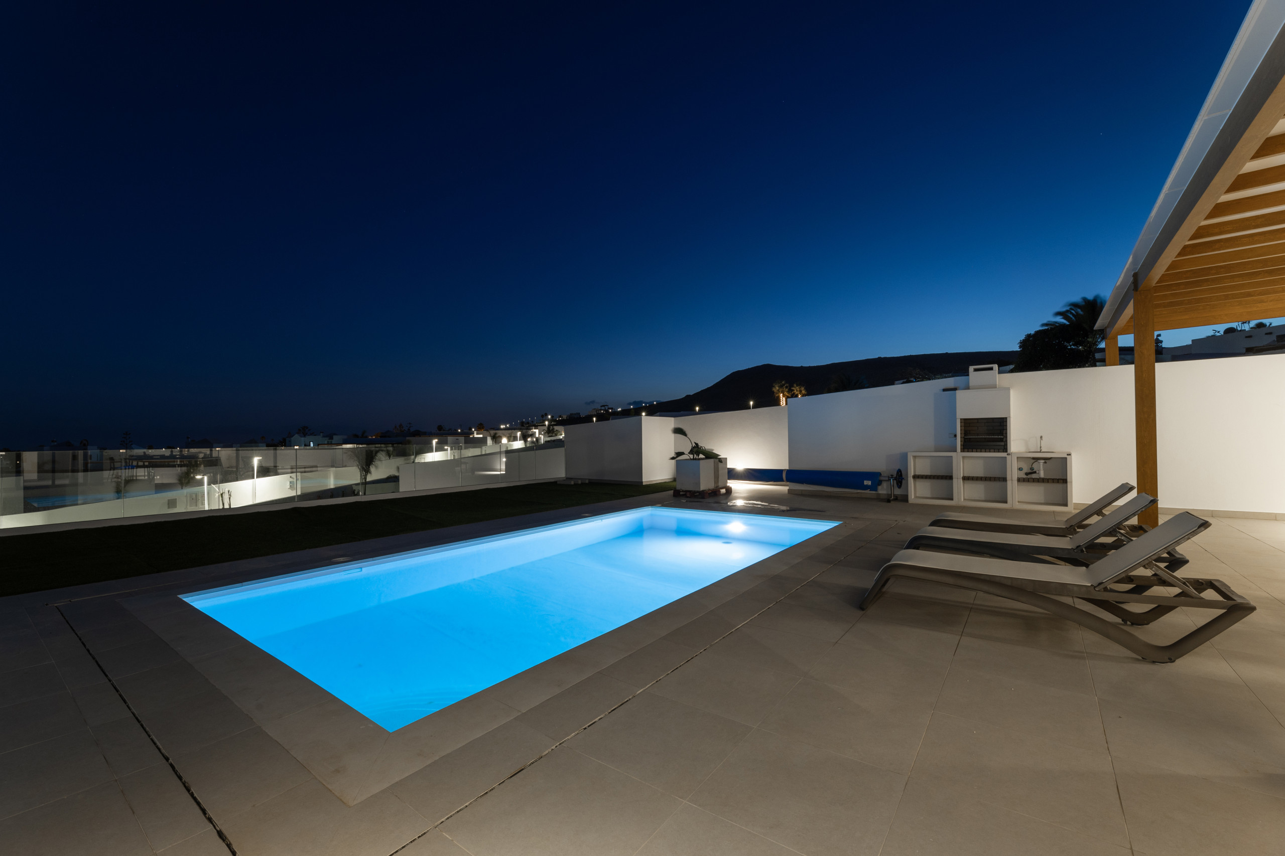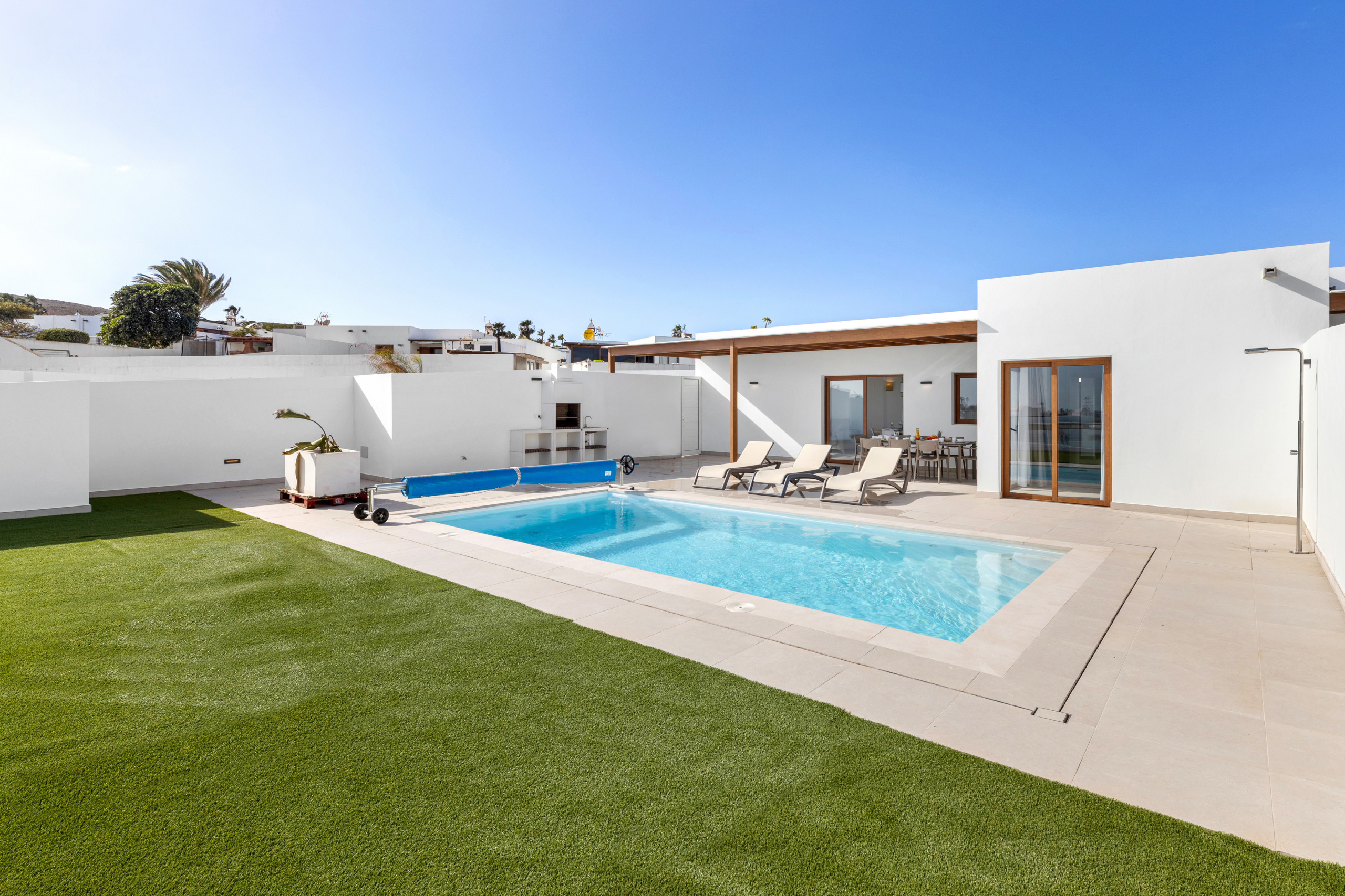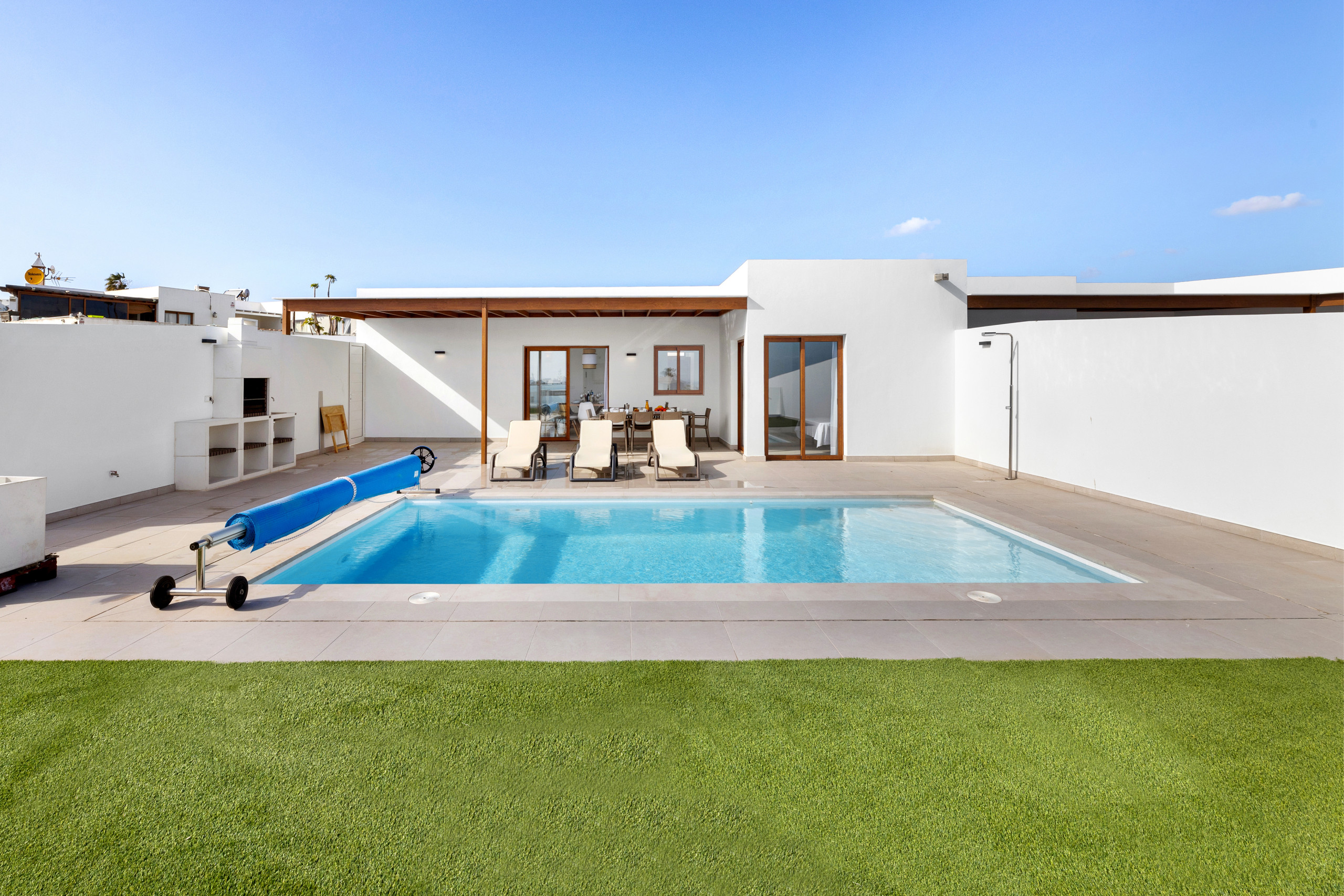 And what can be said about the heated private pool... Immerse yourself in its crystal-clear waters and feel the sun recharging your energy while contemplating the immensity of the ocean. Children can play freely in the garden while you relax on a sunbed with a good book, or perhaps you prefer to enjoy a glass of wine at sunset with views of Lanzarote's magical volcanic landscape.