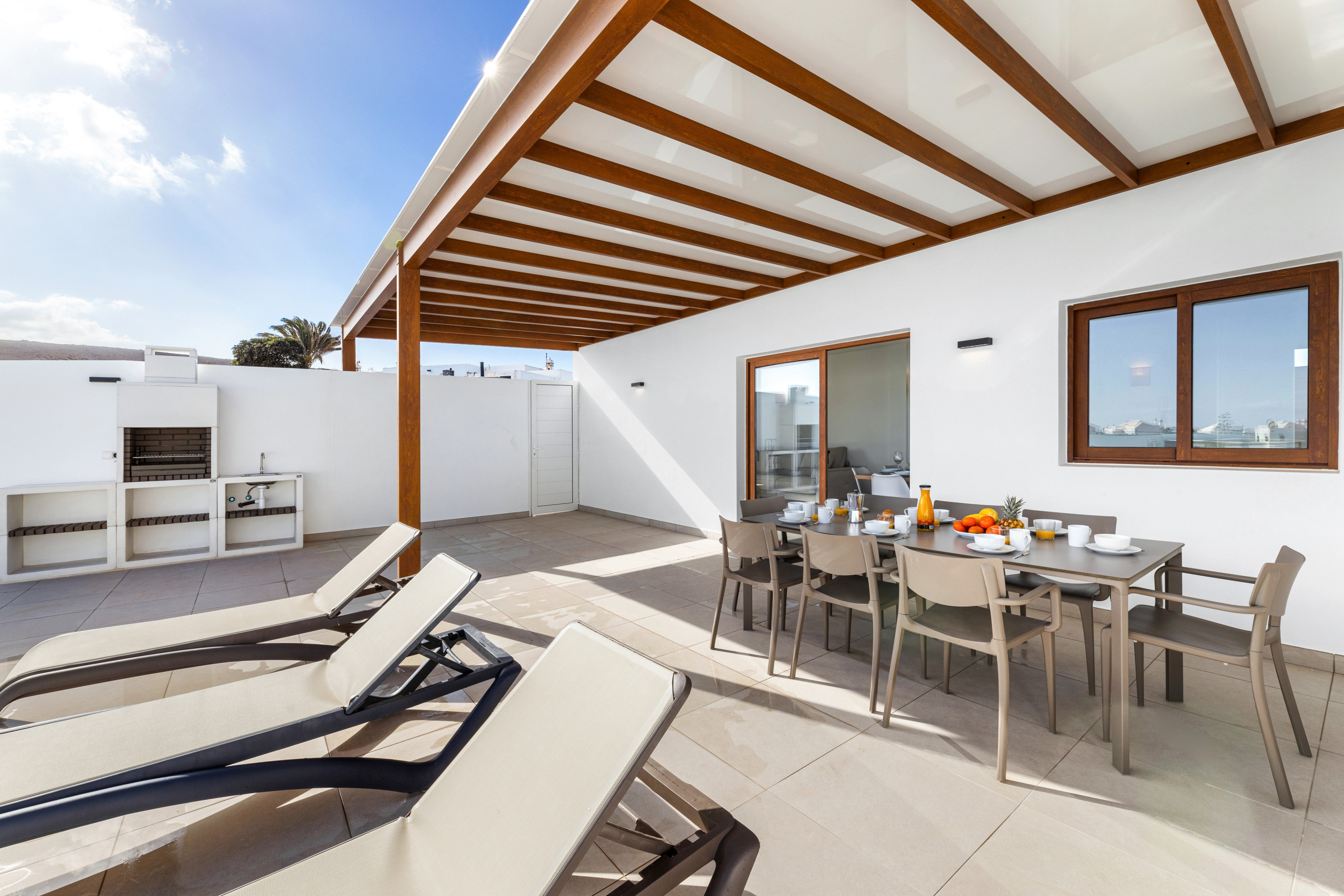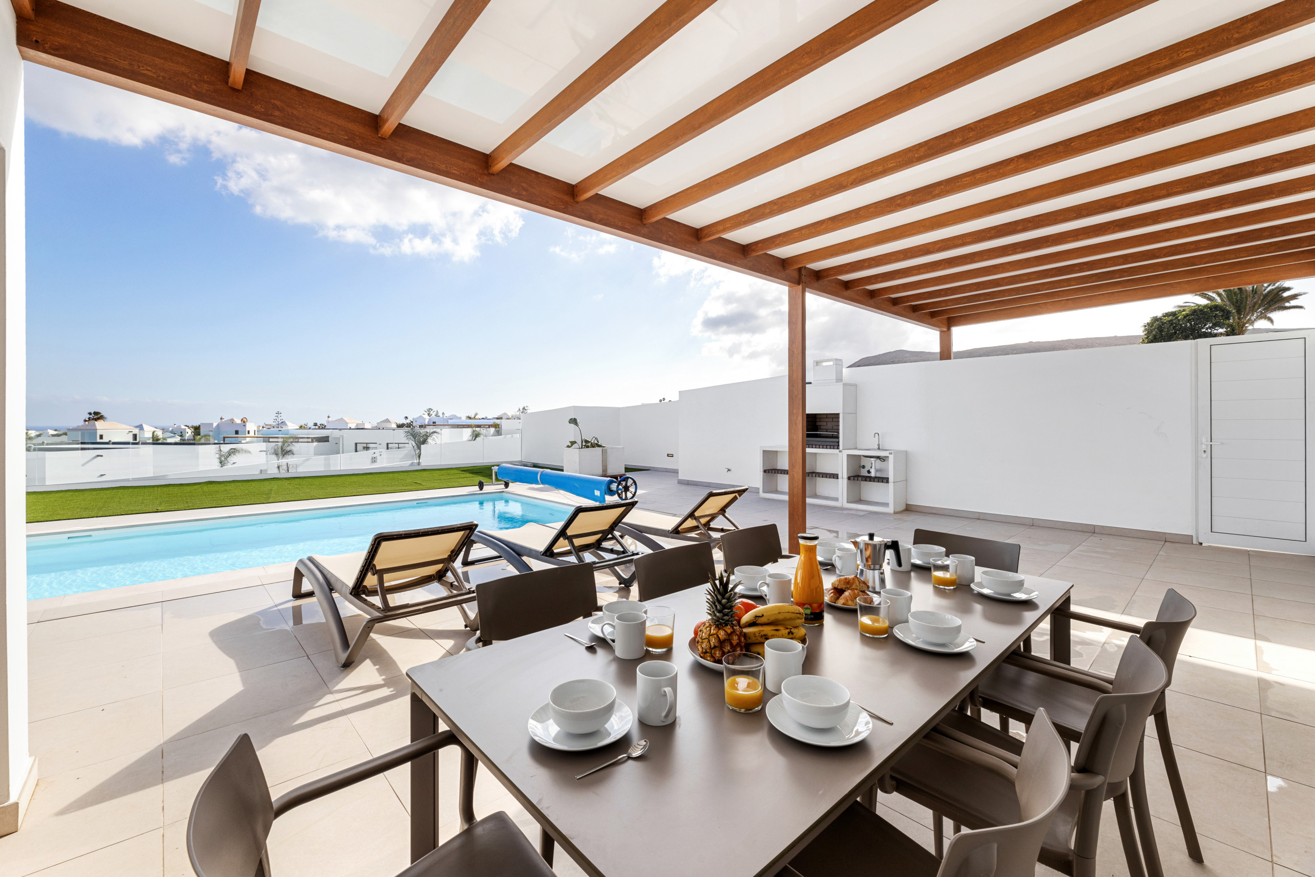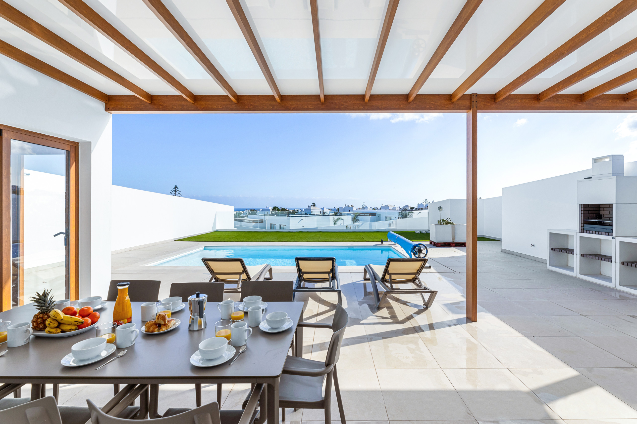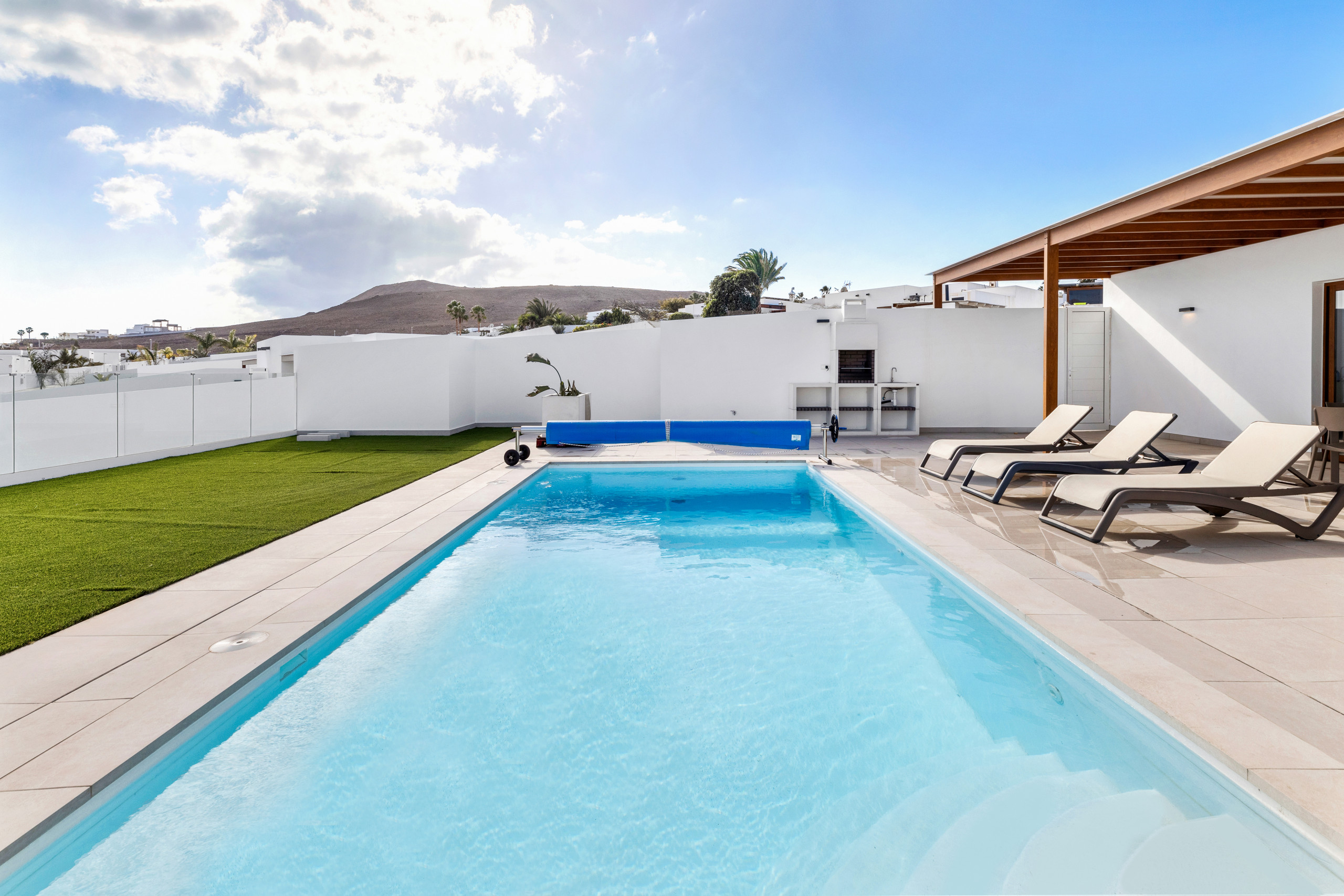 And what can be said about the heated private pool... Immerse yourself in its crystal-clear waters and feel the sun recharging your energy while contemplating the immensity of the ocean. Children can play freely in the garden while you relax on a sunbed with a good book, or perhaps you prefer to enjoy a glass of wine at sunset with views of Lanzarote's magical volcanic landscape.