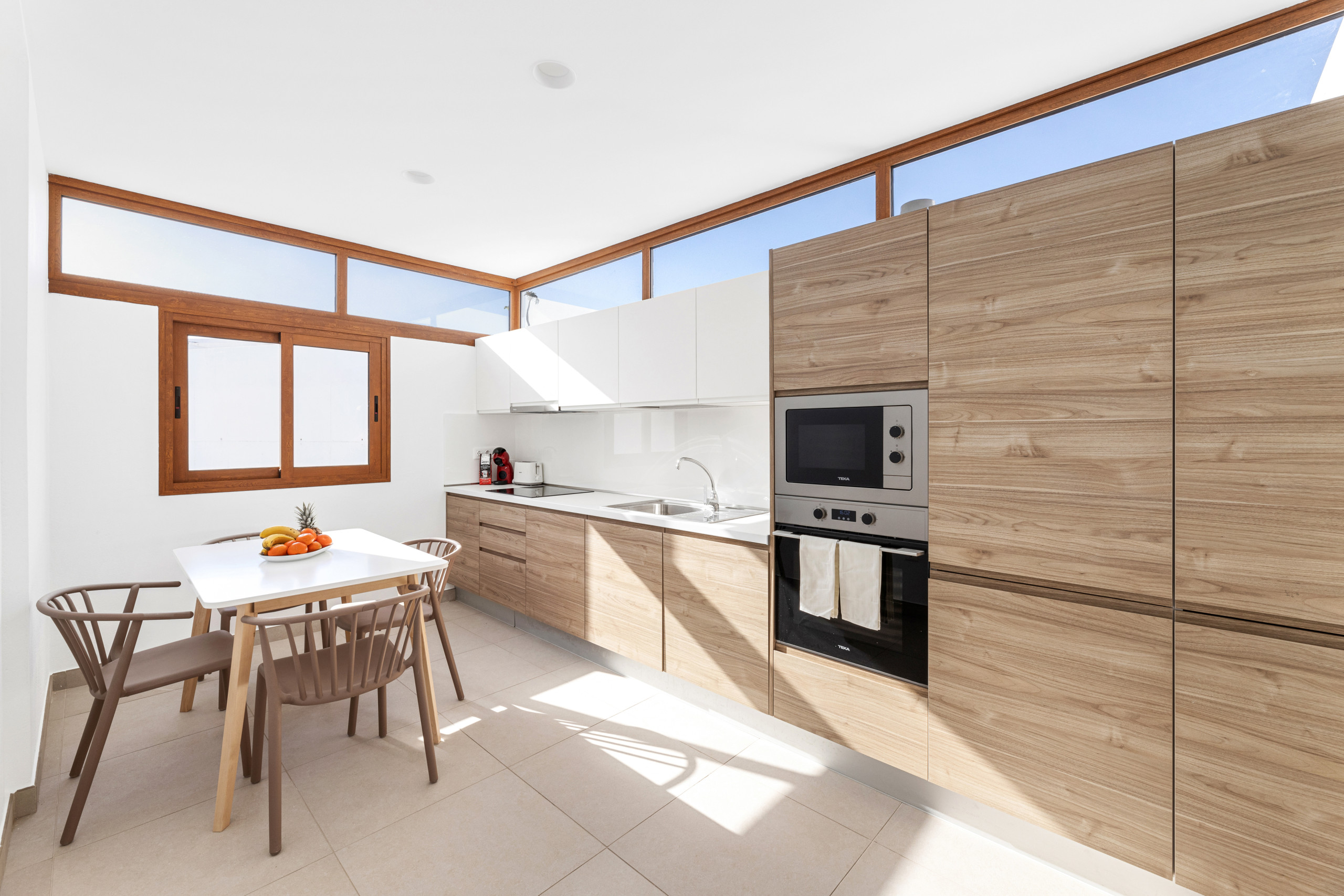 As for the common areas, the open-plan kitchen is fully equipped with appliances such as fridge, freezer, washing machine, dishwasher, oven, microwave, coffee maker and toaster, among others. You can easily prepare your meals and enjoy them in the dining room or on the terrace.