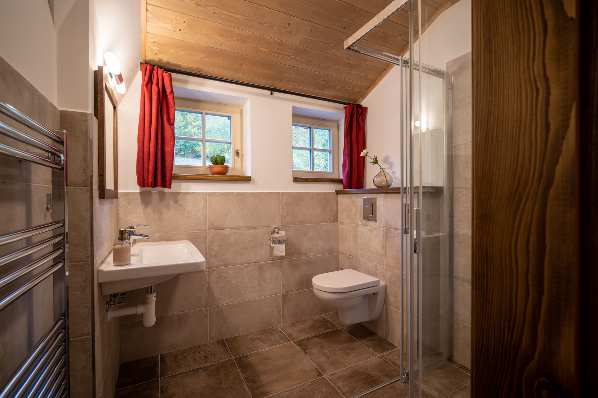 The house features two bathrooms: one with a shower and toilet on the ground floor and one with a bathtub and toilet upstairs.