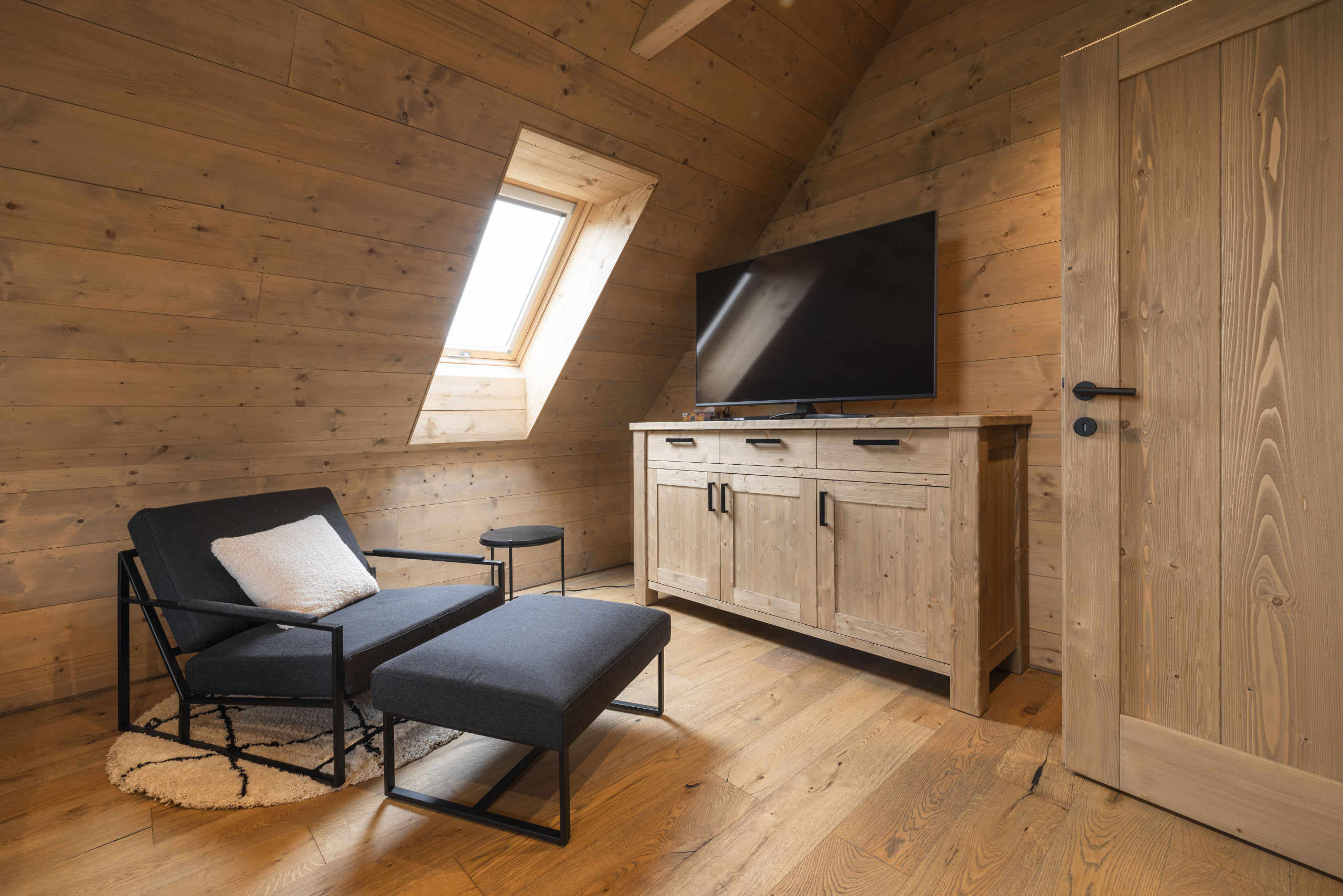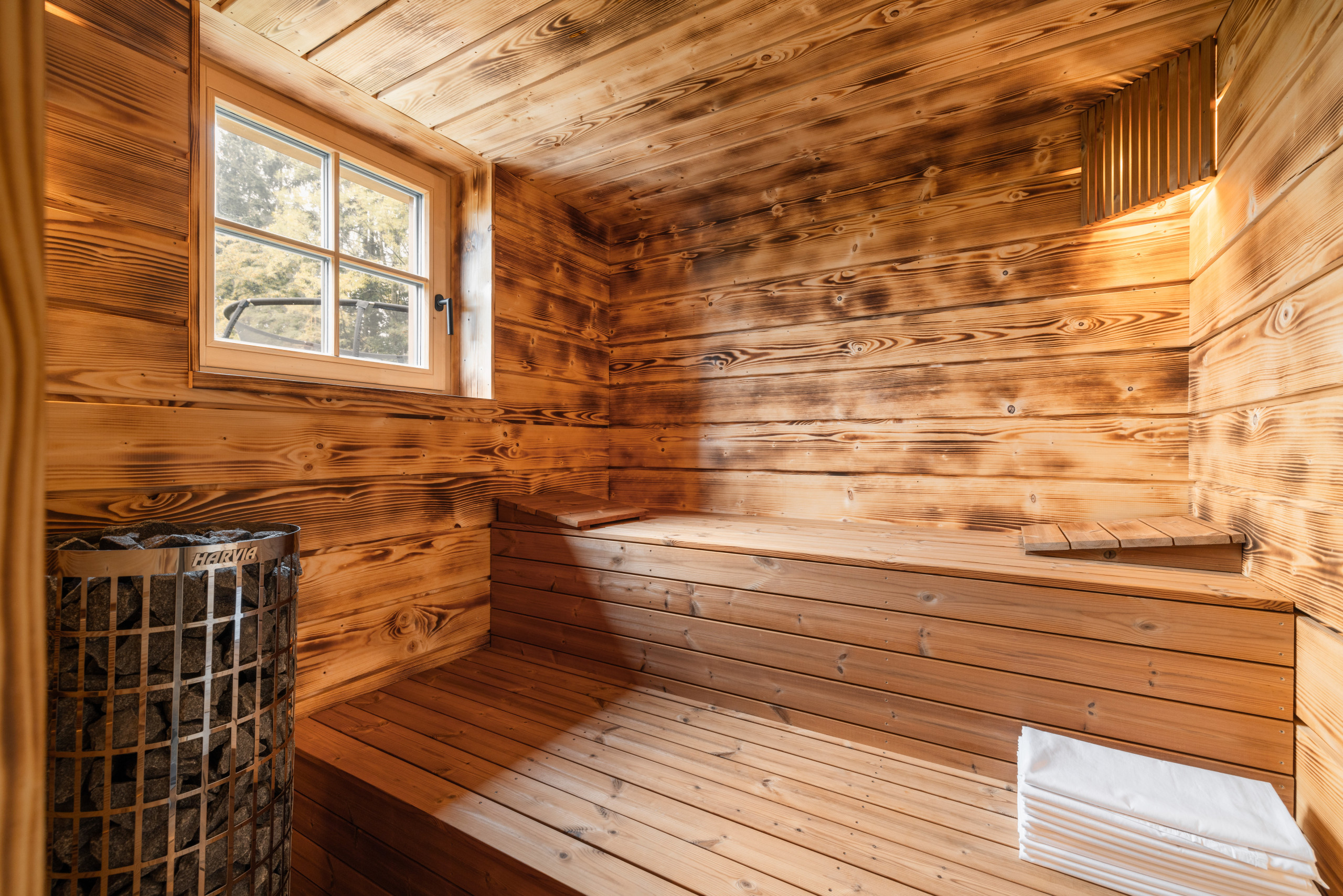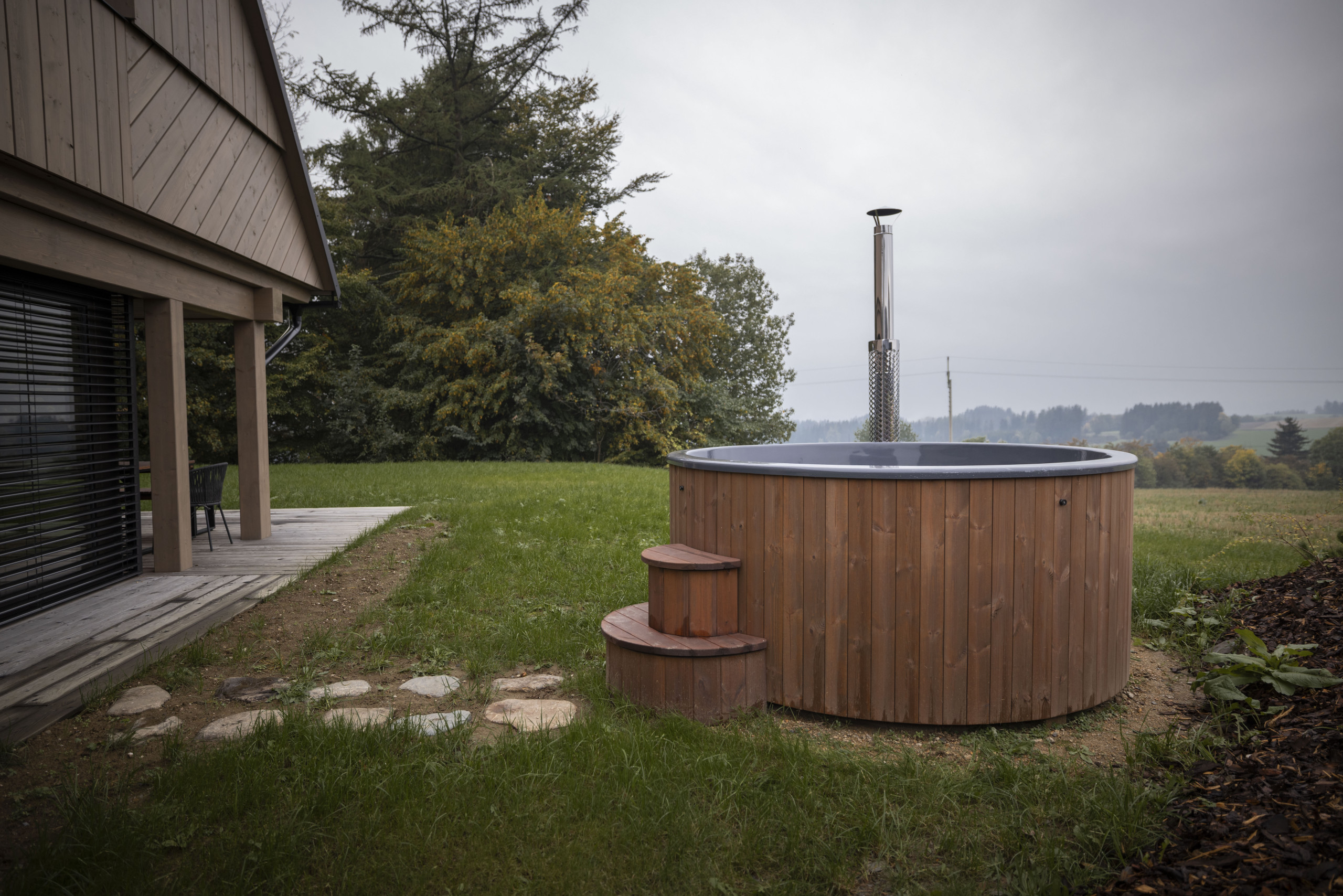 The chalet also offers a fantastic wellness experience. Relax in the sauna or enjoy the warmth of the wood-fired hot tub. Use of both the sauna and the hot tub is free of charge. For the sauna, you only pay for the energy consumed (€0.35/kWh), and for the hot tub, only the briquettes are charged – and only if you use a lot. This way, you can fully enjoy your private wellness moment without any worries.